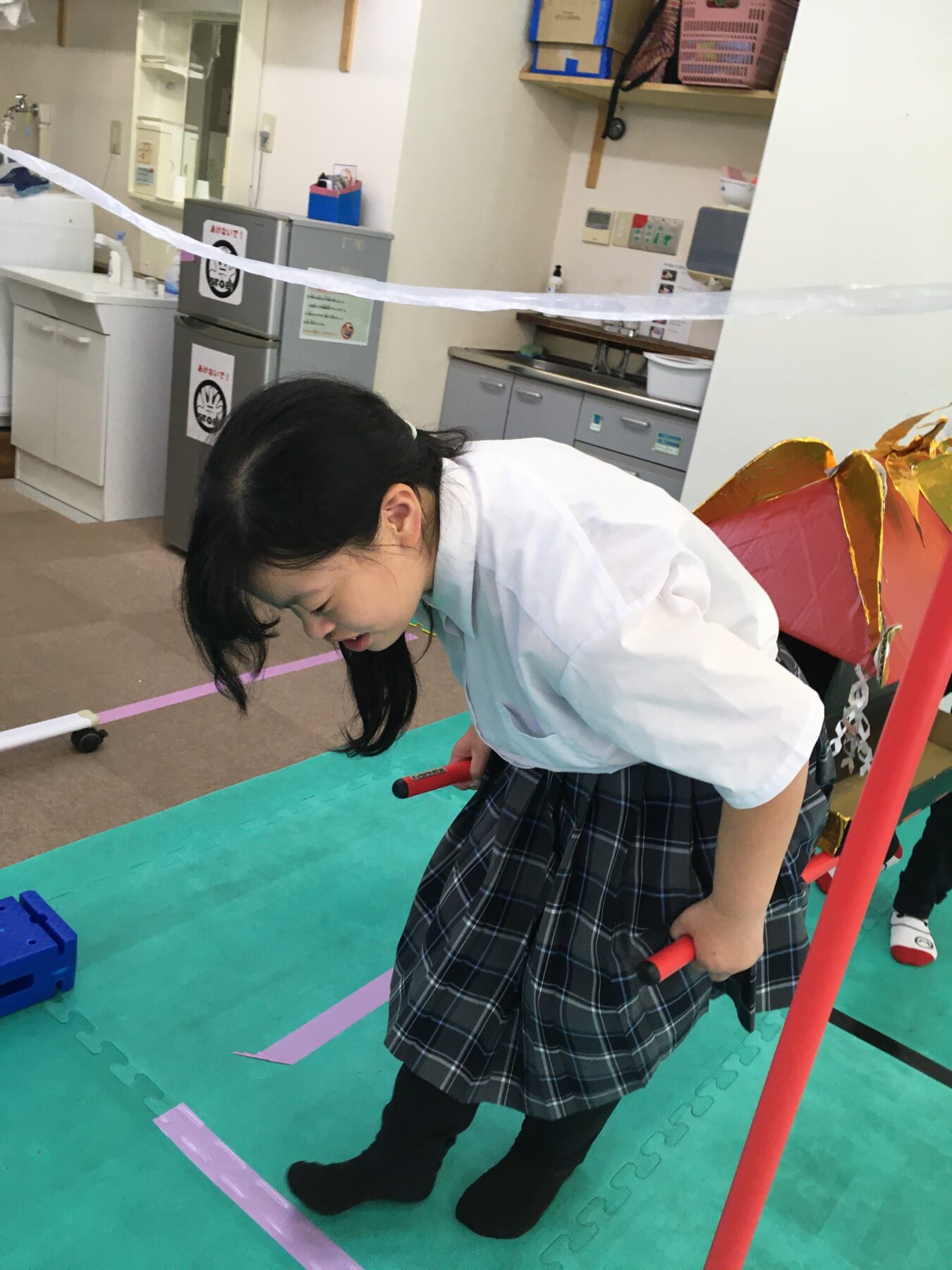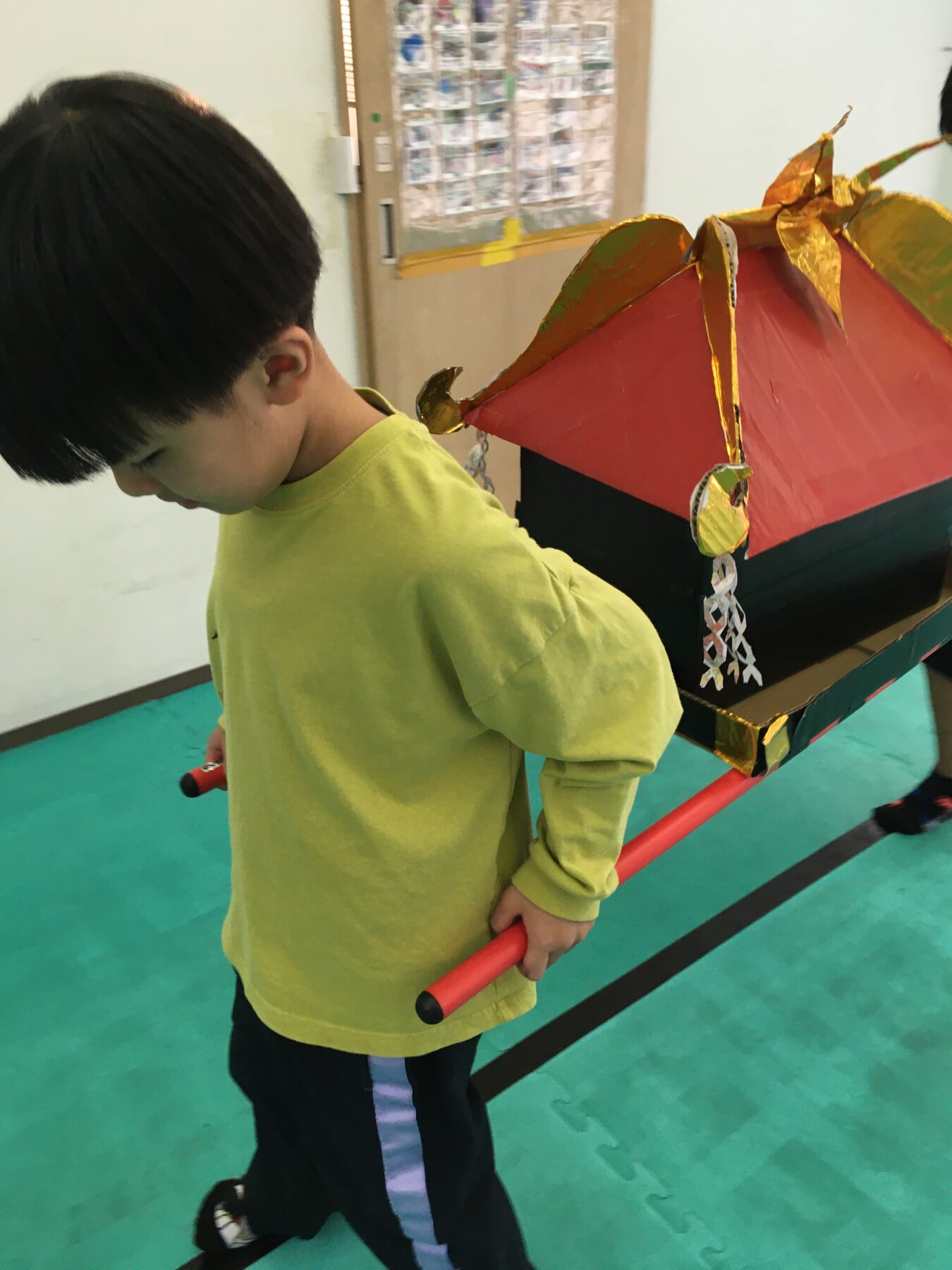 2人1組になって、お神輿を担ぎながら障害物を避けてコースを進む運動活動になります。
