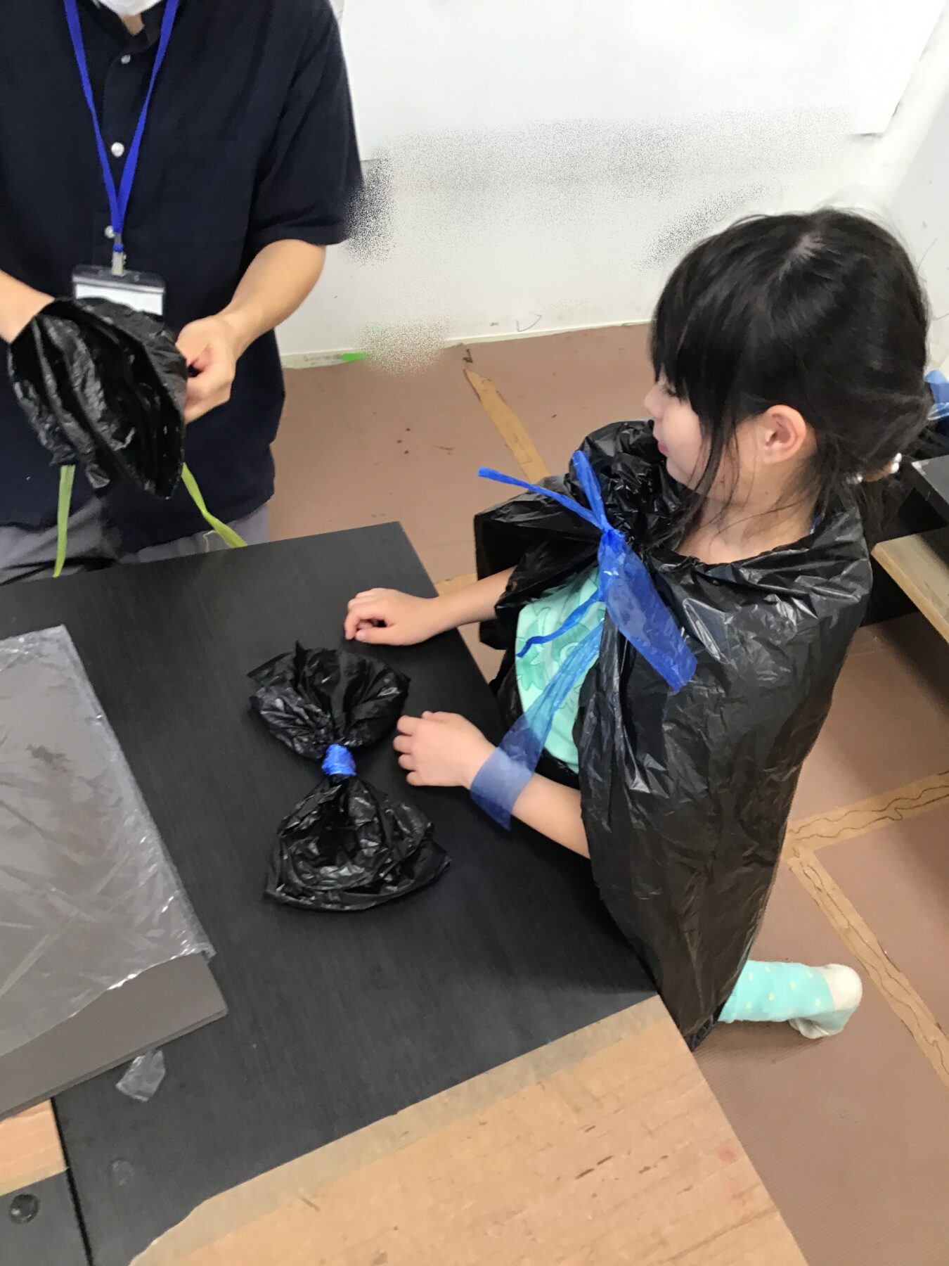 ポリ袋を使ったアイデアを膨らませて、仮装などを作るお友だちもいらっしゃいました👍