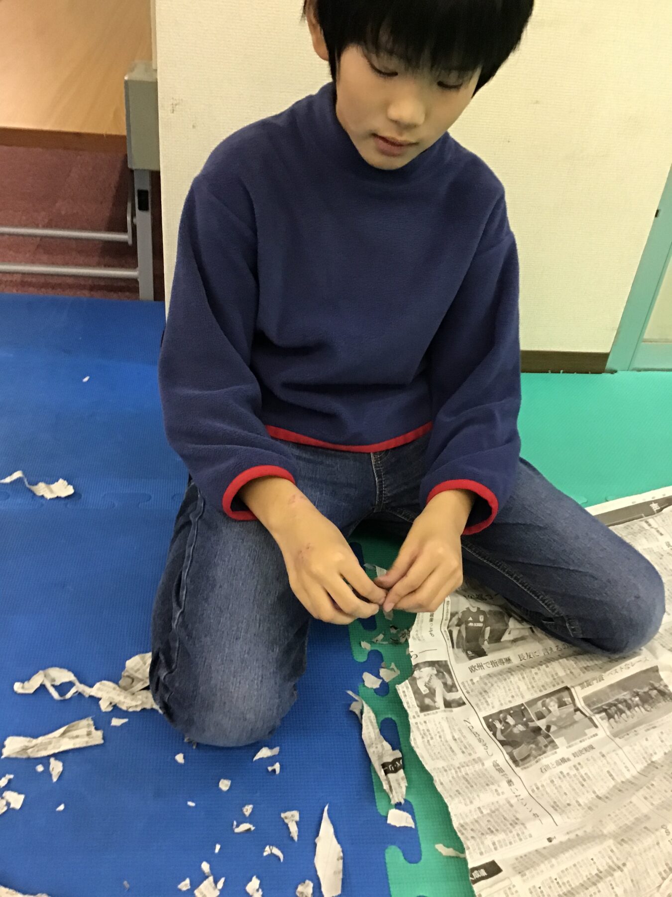 折りたたんだ新聞紙を広げて、次はビリビリに破っていきます。