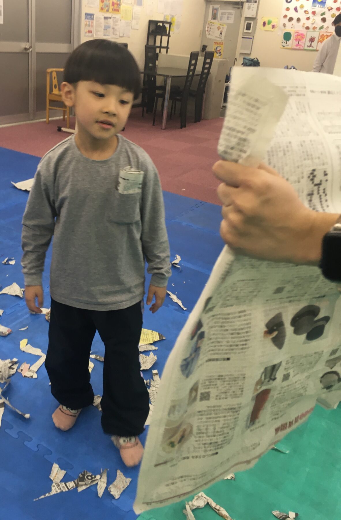 新聞紙の音や感触を体験し五感の発達を促すことを目的に活動しました。