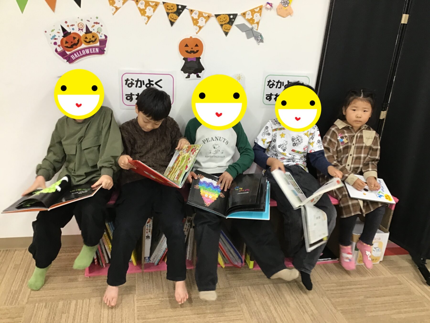 仲良く座って絵本を読んでいるお友だち