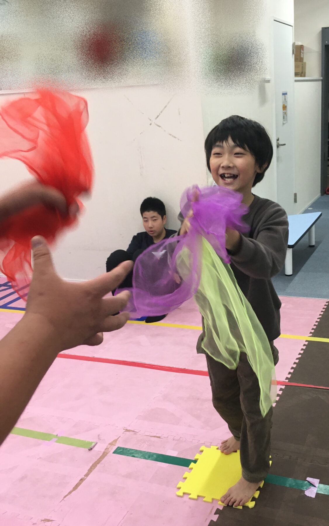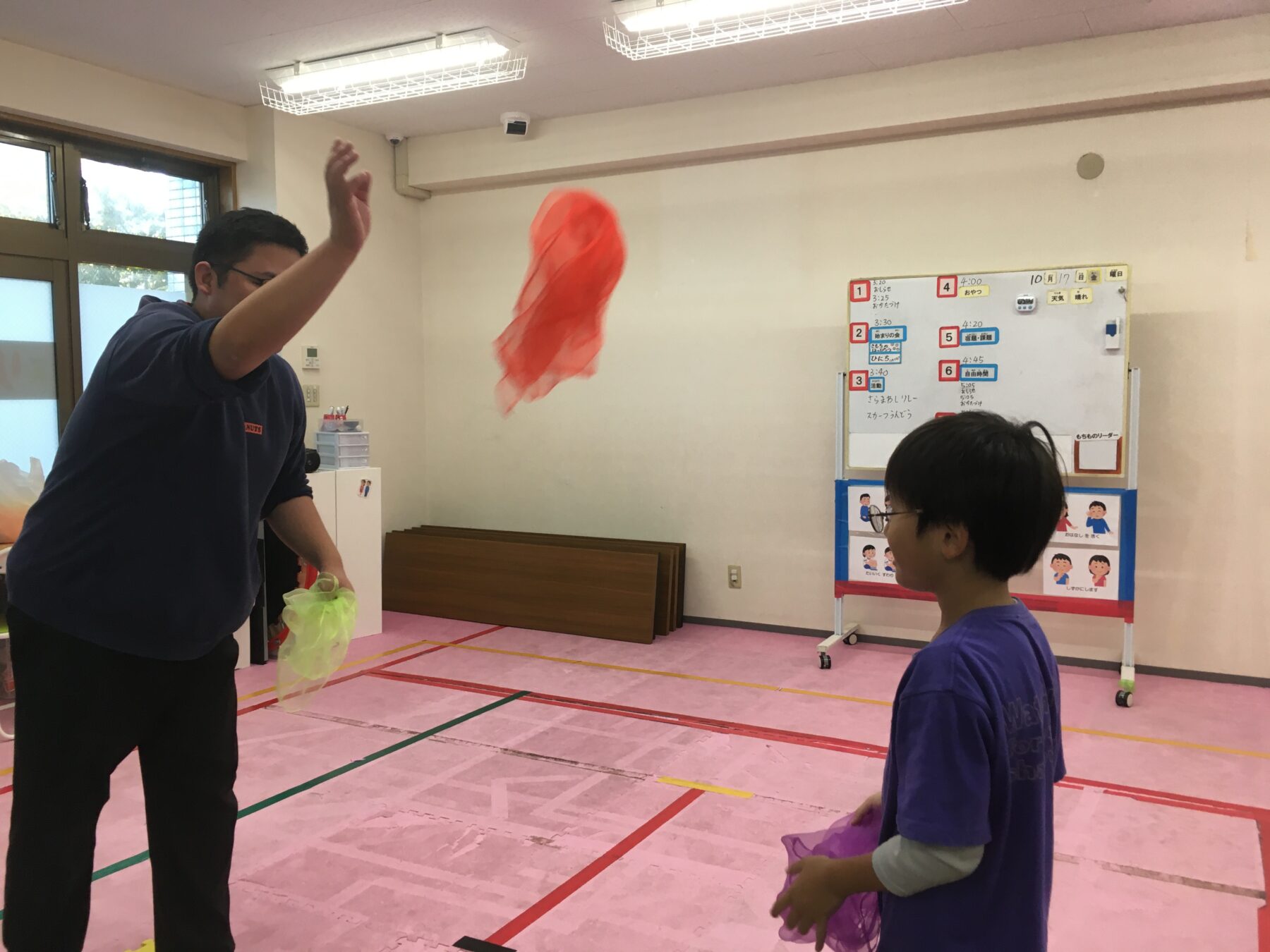 スカーフ運動では、ジャグリング用のスカーフを使用して、サポーターと30回スカーフをパスすることに挑戦していただきました。