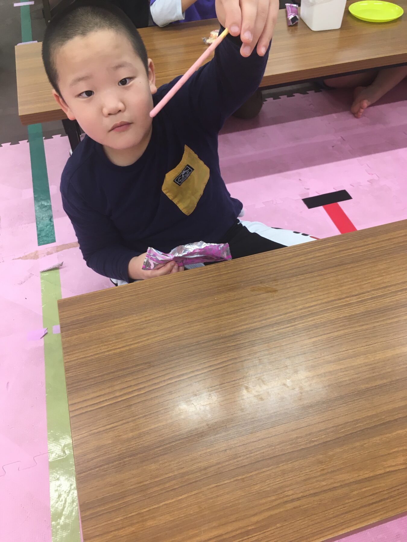 この活動は、プラスチック製の回っているお皿が乗った棒をバトン替わりにして、キャンドルサービスのように隣のお友だちにパスをする活動です。
