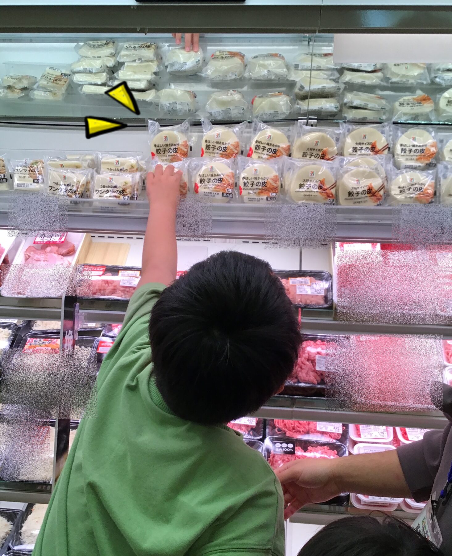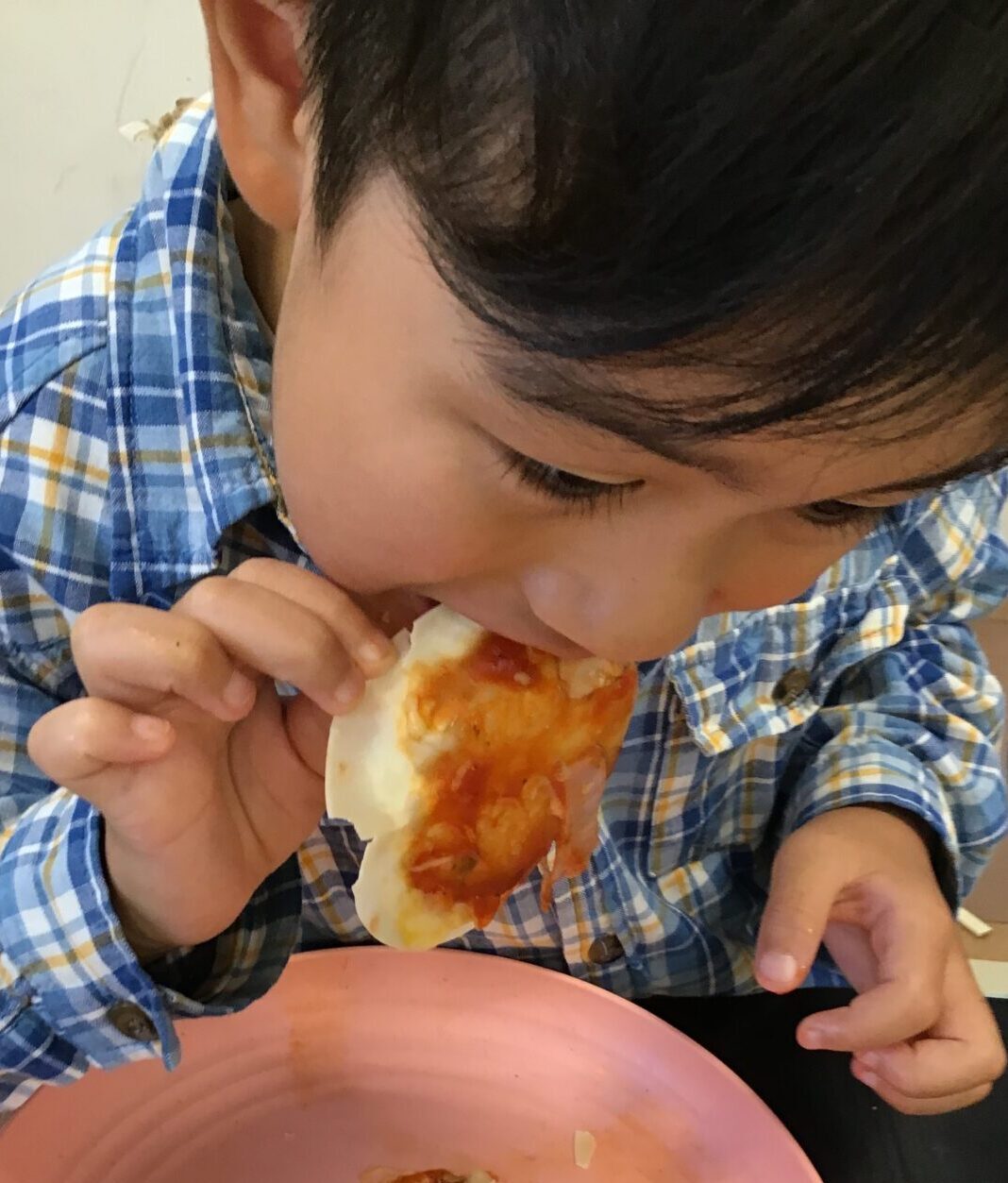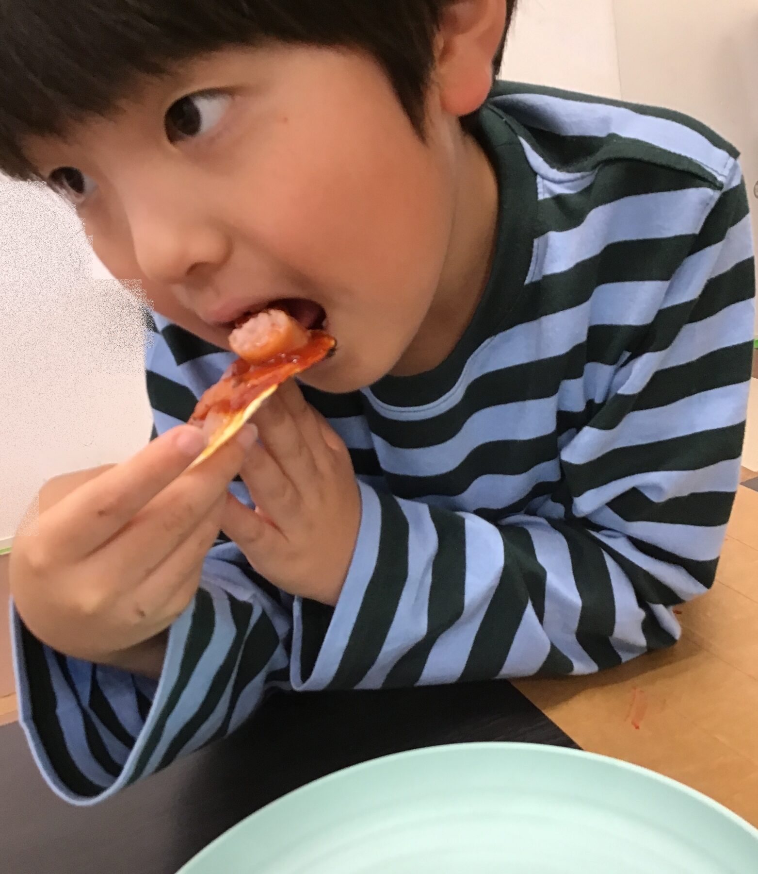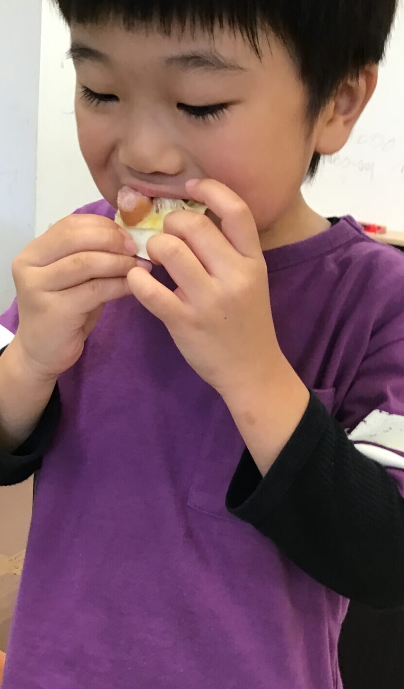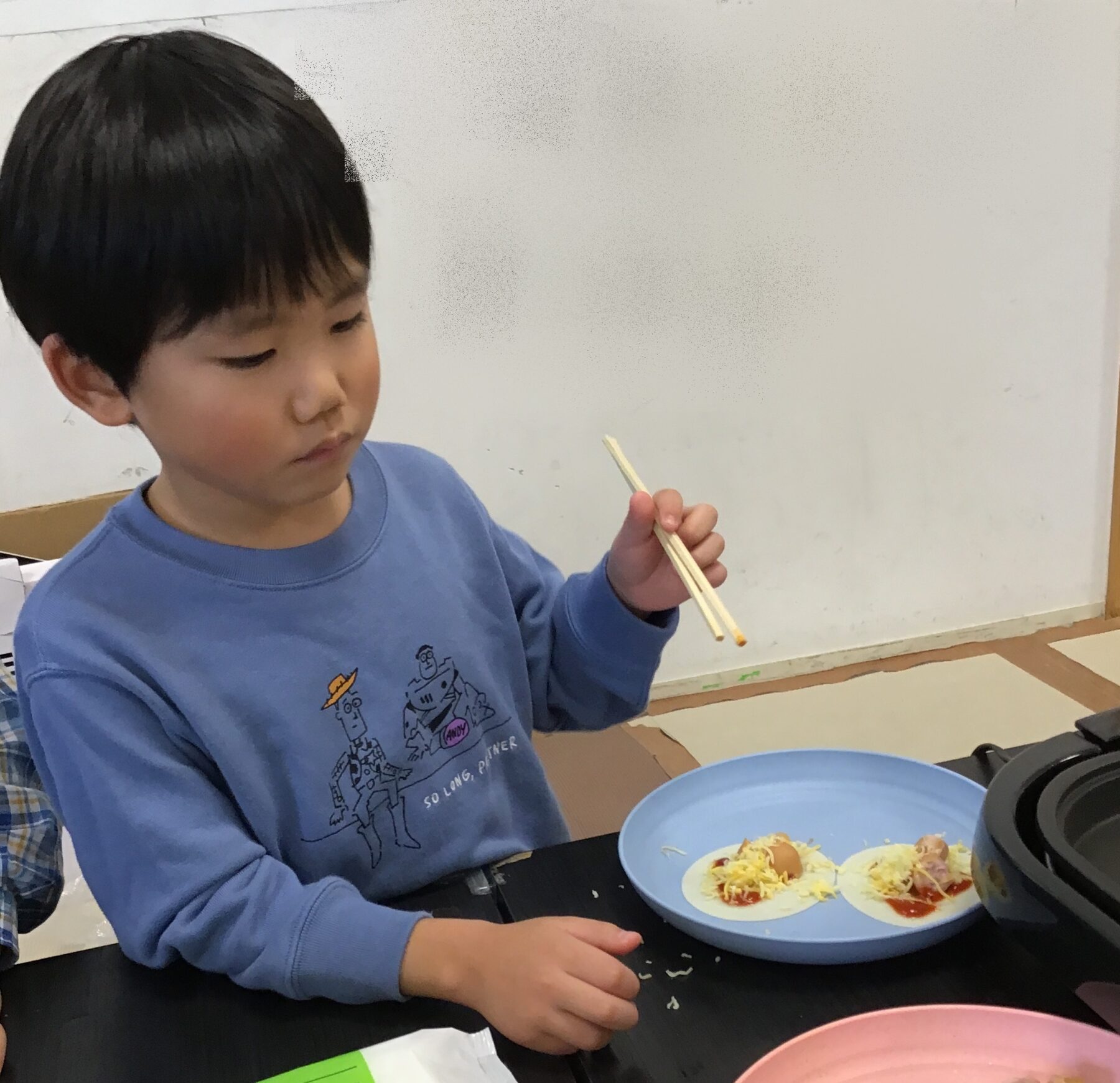 餃子の皮にウインナーやコーンなどを乗せて、ケチャップをかけて召し上がっております。