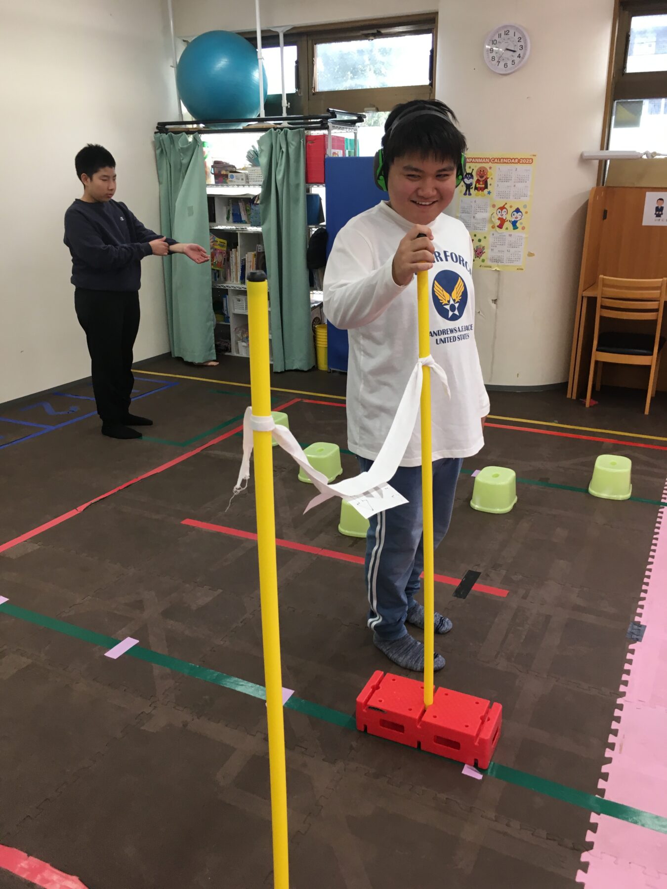 新聞紙を筒状に丸めて、手の平で落とさないように障害物を避けてタイムを計りました😊