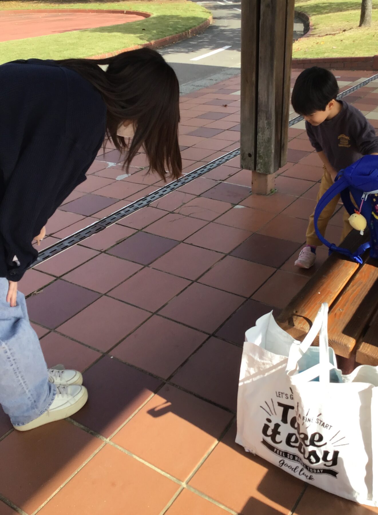 ▼電車で気になるところがあったようです。お友達が直してくださいました。