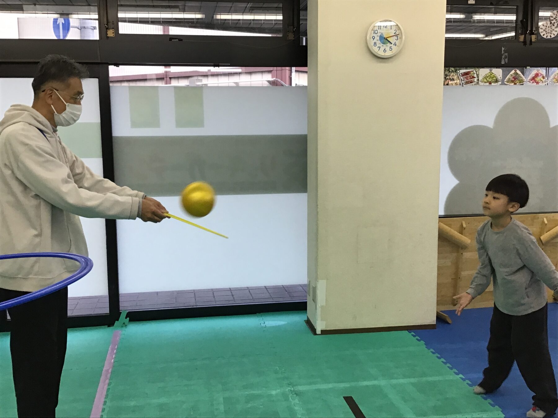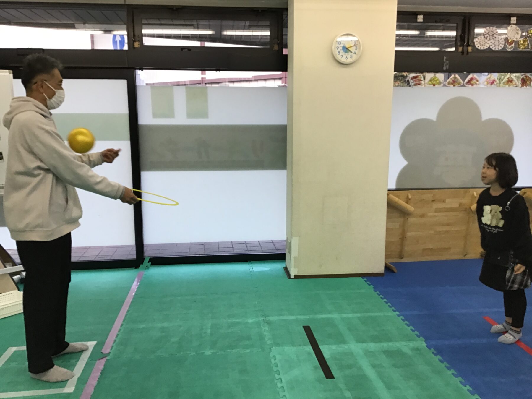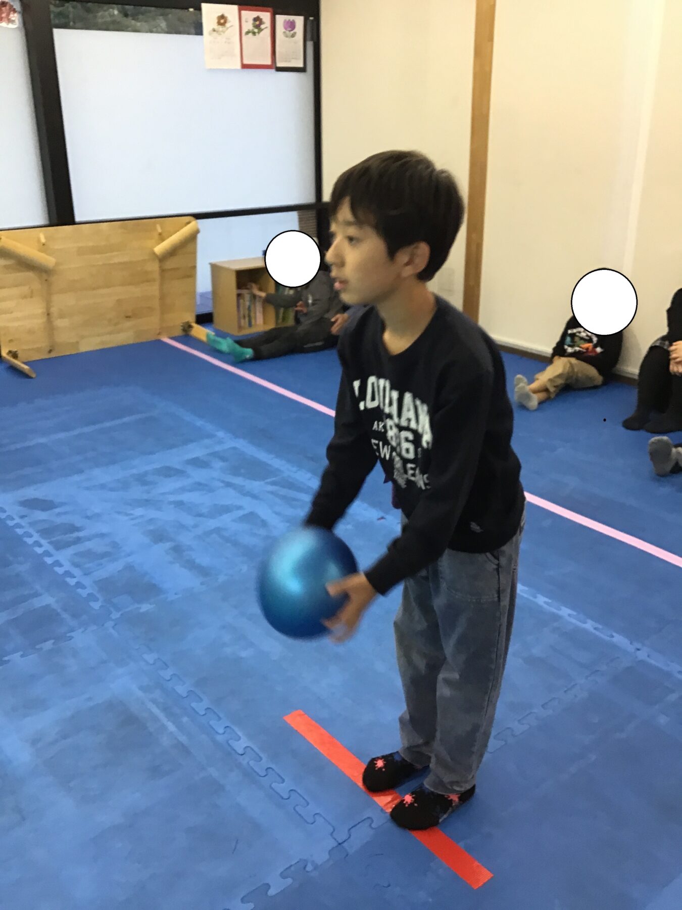 近い場所、遠い場所の二つを設定させて頂き、自分がボールを入れられる場所を確かめたり、選んで頂き、ボールを投げて、ゴールする活動です。