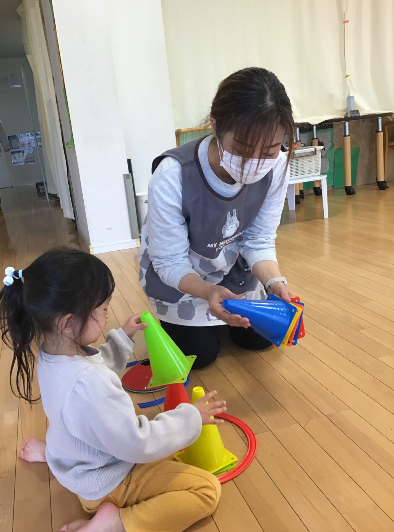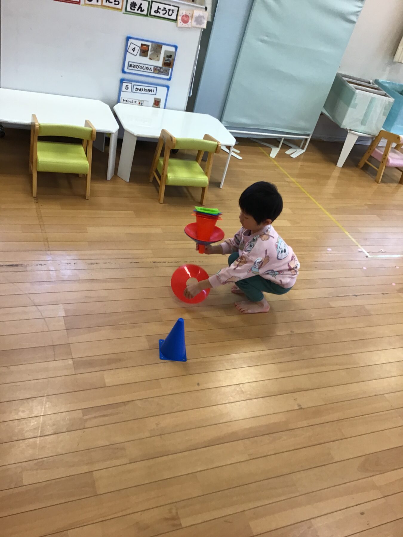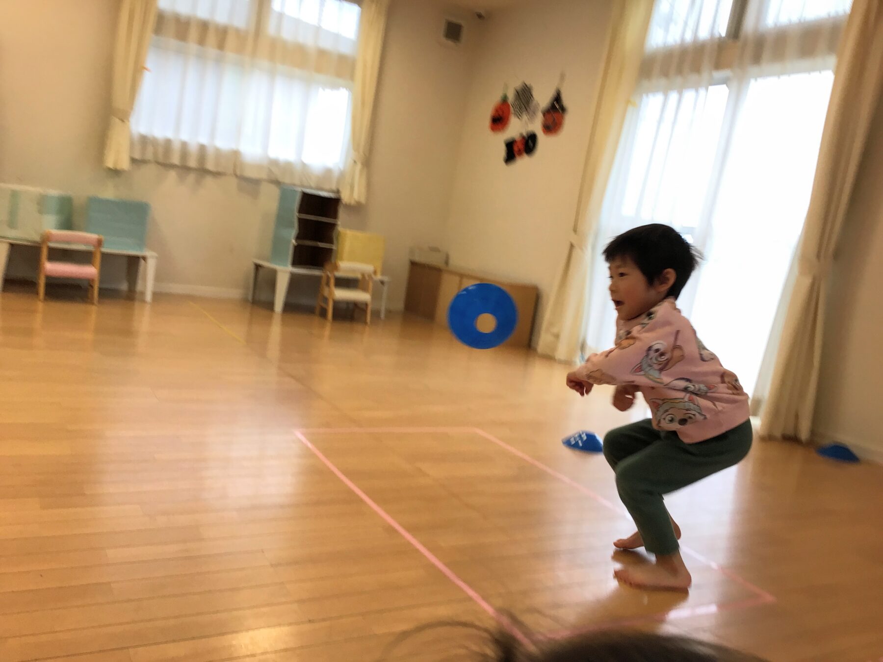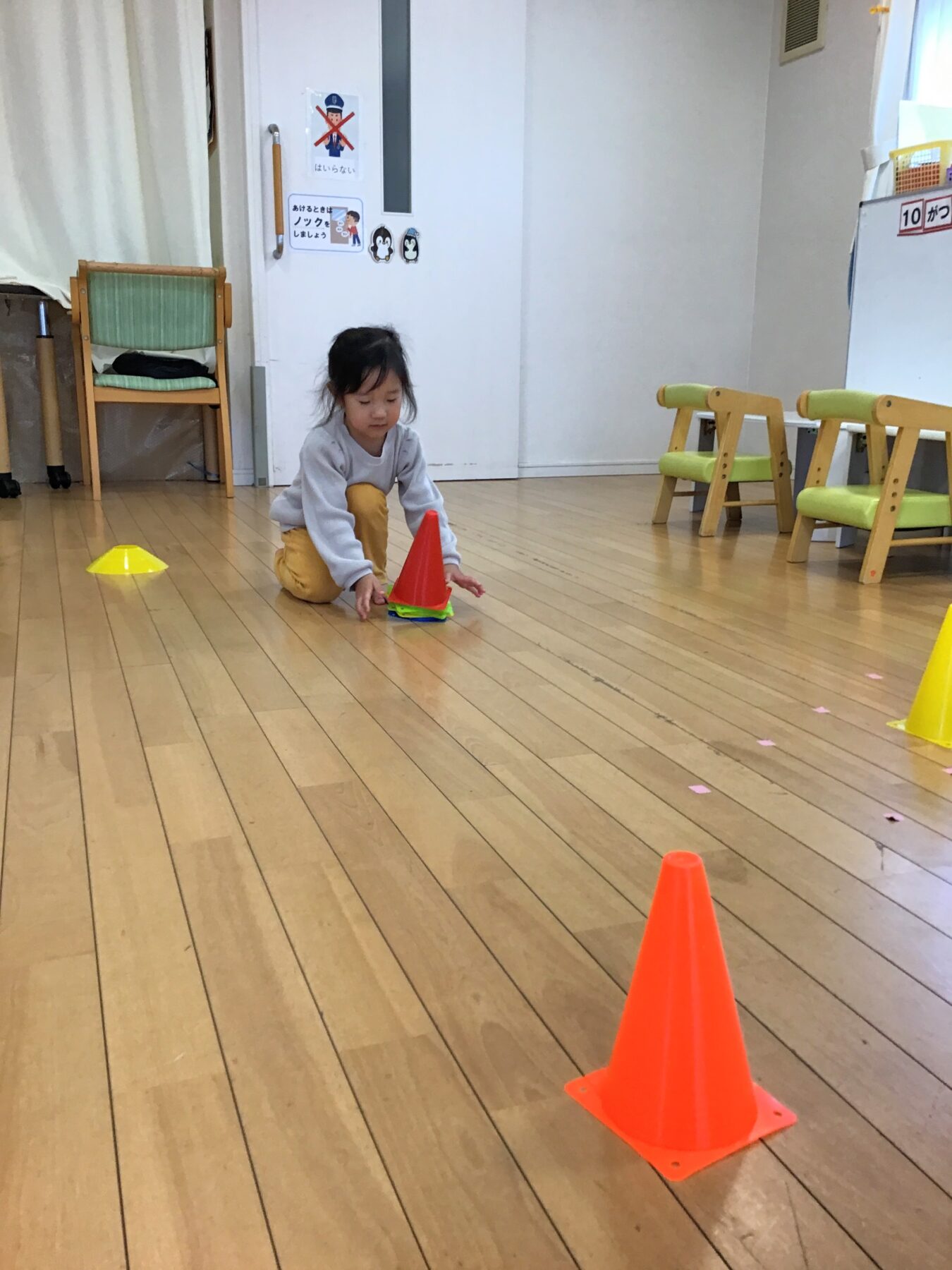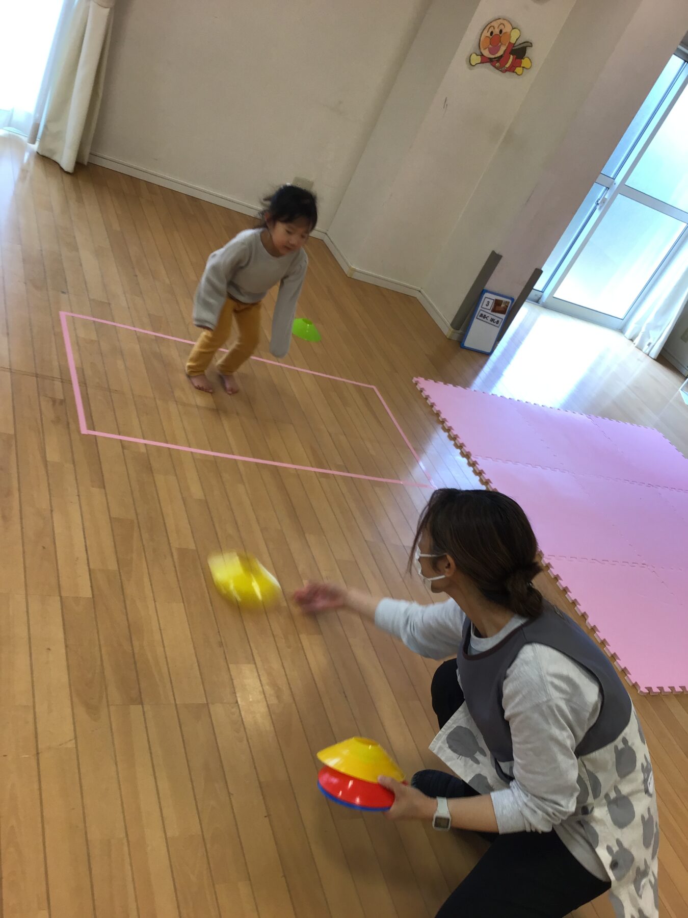 ジャンプをしたり、体をかがめたり、飛んでくるカラーコーンの動きに合わせて一生懸命に避けていました!(^^)!
