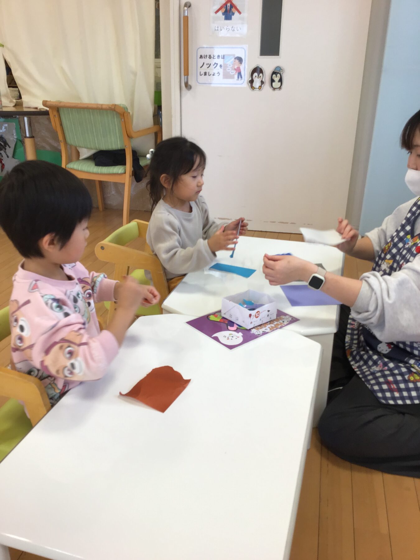 ▼「はい、どうぞ」仲良くおりがみを分けていました😊