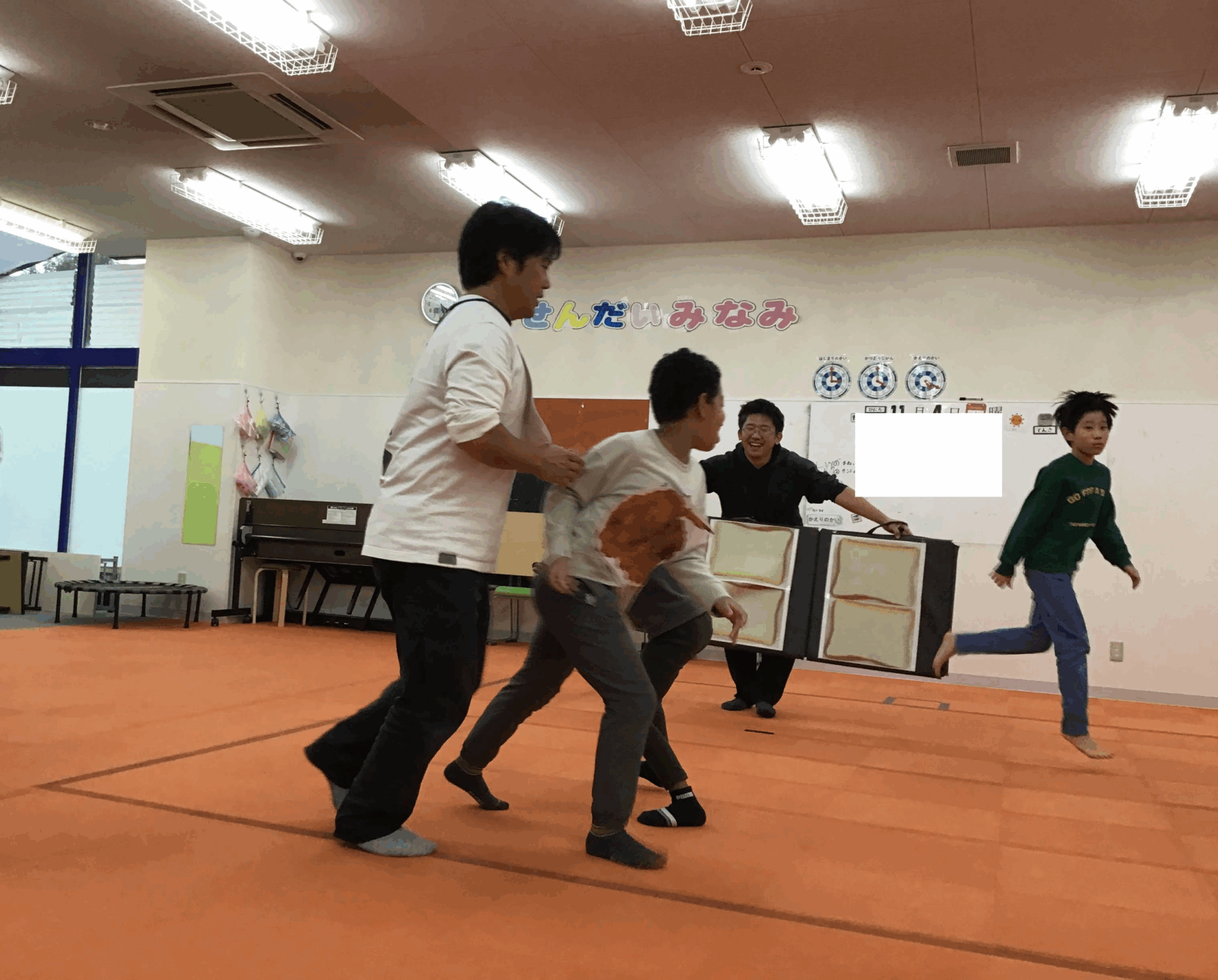 【サンドイッチゲーム】は、パン役のサポーターに捕まらないよう、サンドウィッチの具材になったお子さんたちが逃げるゲームです。