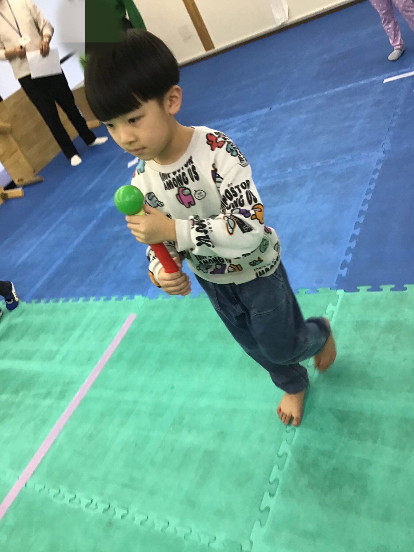 体幹とバランス感覚、集中力、バトンを渡すときのお友達とのコミュニケーションも取りながら、