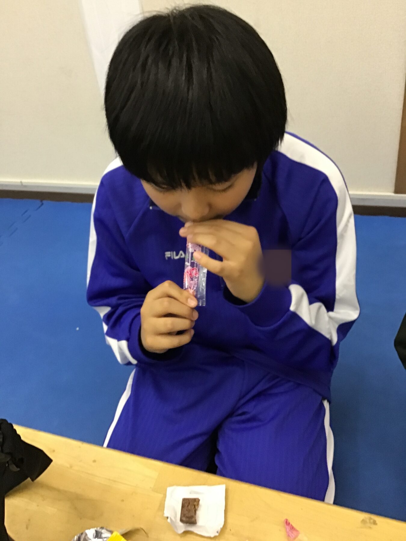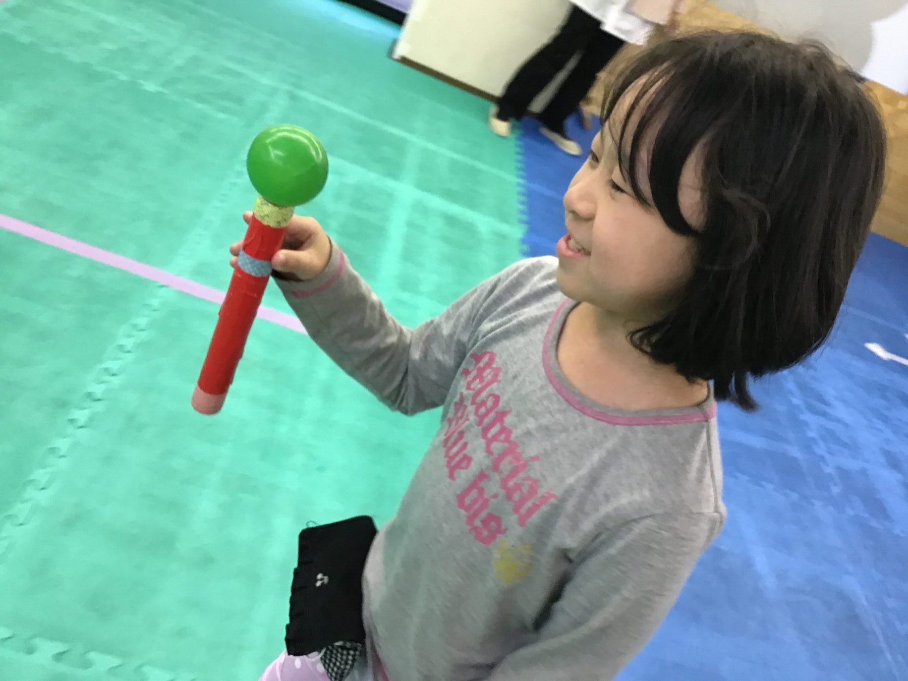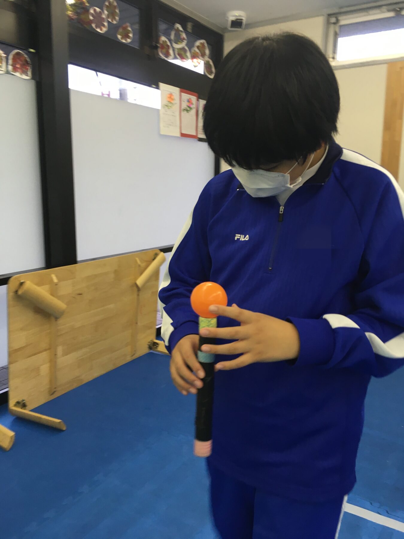 ラップの筒をバトン代わりにして、その上に軽いボールを乗せてバトンごとリレーをする活動です。