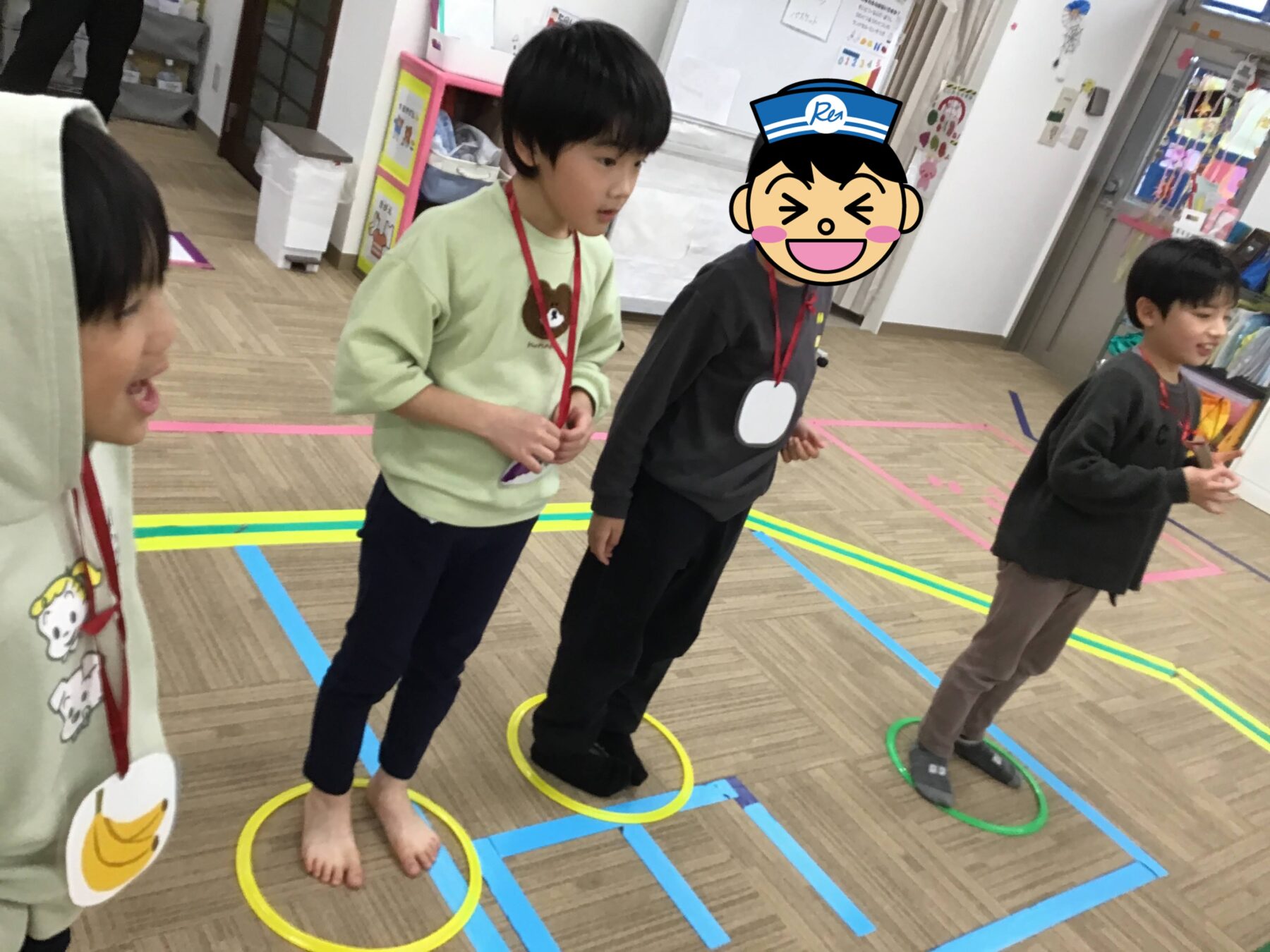 こどもたちで好きなフルーツを決めてフープにの中に立ってもらい、真ん中にいるお友だちにフルーツの名前を言われたら移動スタート!