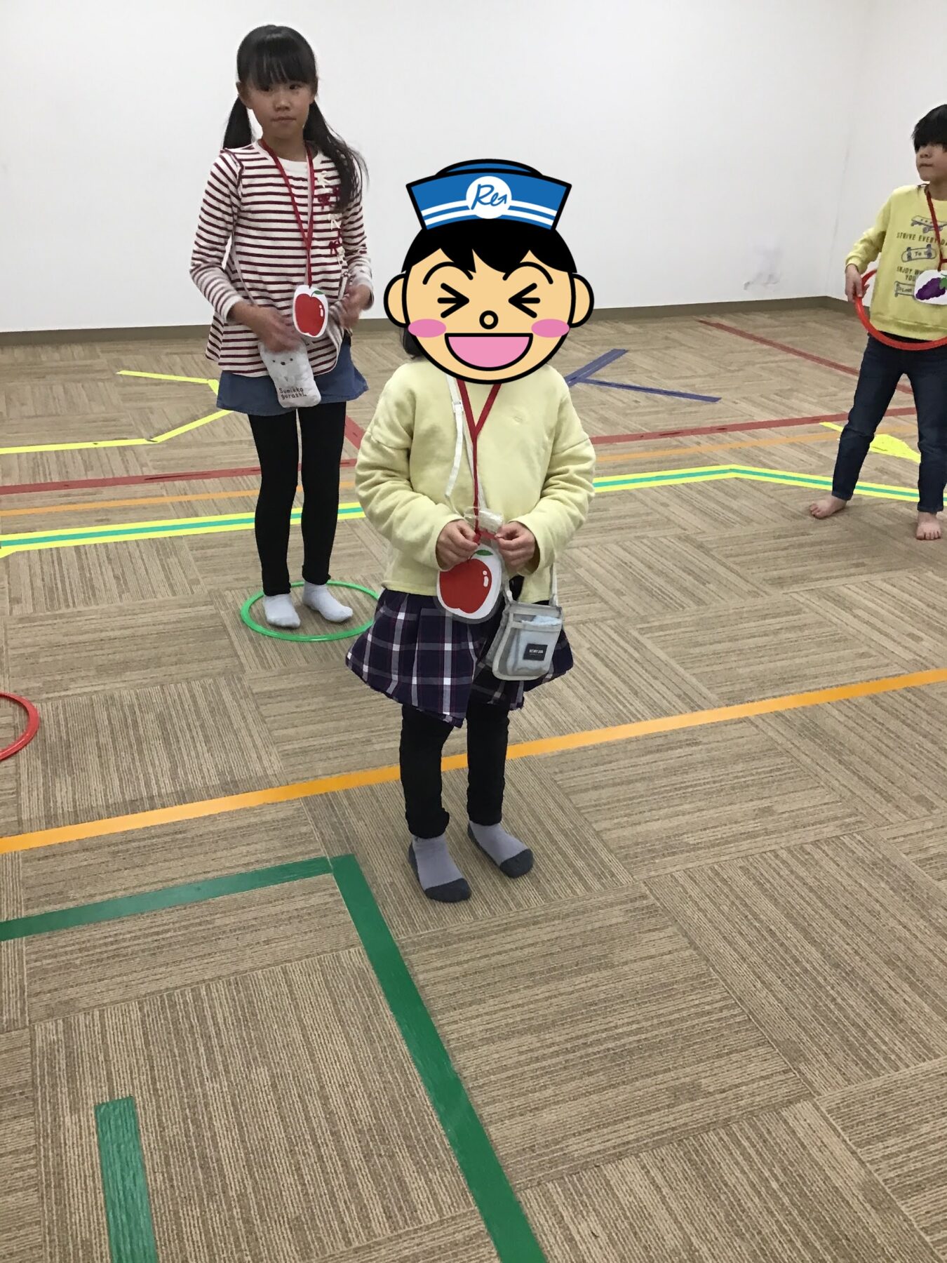 自分がもっているフルーツの名前を言われたら外側を1周走ってから空いているフープの中に入っていただきました。