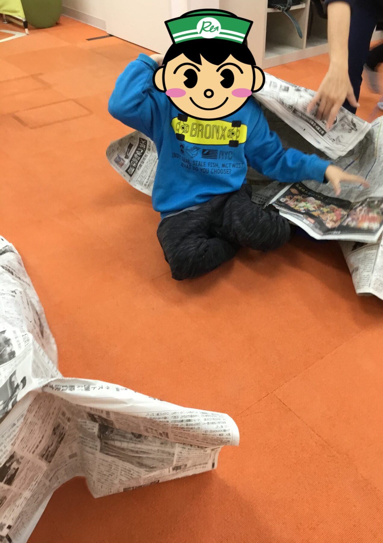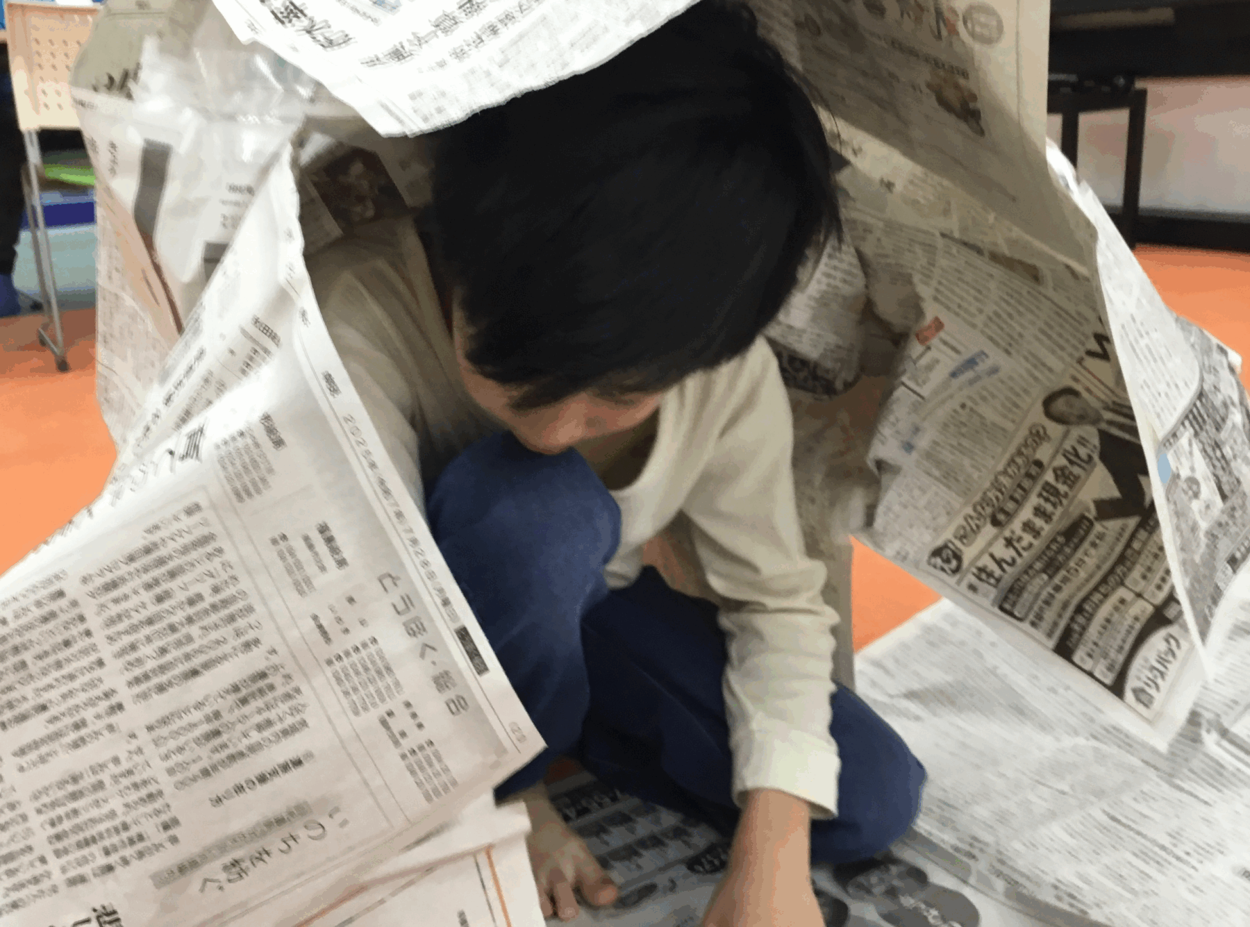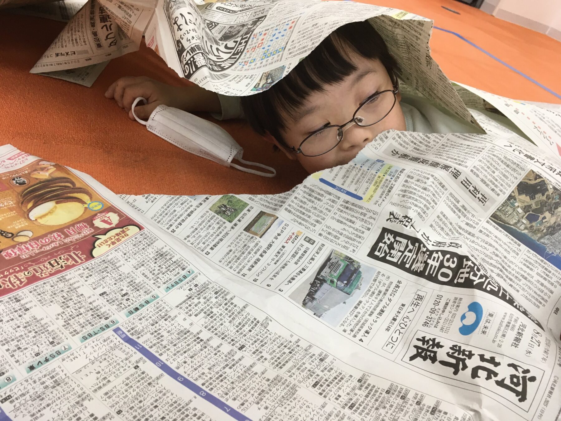お子さんたちは声がけに合わせて、床に落ちている大小さまざまな新聞を使って隠れます📰