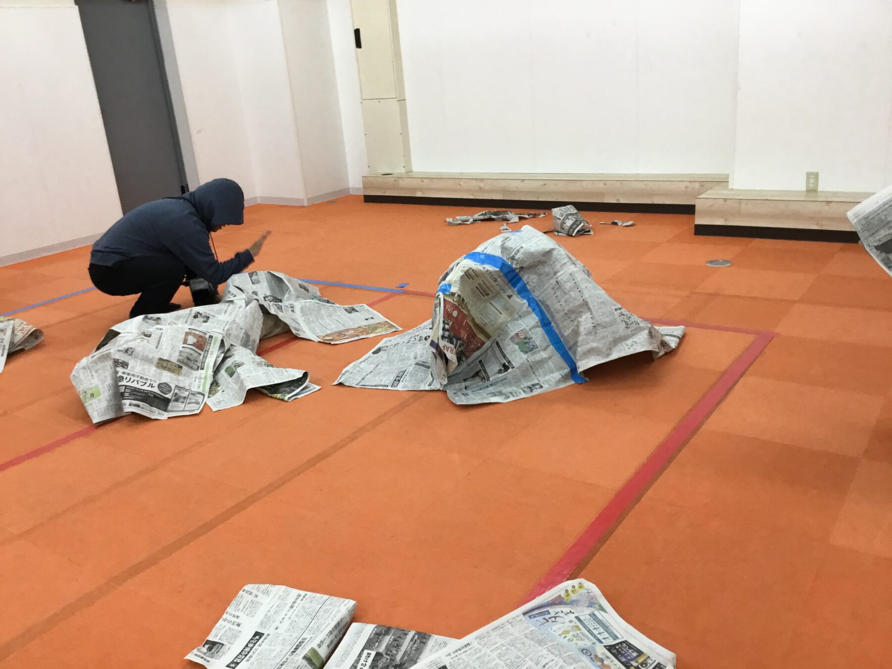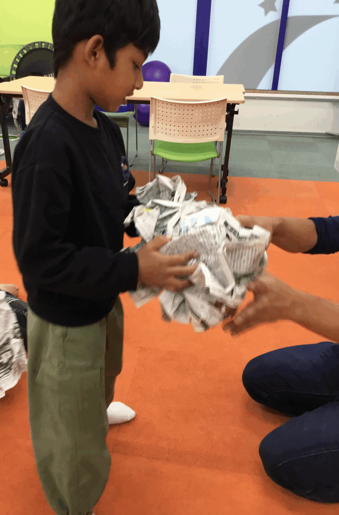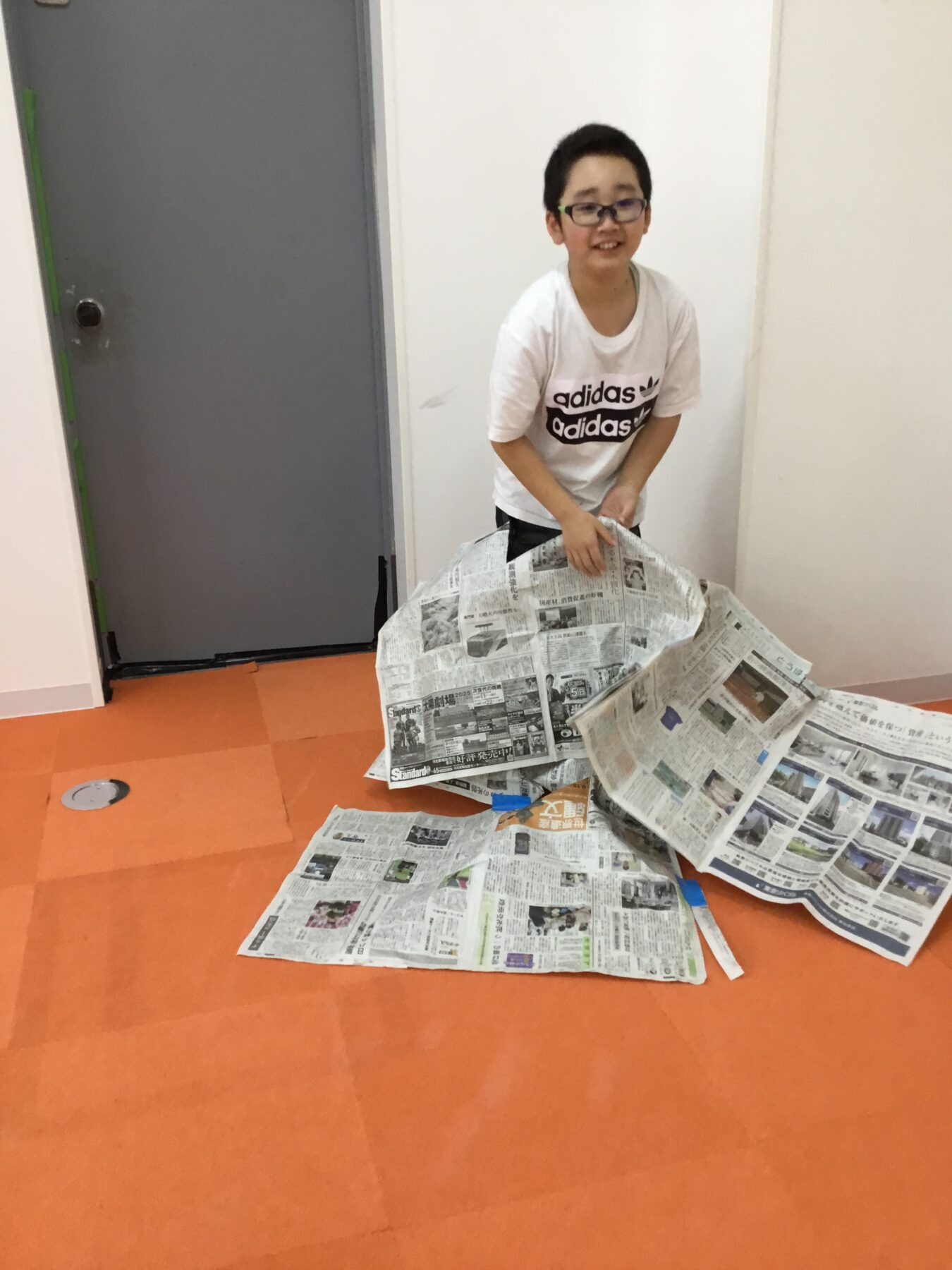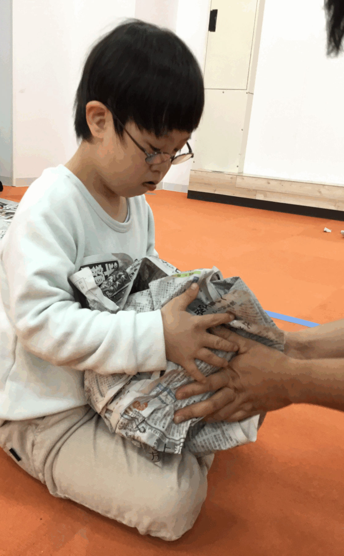 お子さんたちは声がけに合わせて、床に落ちている大小さまざまな新聞を使って隠れます📰