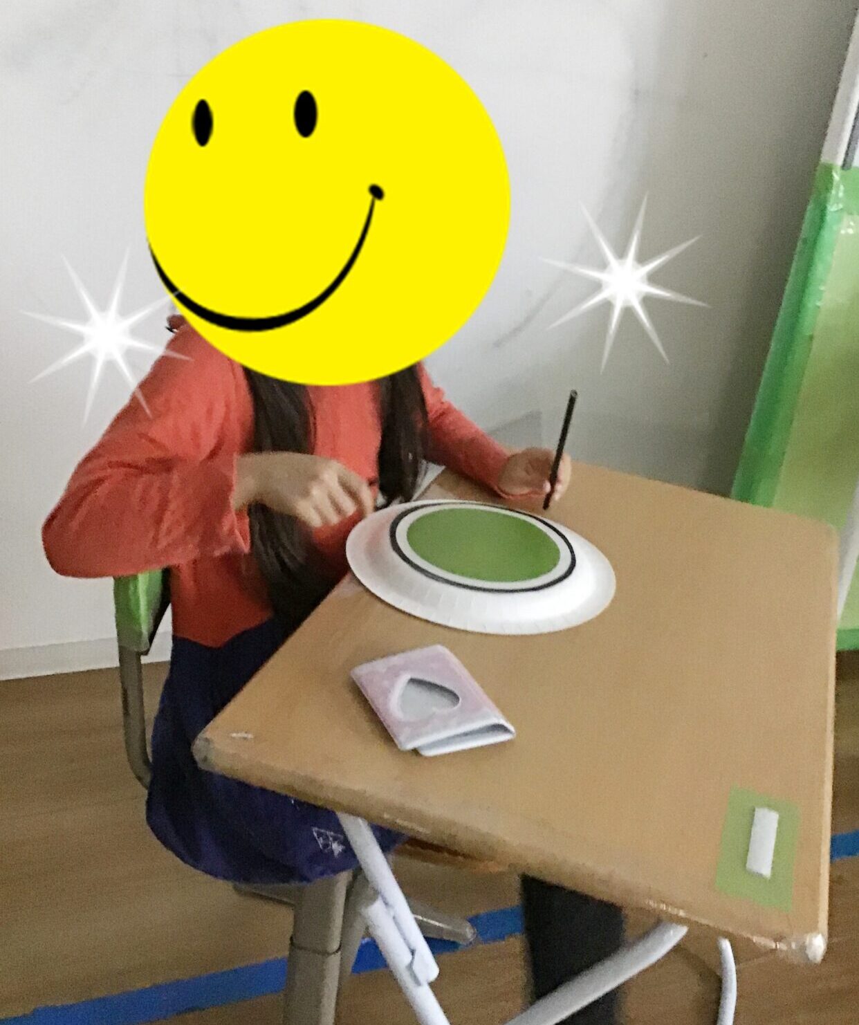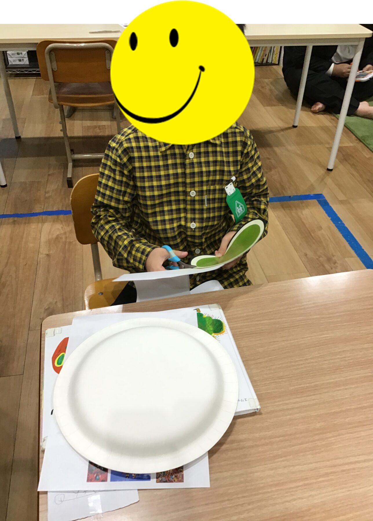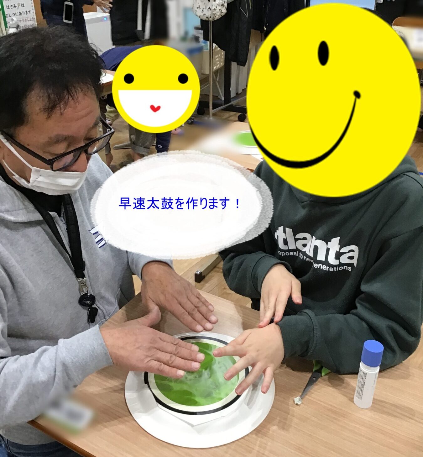次に太鼓に見立てた紙皿に太鼓のイラストを切って貼り付けます。