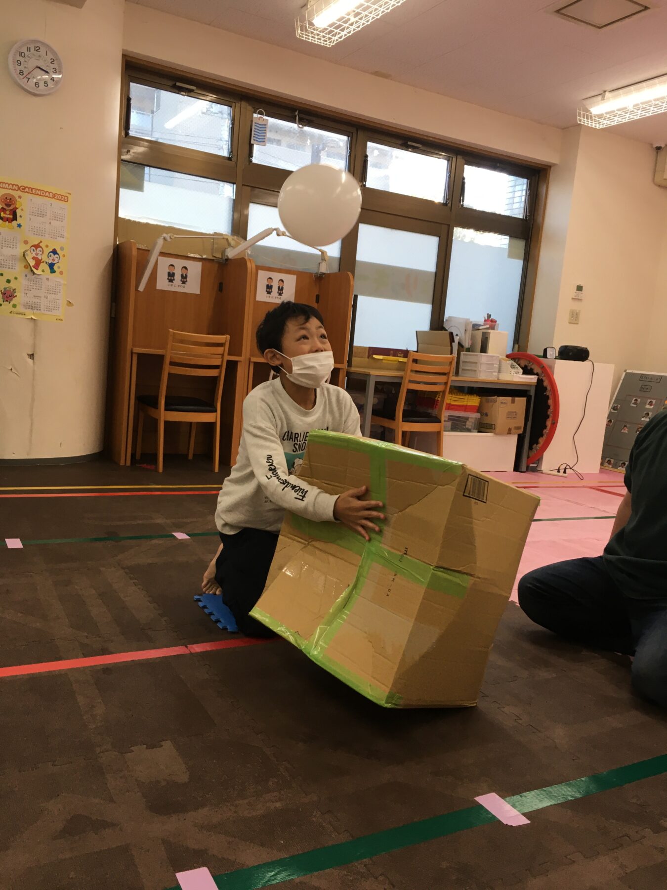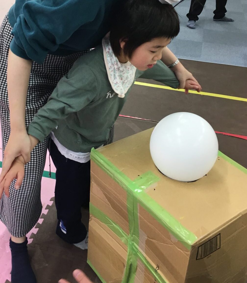 風船空気砲の活動では、段ボールの空気砲を力いっぱい叩き、風船を真上に打ち上げ、どれくらいの高さまで飛ばせるかを楽しんでいただきました。