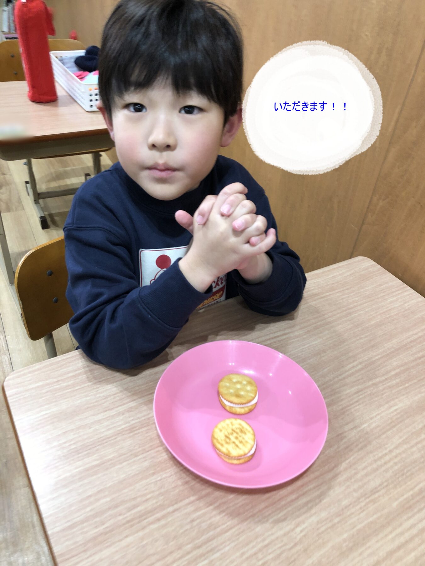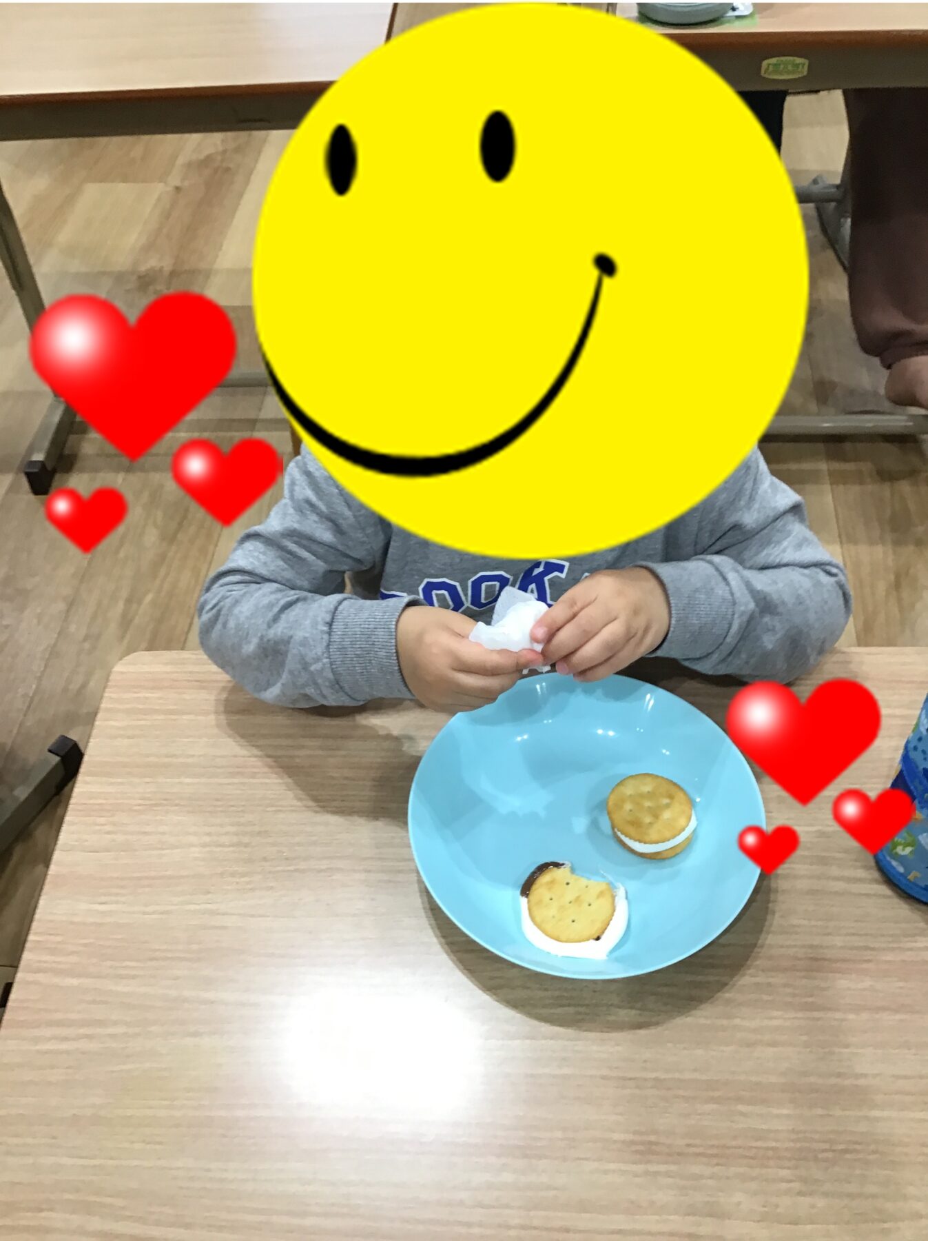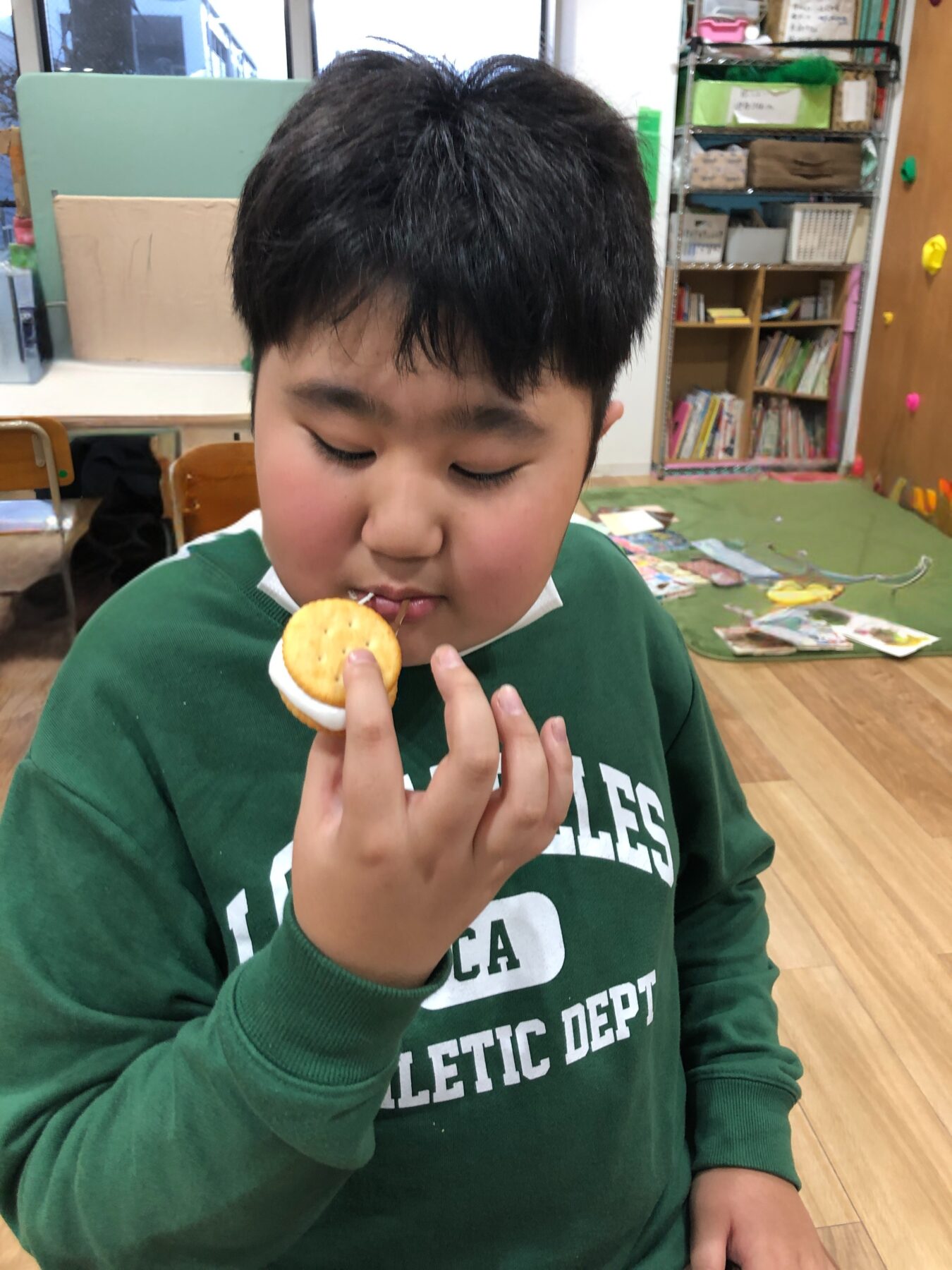 本日の活動では、ビスケットでマシュマロをはさみ、