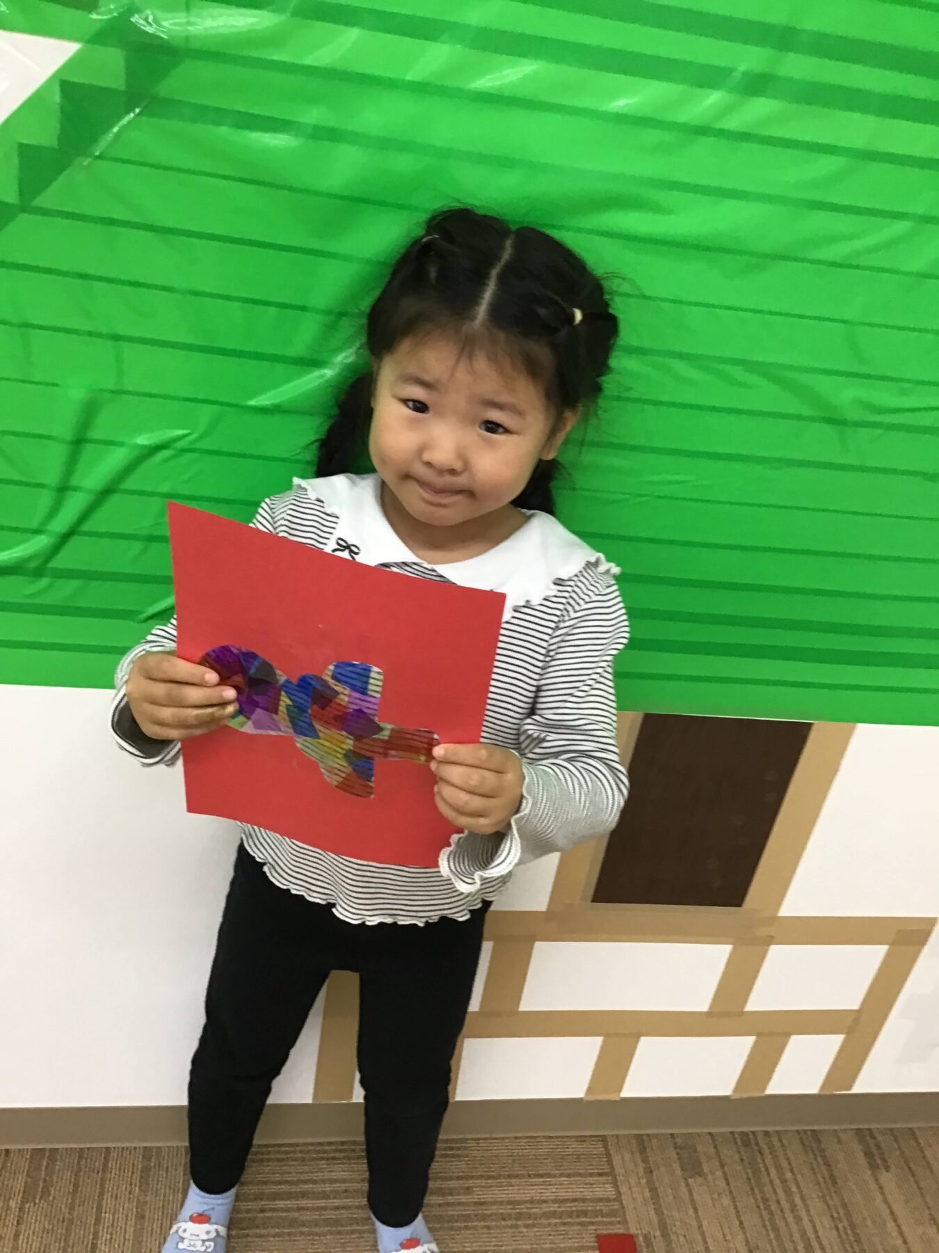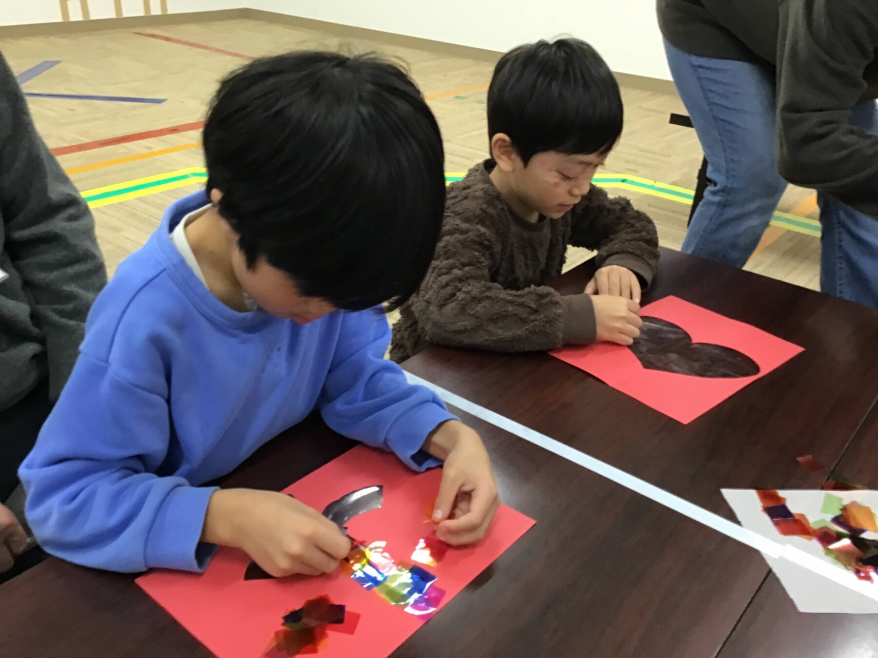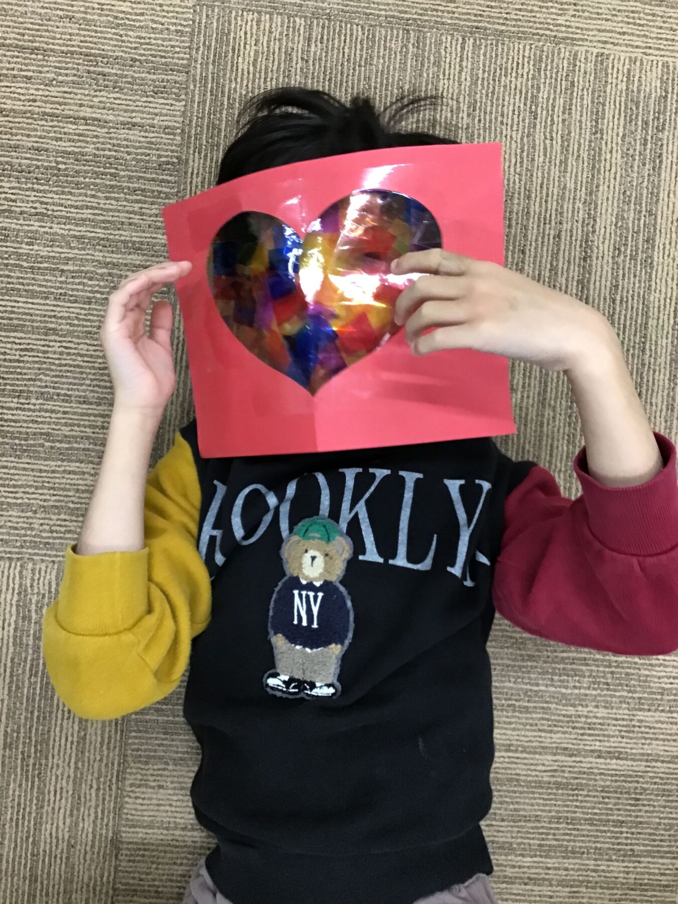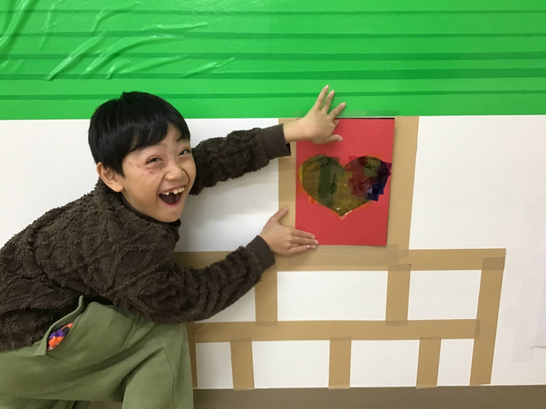 「リッキーガーデン」の文字をカラーセロハンを使って、協力して巨大ステンドグラスづくりをしました。