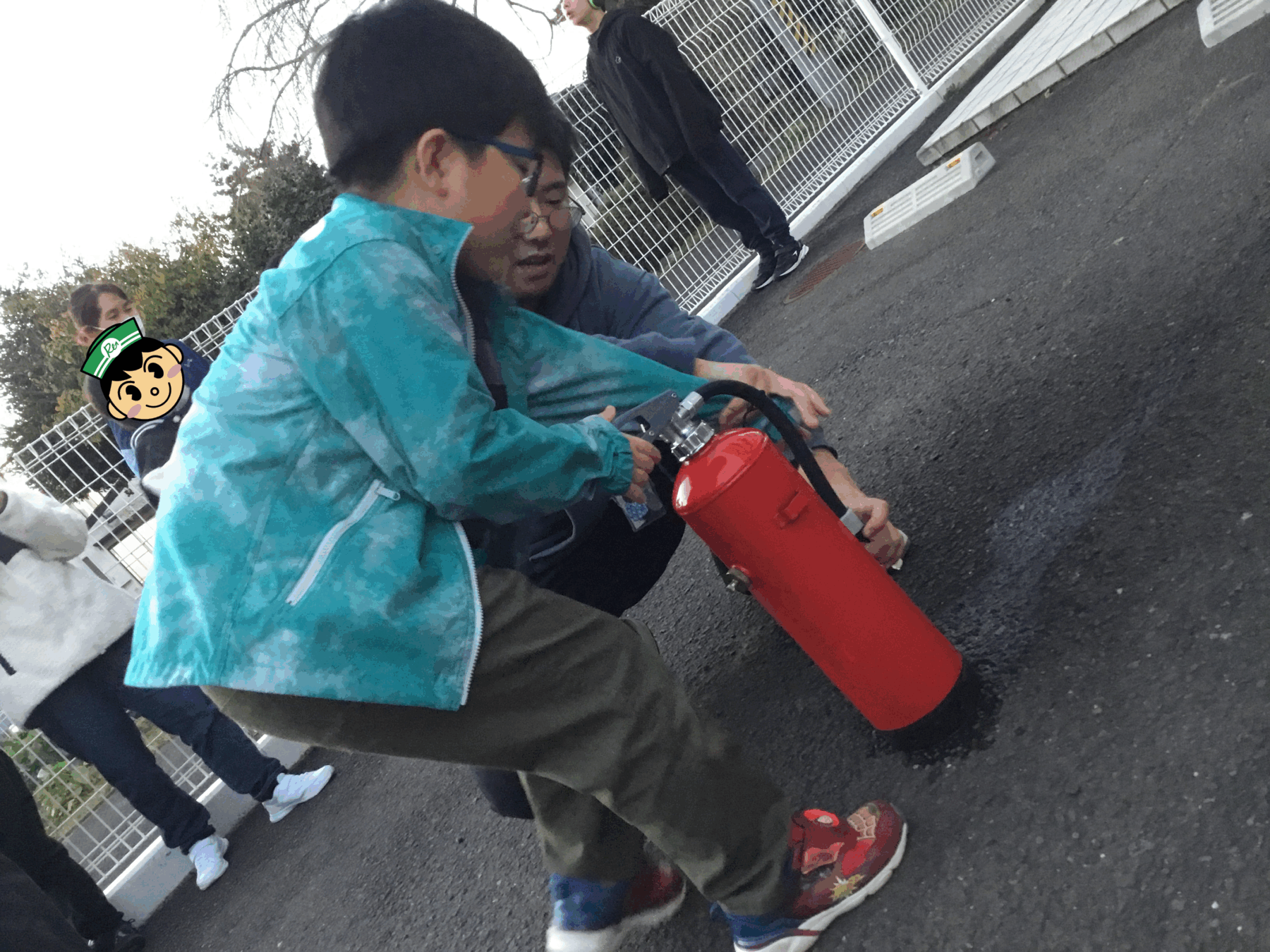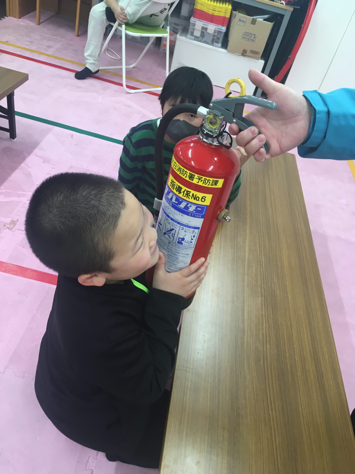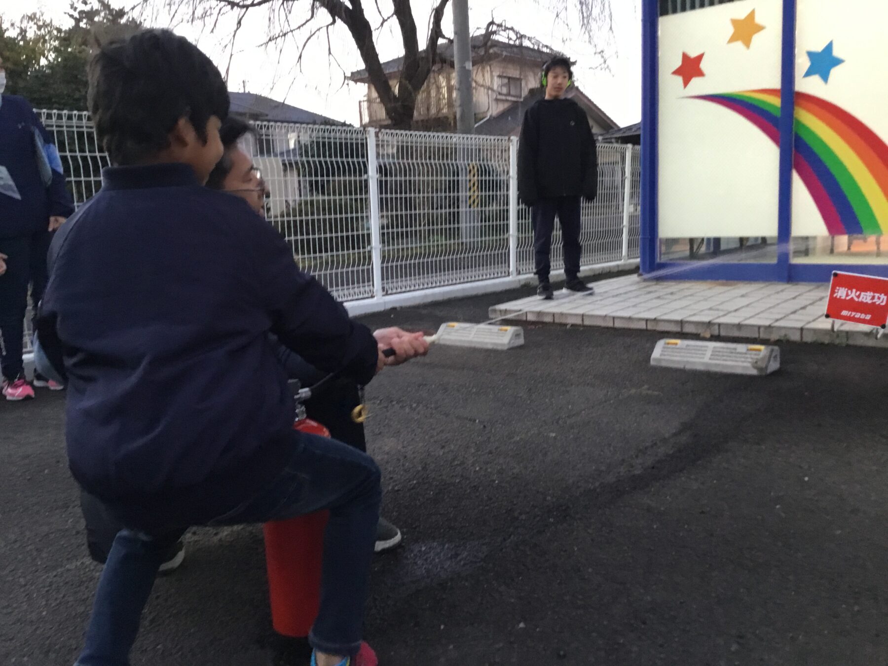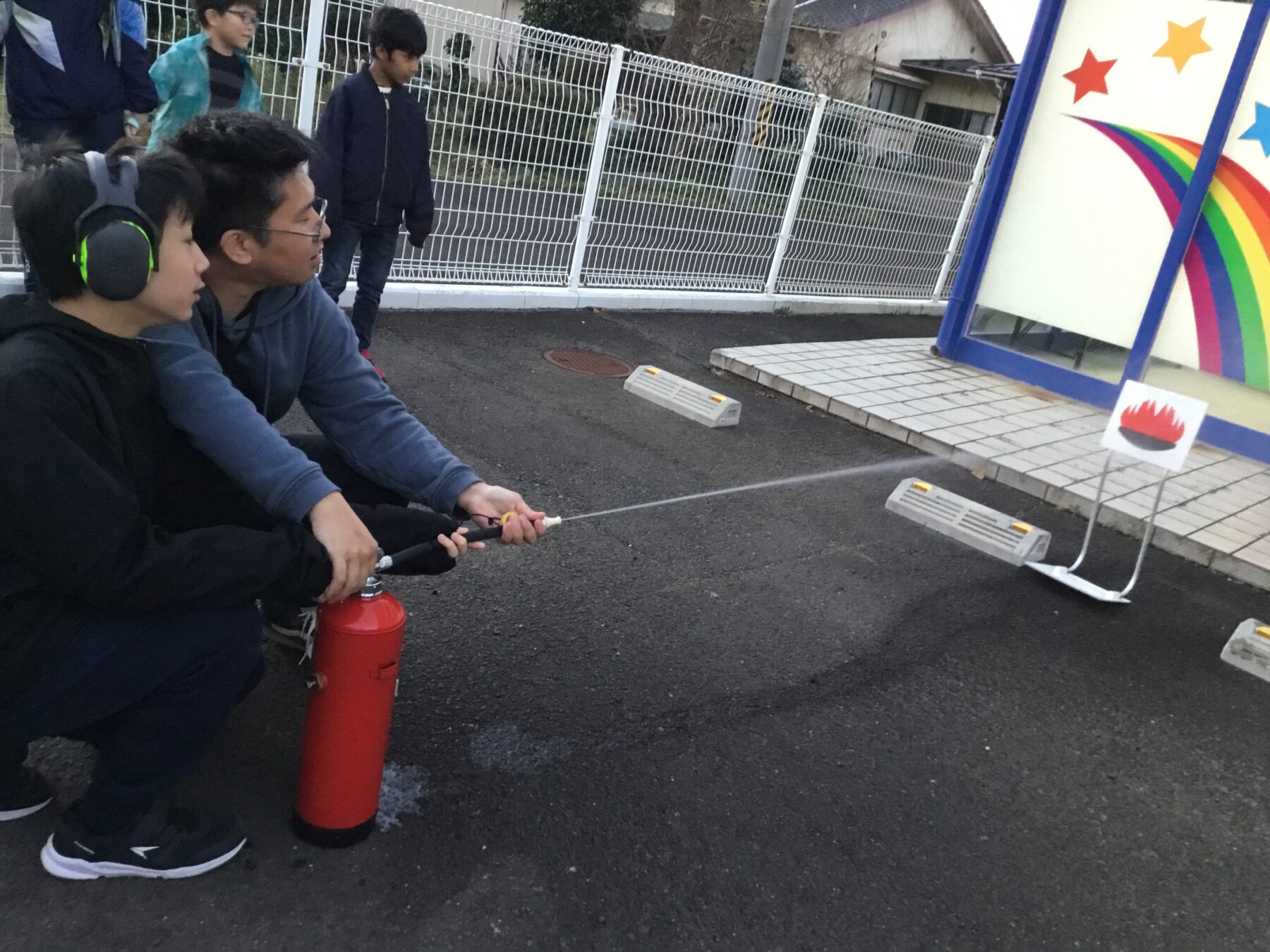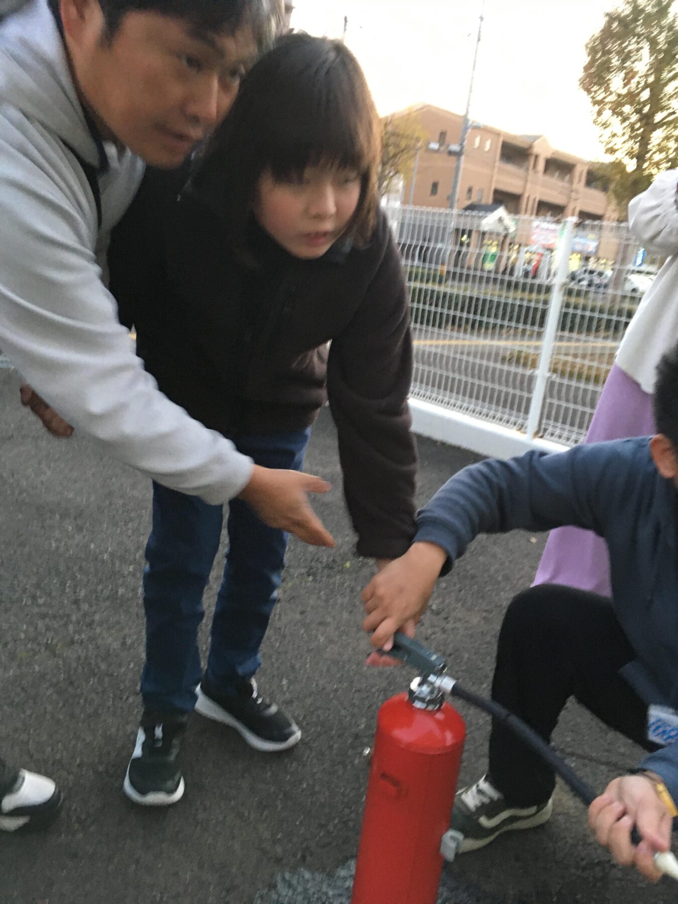 最後に、消防署からお借りした消火器で、消火体験をしました。
