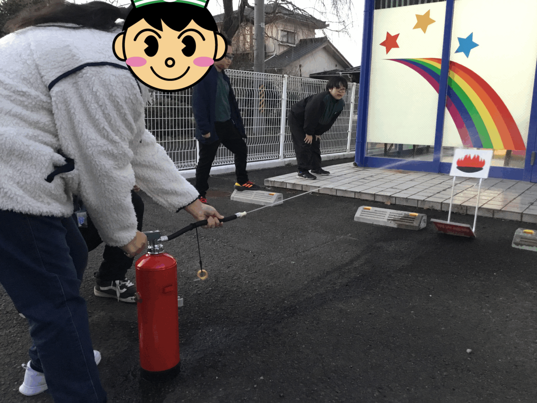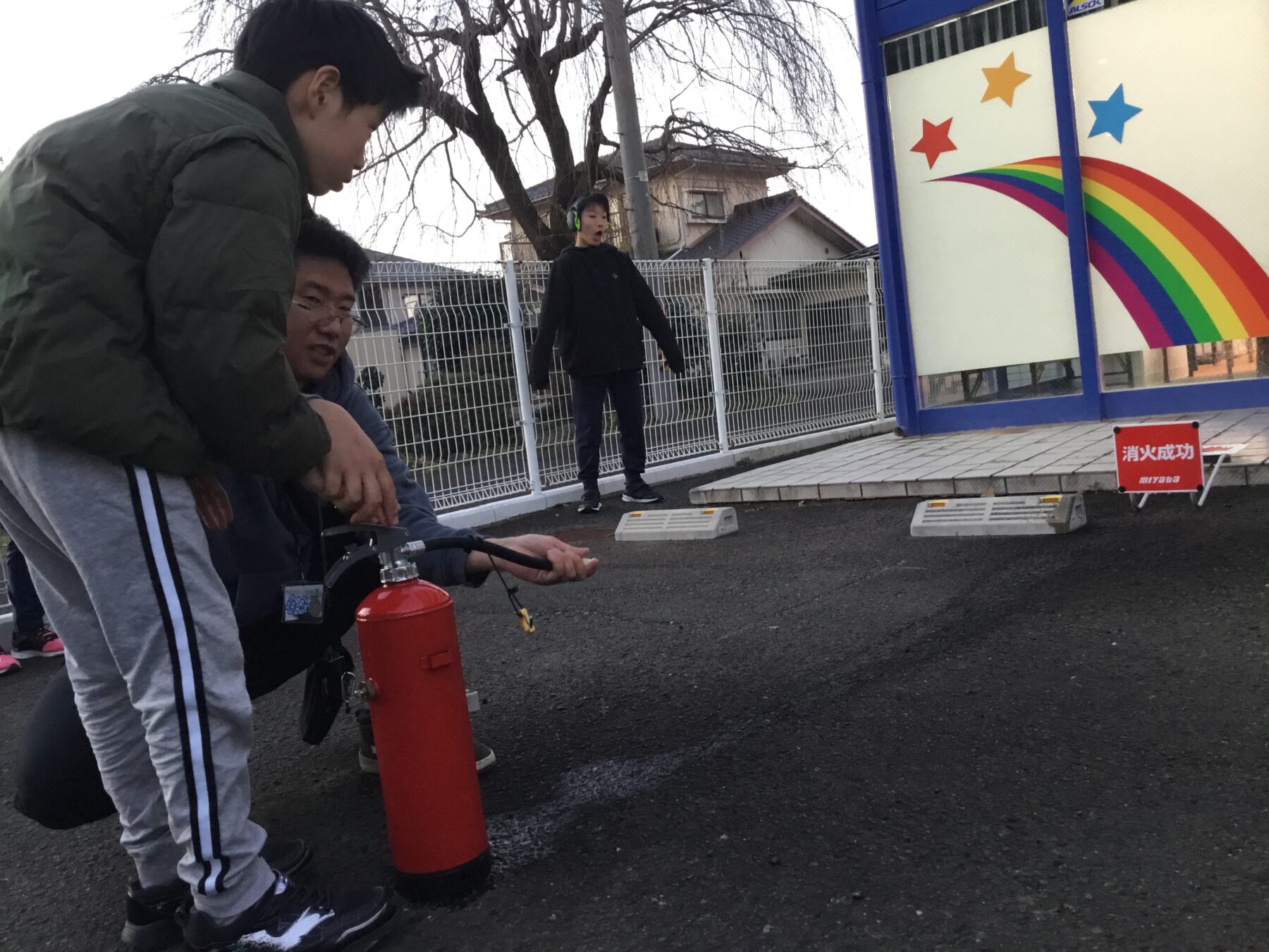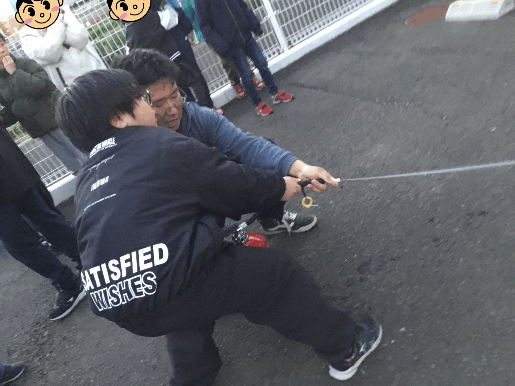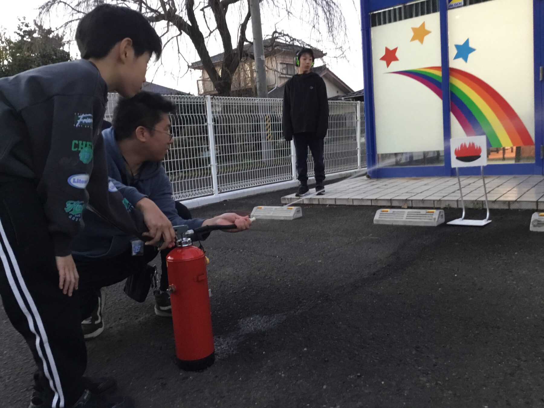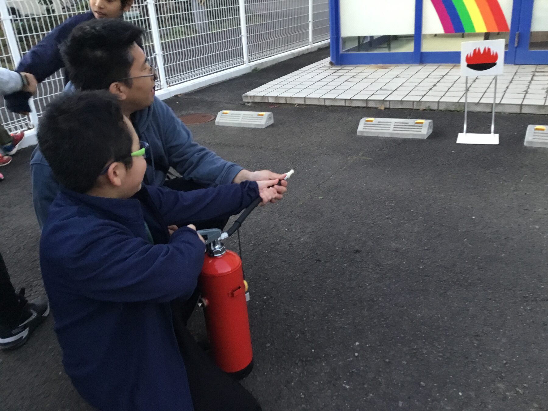 最後に、消防署からお借りした消火器で、消火体験をしました。