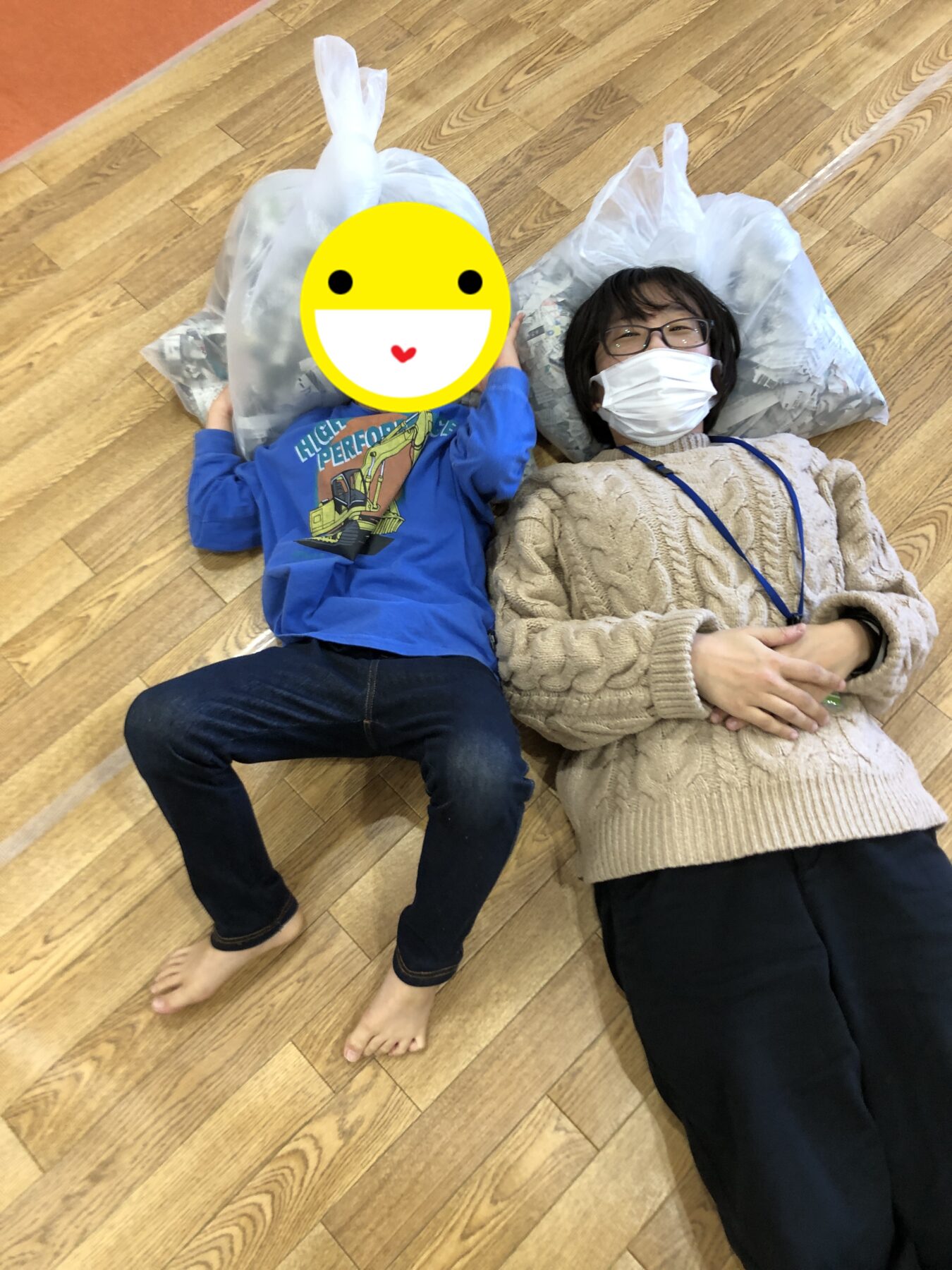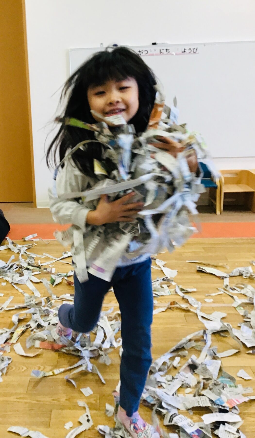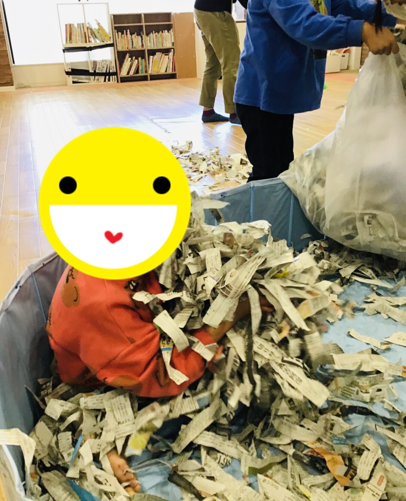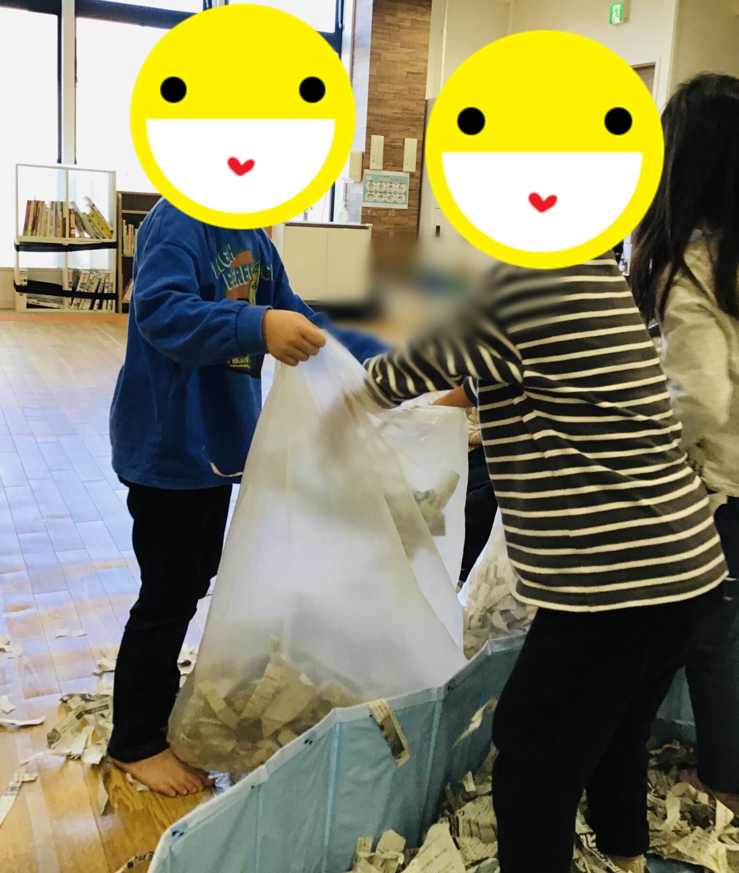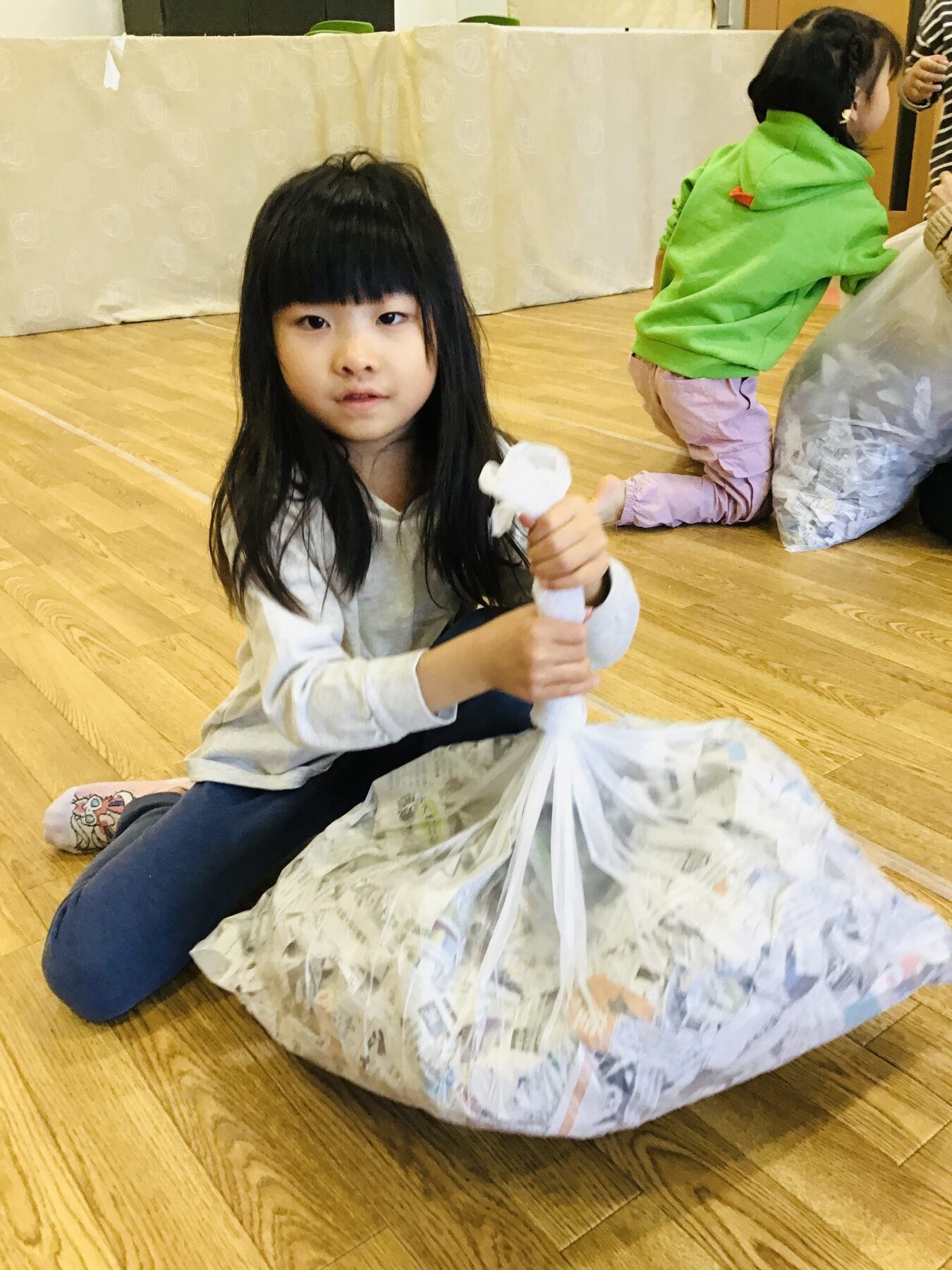 最後は、お友だちみんなで細かくなった新聞紙を大きなビニール袋に集めました。