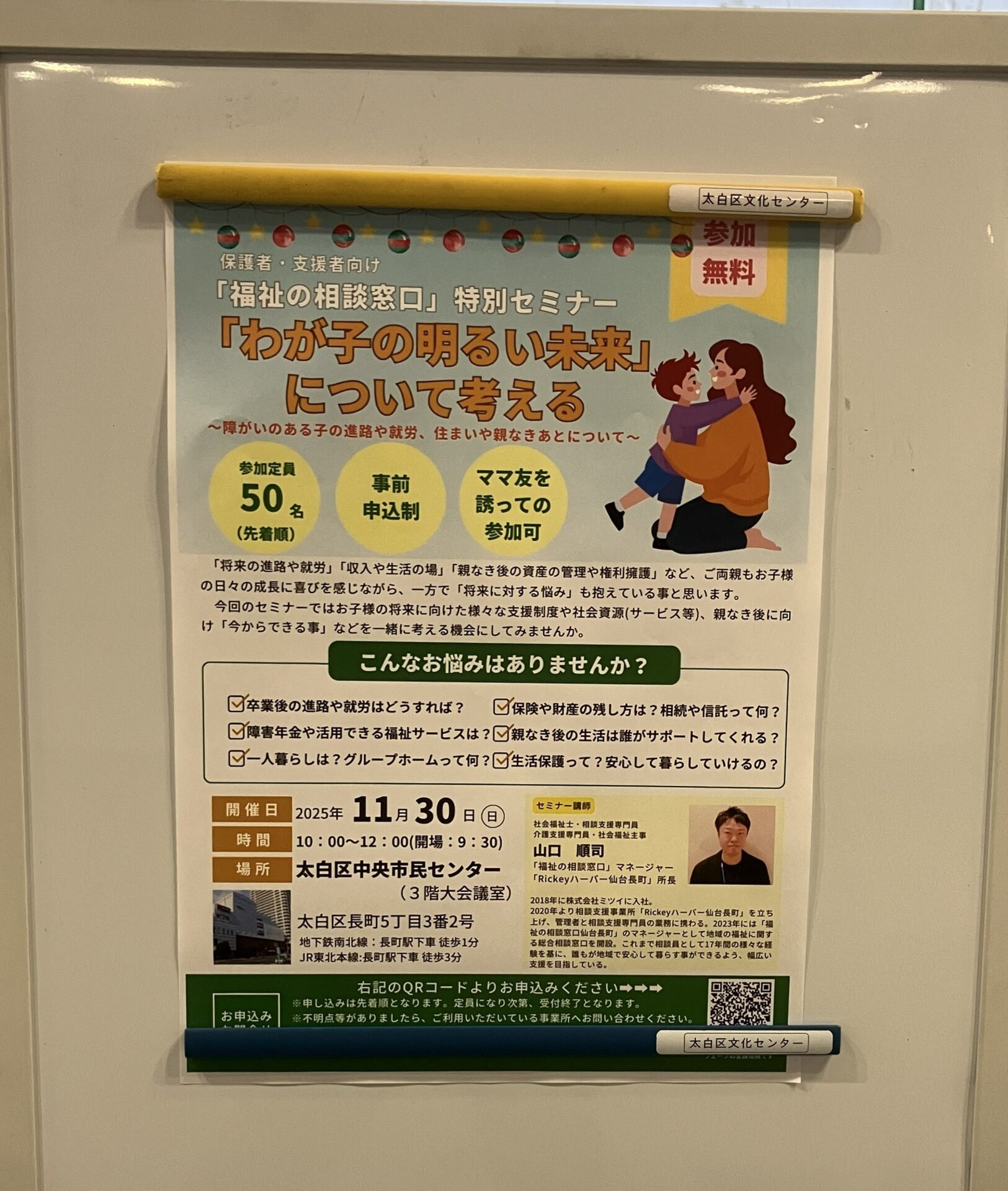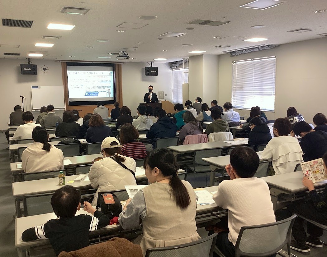 セミナーでは障がい者相談支援事業所『Rickeyハーバー仙台長町』及び『福祉の相談窓口仙台長町』の所長・マネージャーである山口順司を講師に、様々な福祉サービスや、お子様の将来の就労や生活などに活用できる制度・事例などを相談支援の立場からご紹介させていただきました。