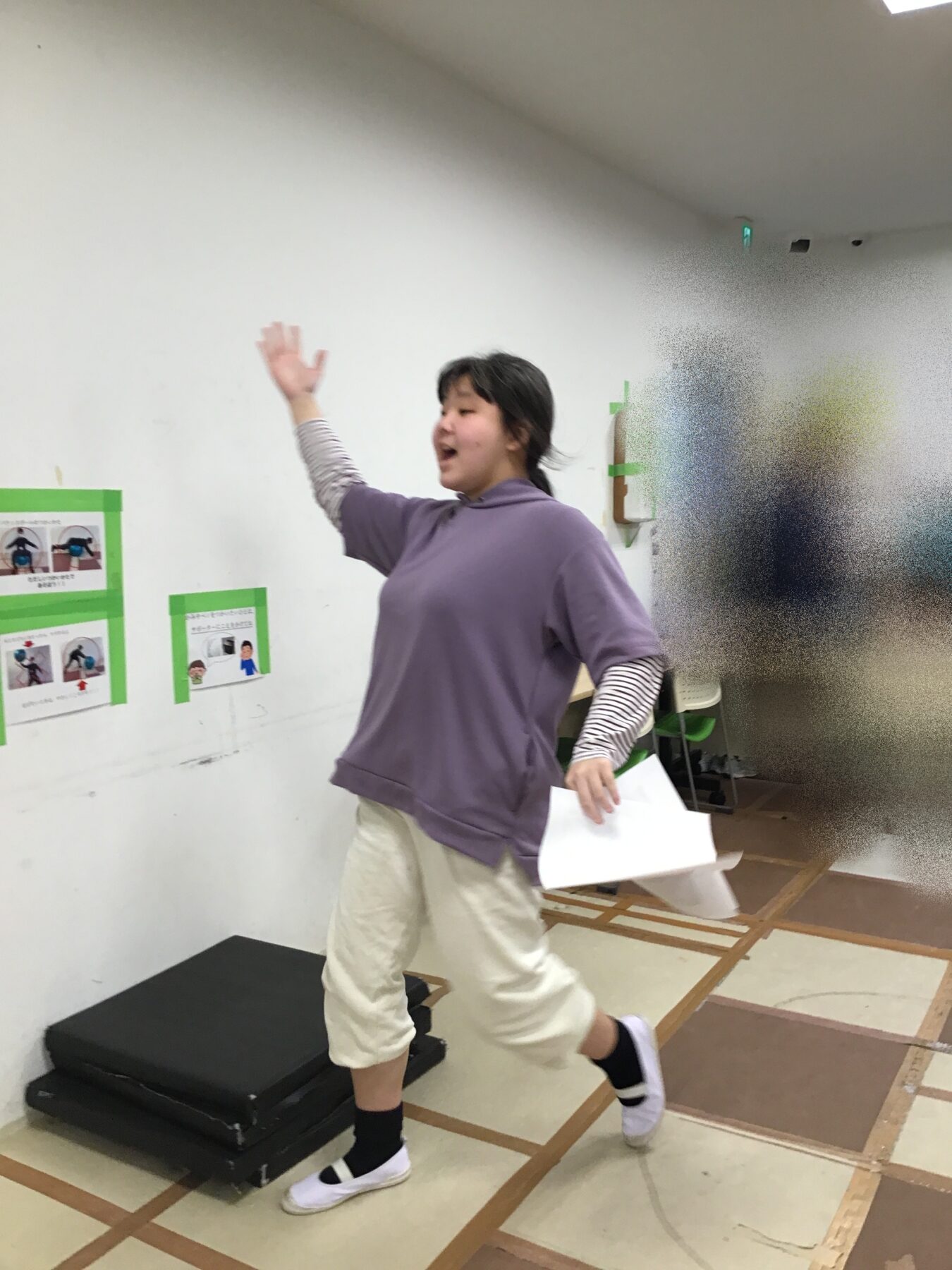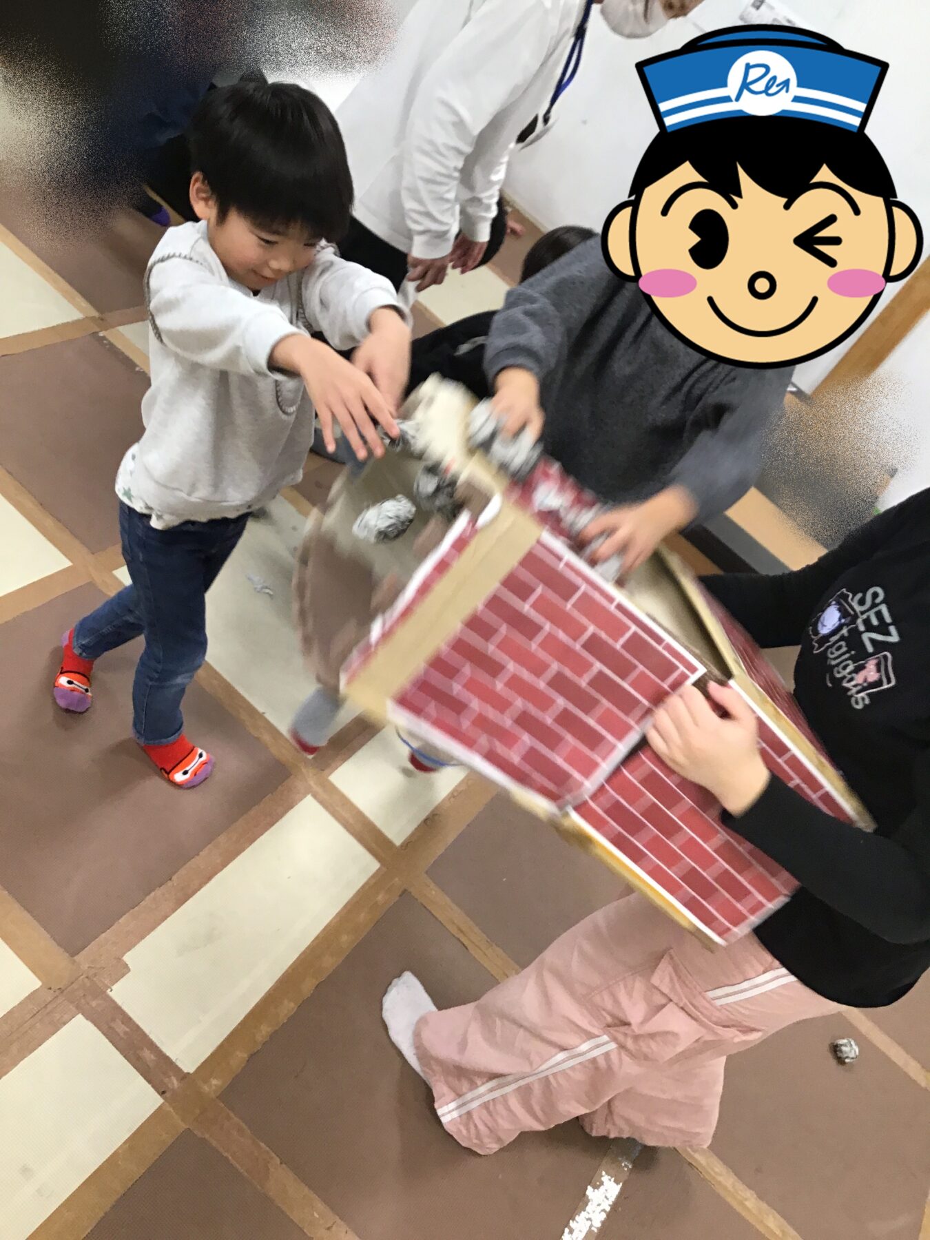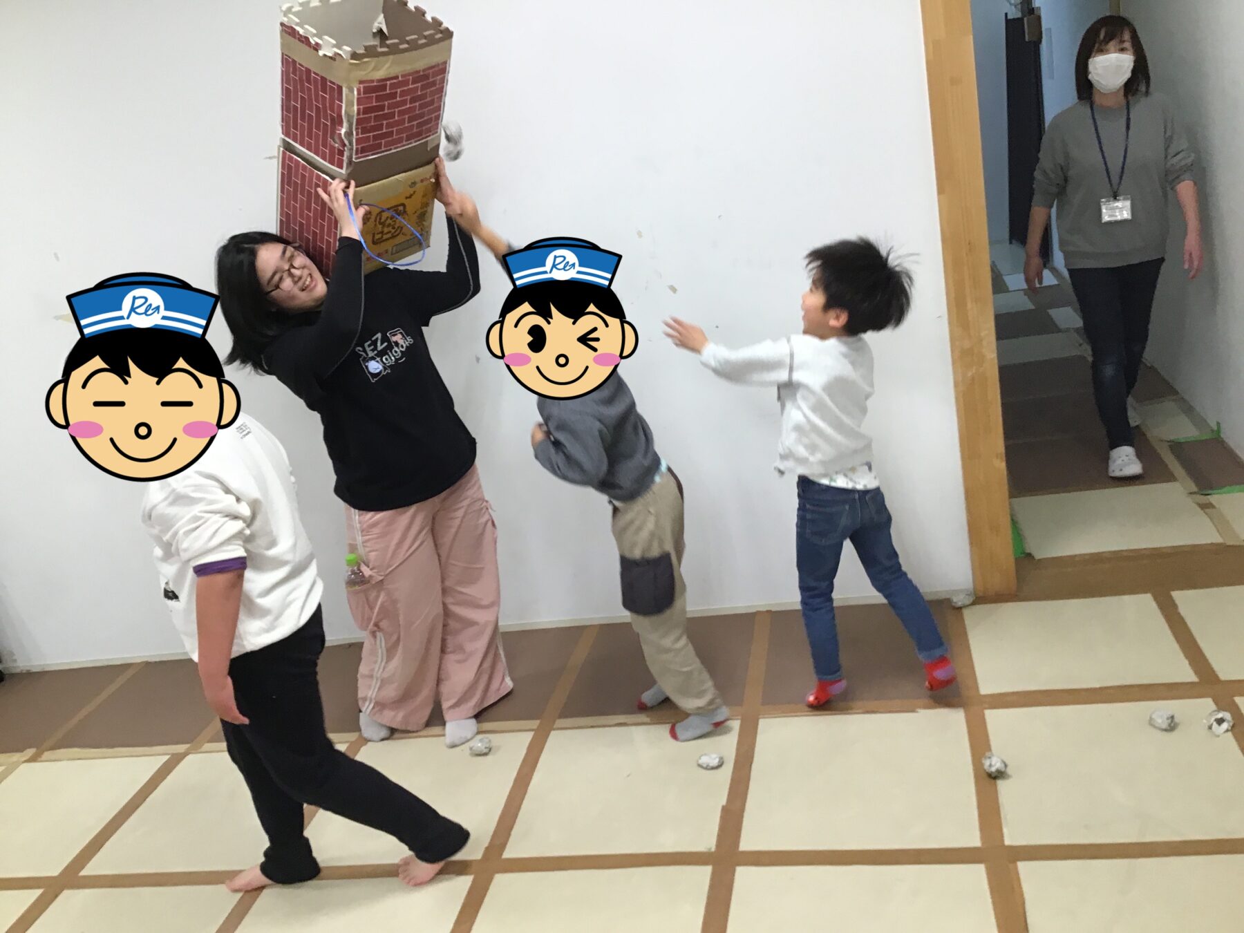かごを追いかけて、新聞紙ボールで玉入れです😊