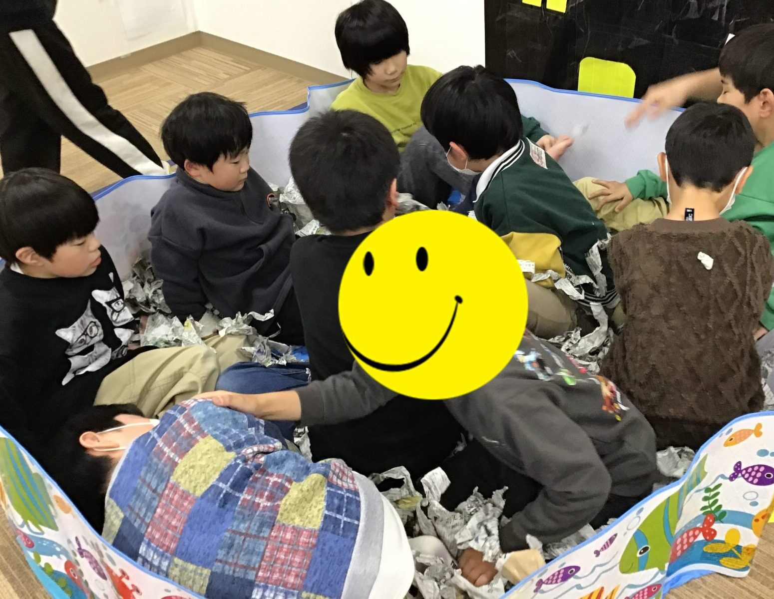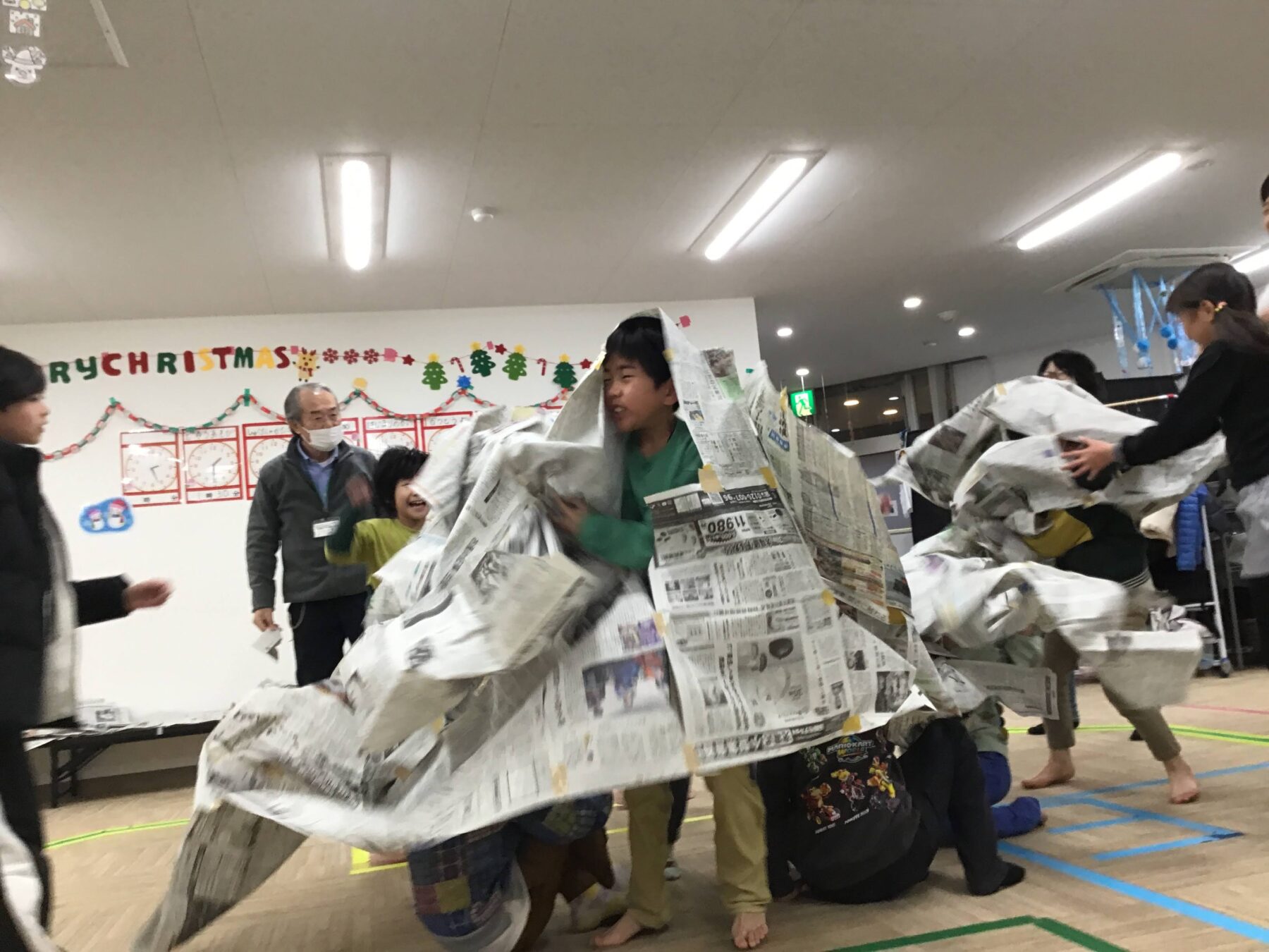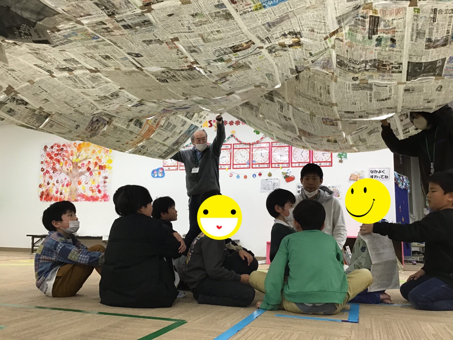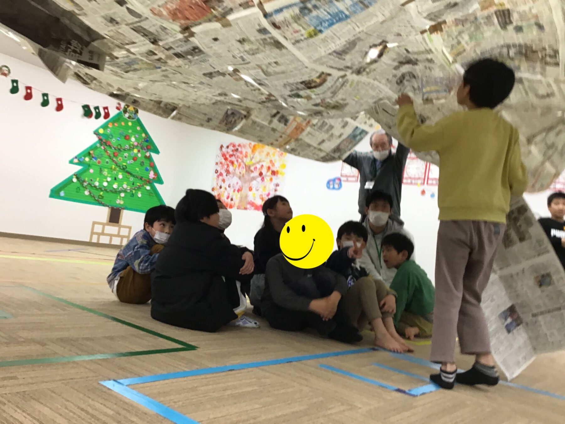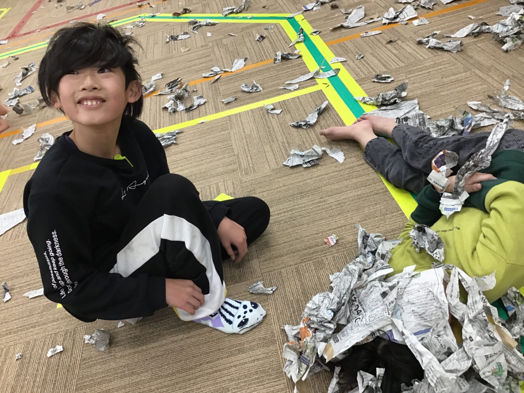 新聞紙を繫げて作った巨大新聞紙の中に入って、みんなで中から一斉に破りました🦕