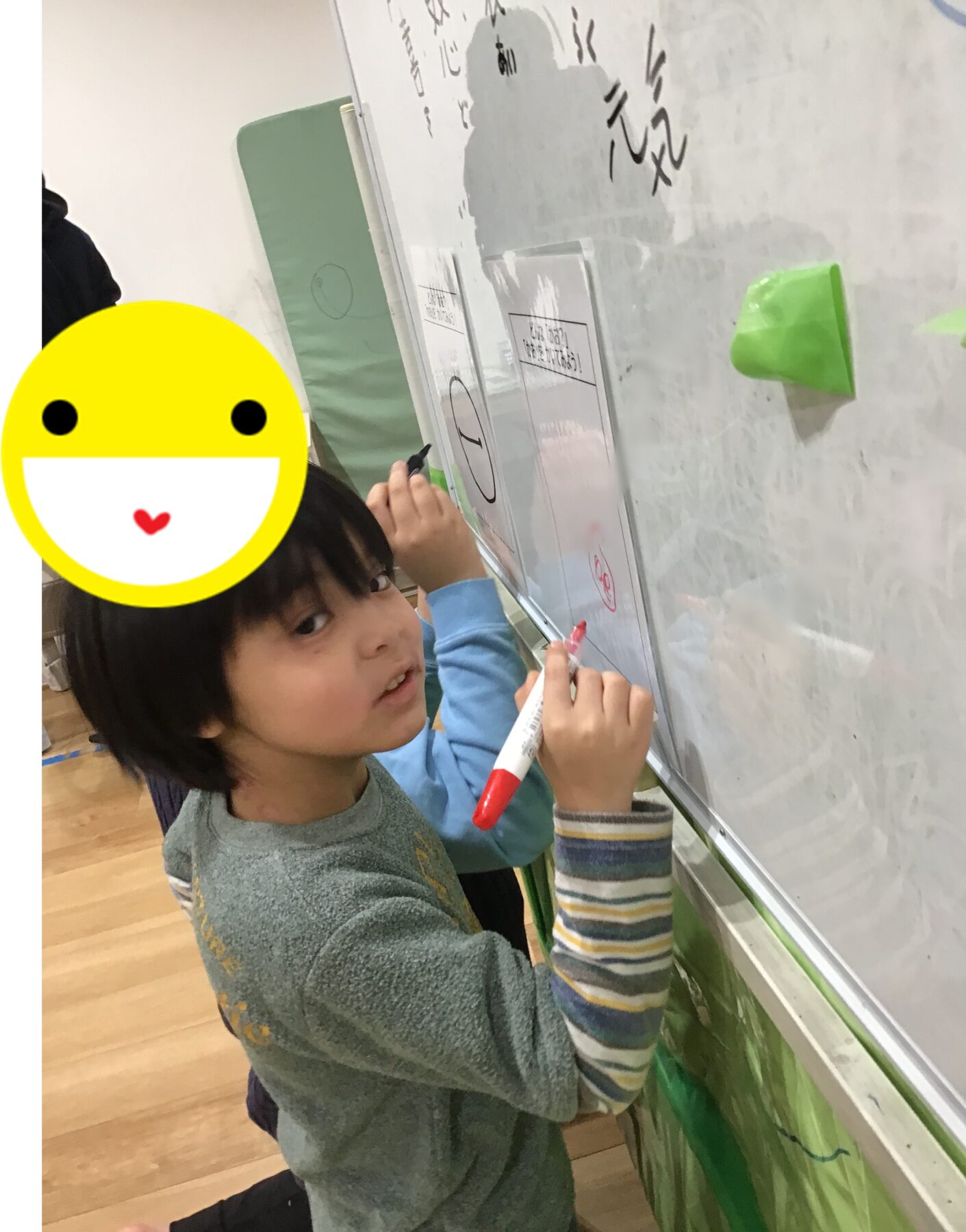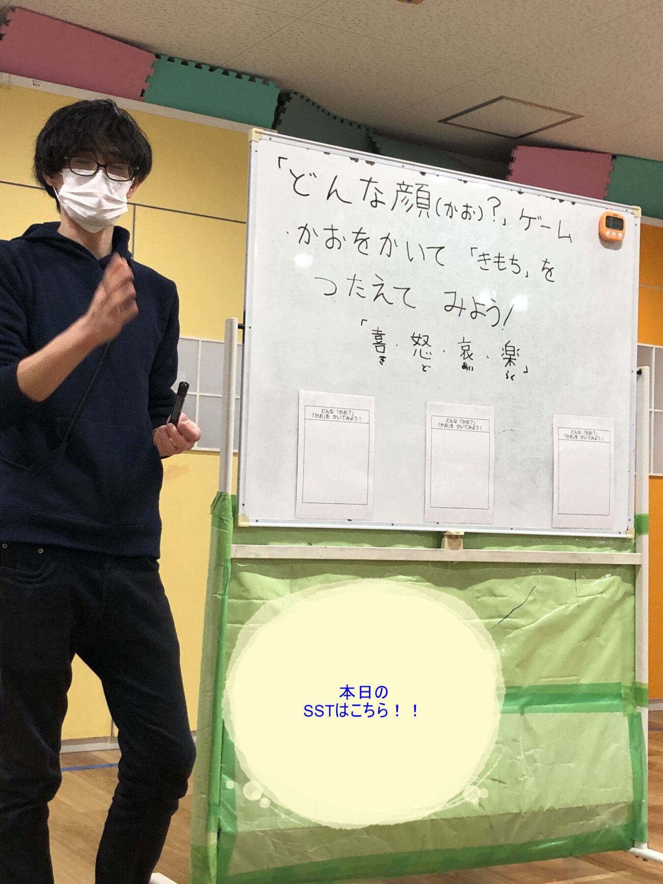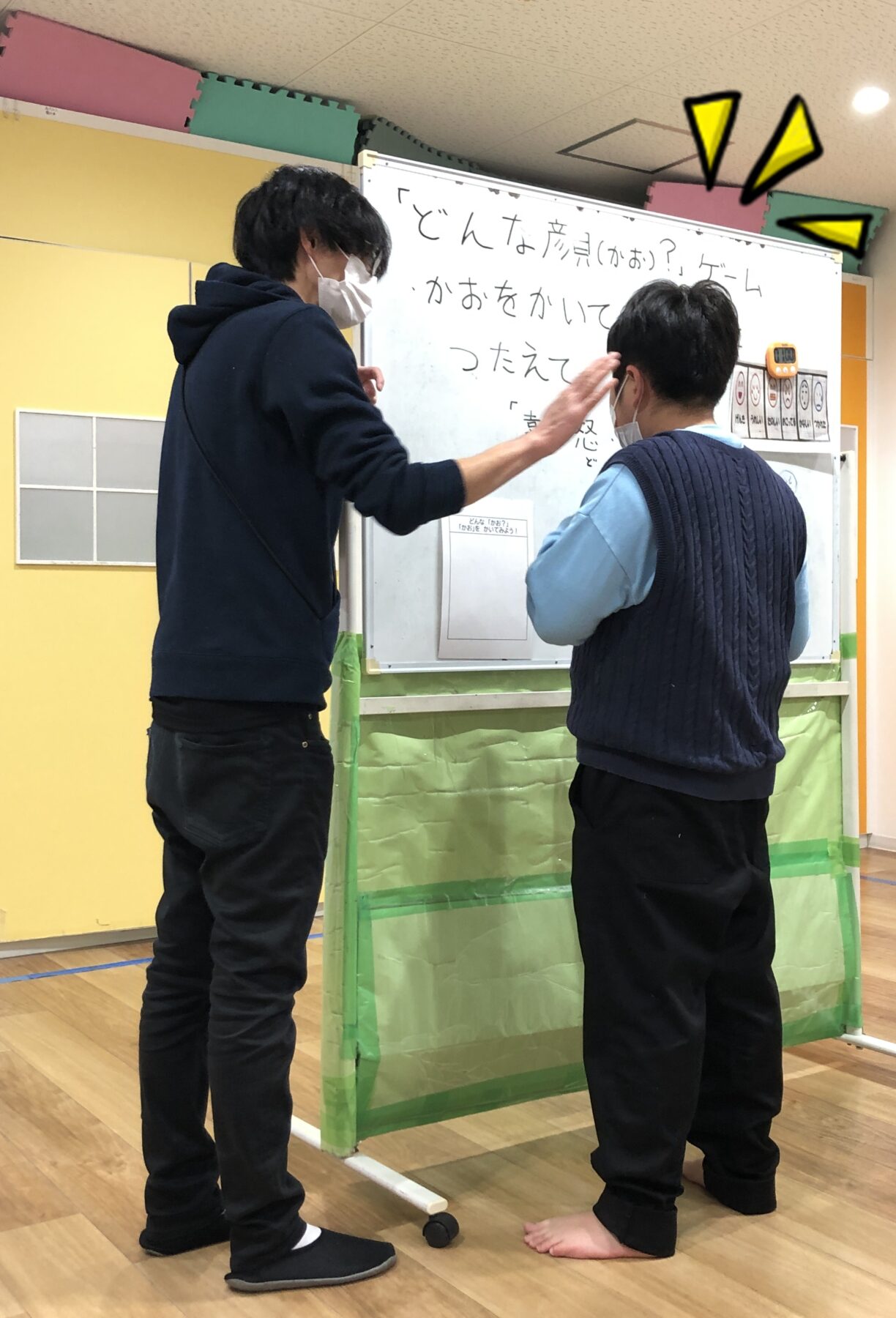 この活動では、サポーター(支援員)が出すお題のシチュエーションをイメージしてもらい、その時にするであろう「表情(かお)」をホワイトボードに描いてもらいます。