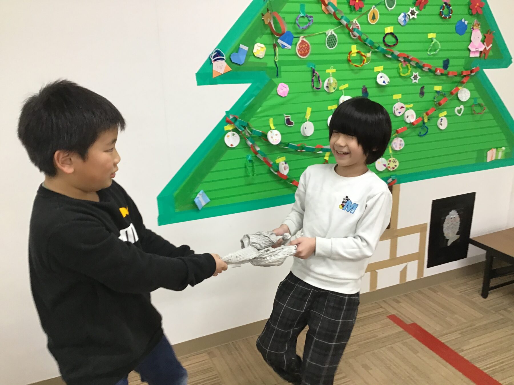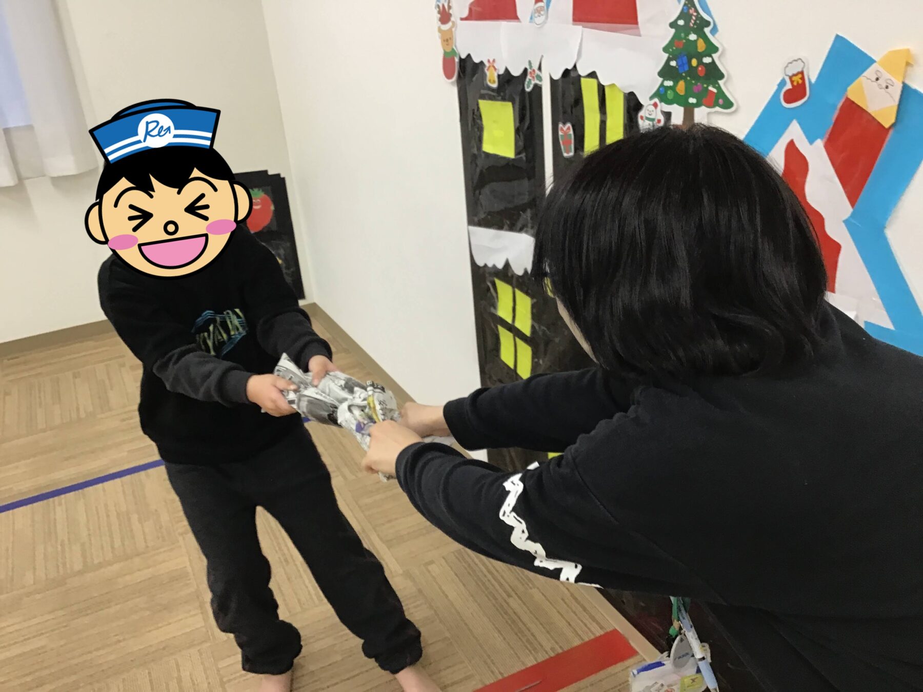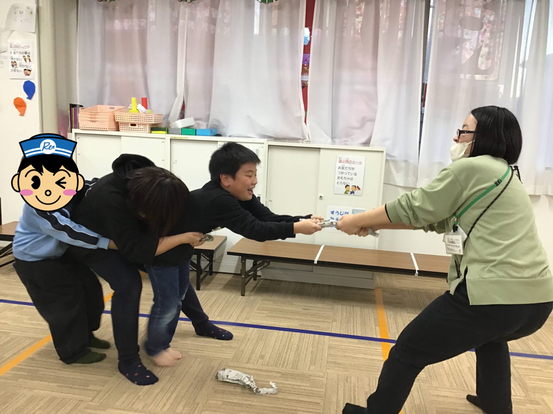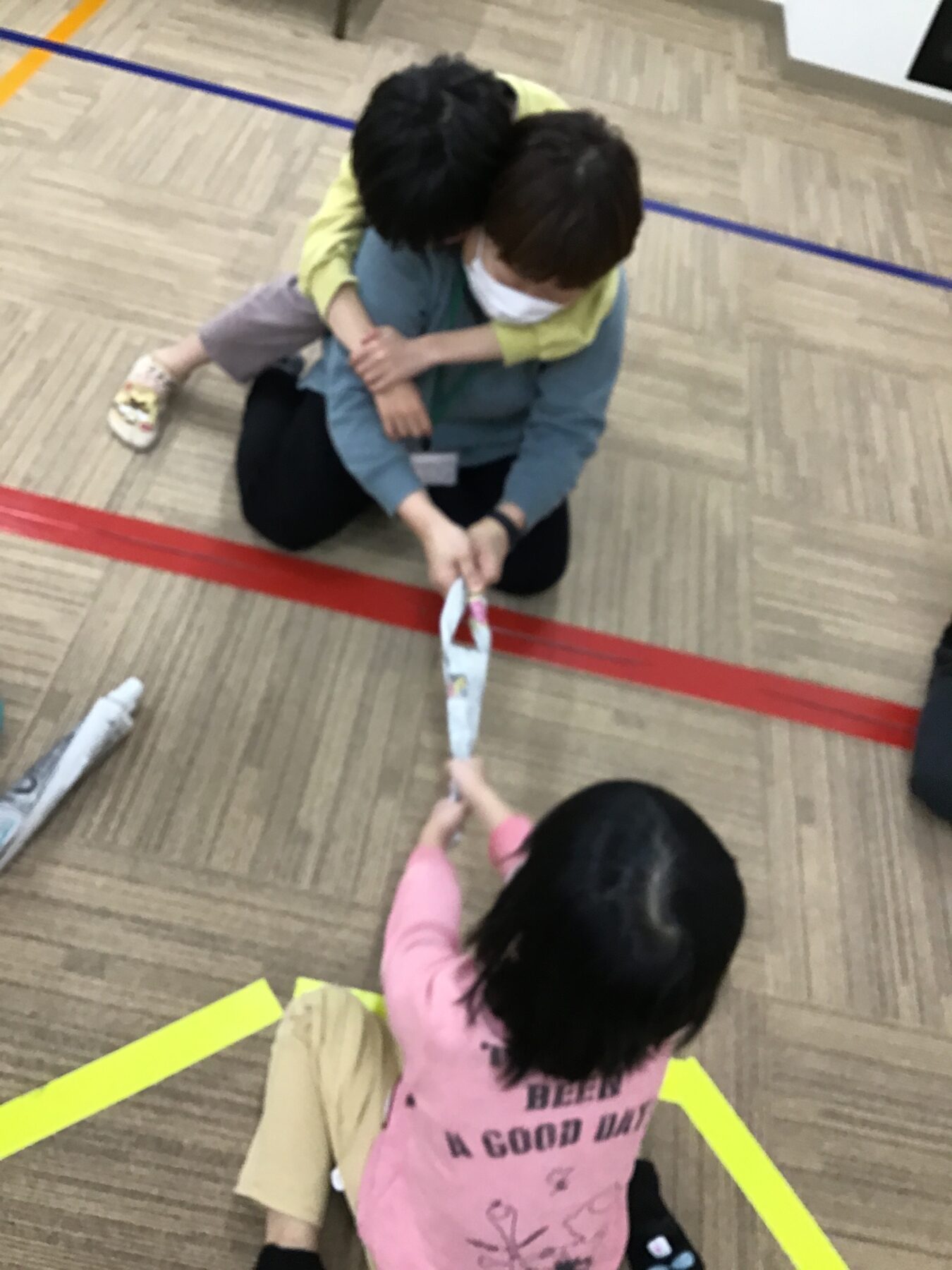 お友だちやサポーターと綱引きをしました。何回もチャレンジして他のお友だちやサポーターと競って楽しんでおりました。
