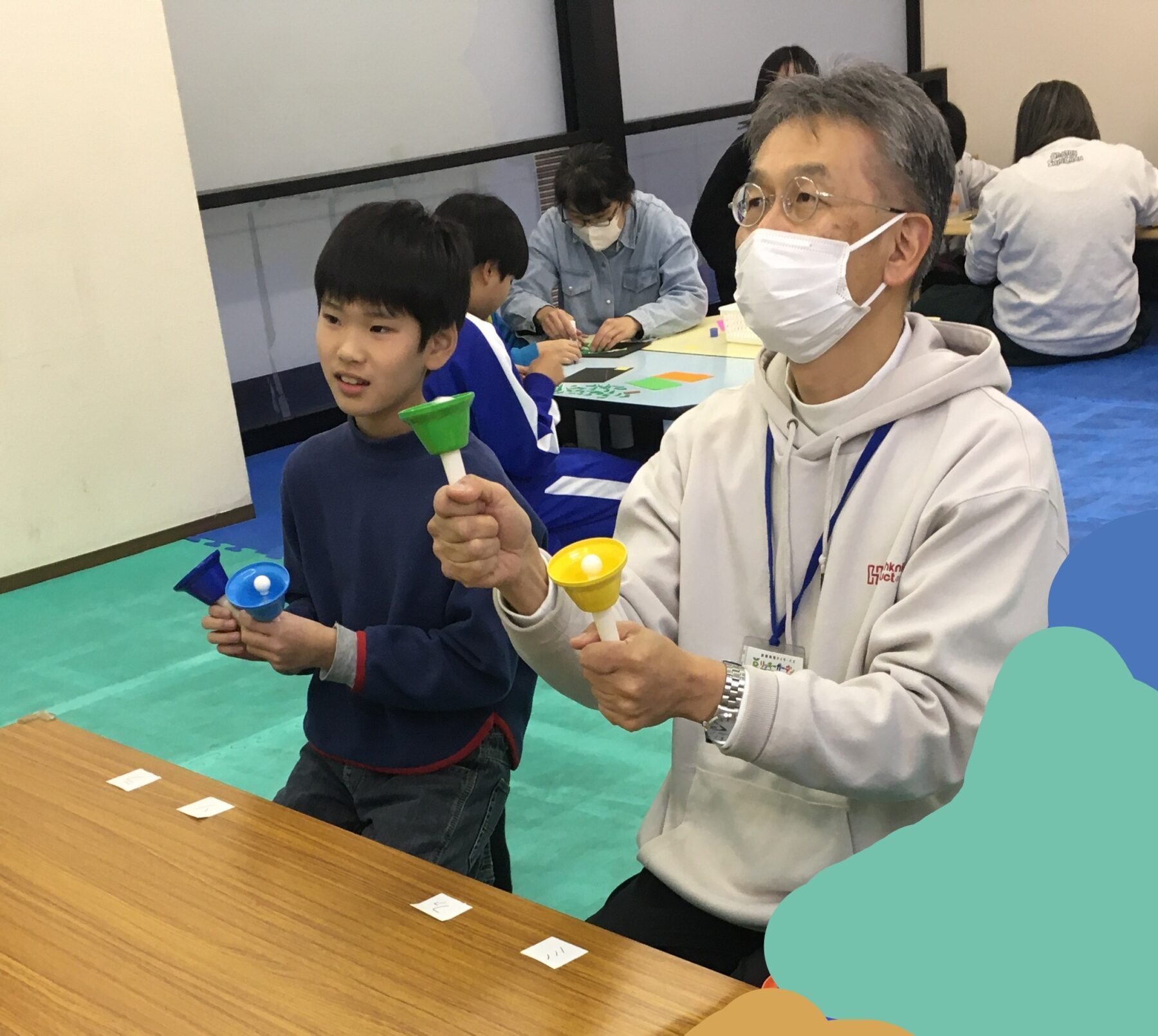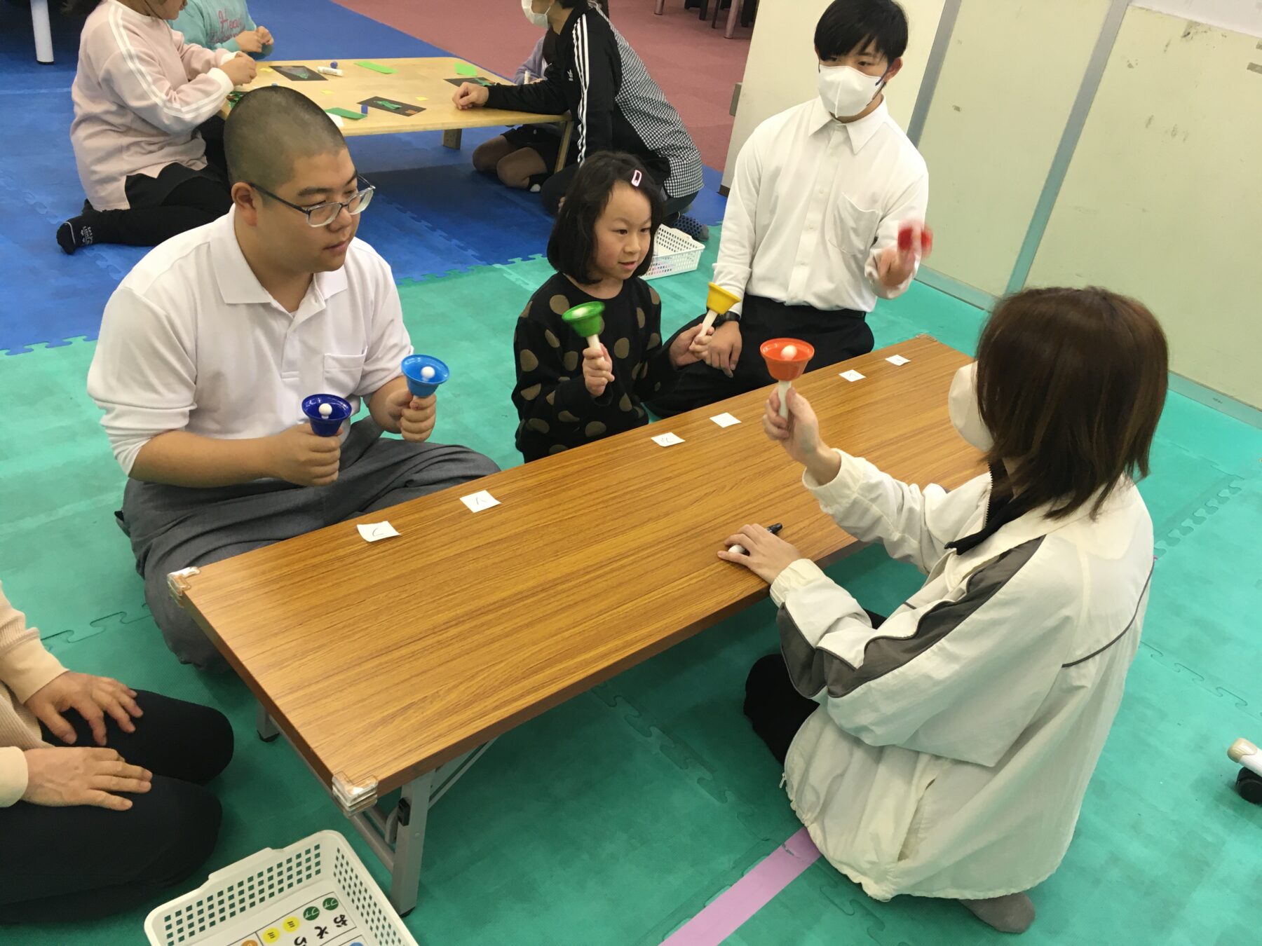 「次は〇の音だよ」と声を掛け合いながら、真剣な表情でベルを振るお友だち🔔