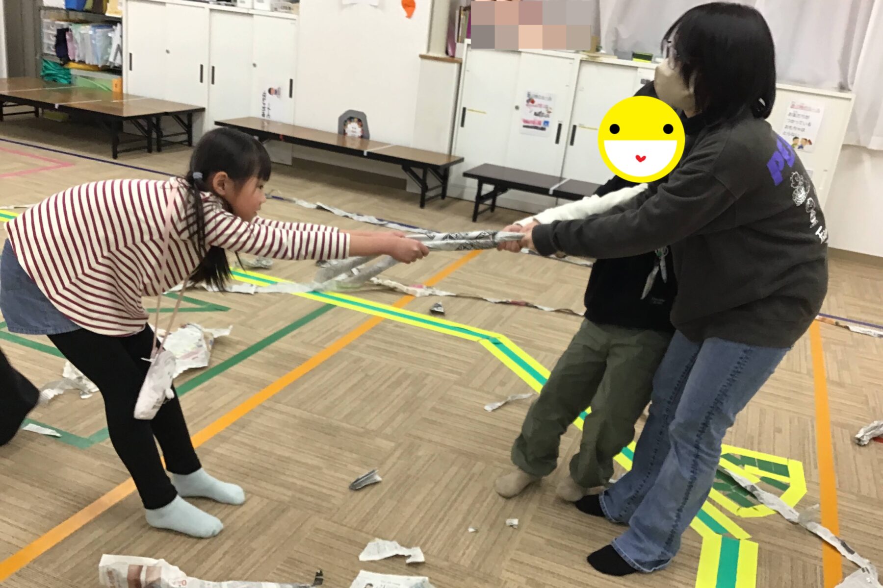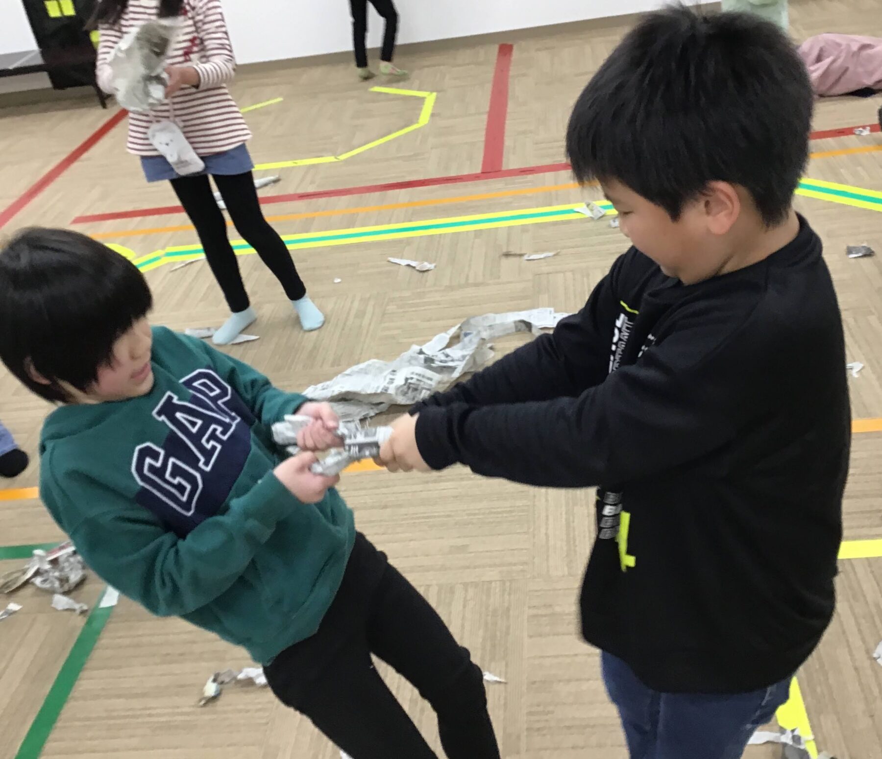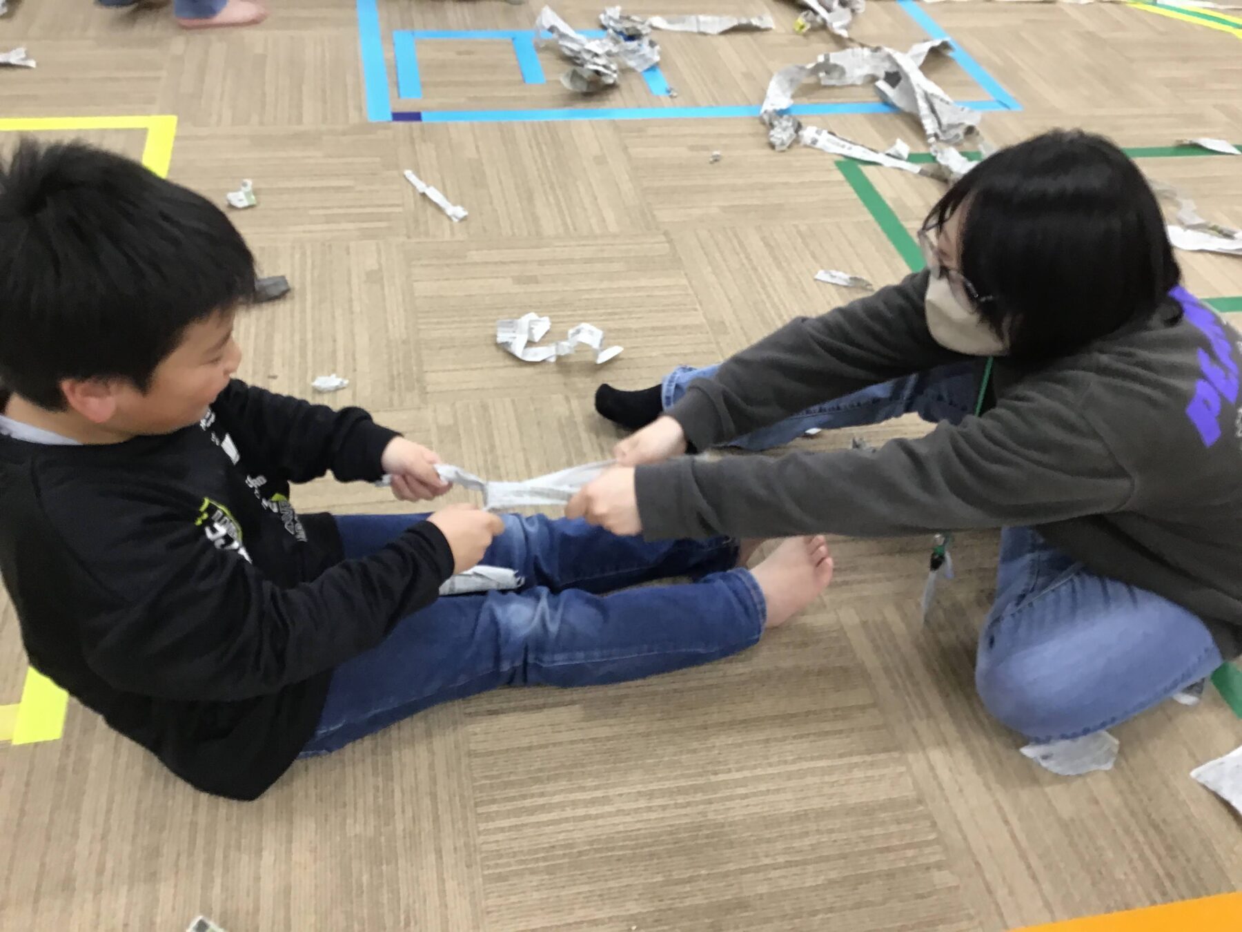 まずは、座った状態で新聞紙綱引きをしました!