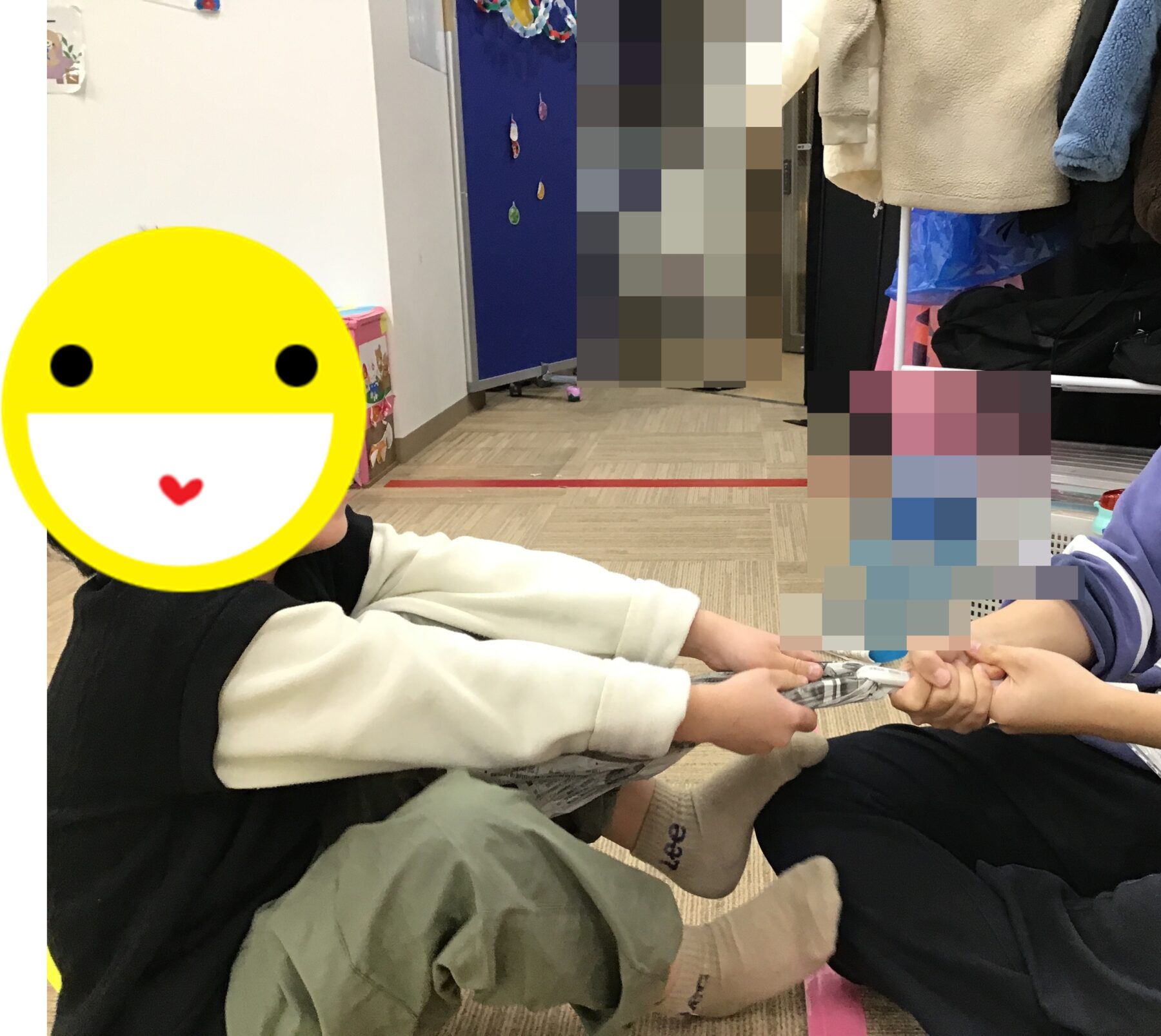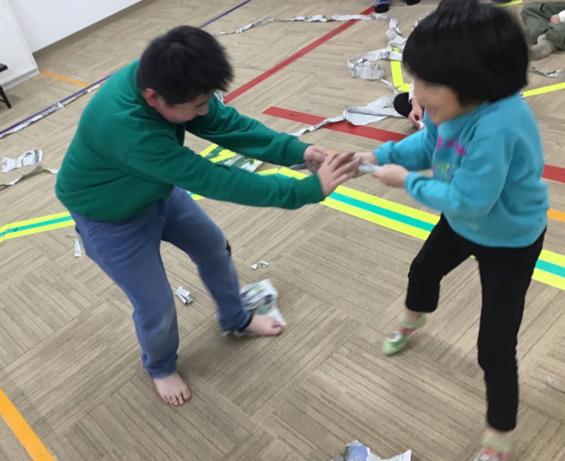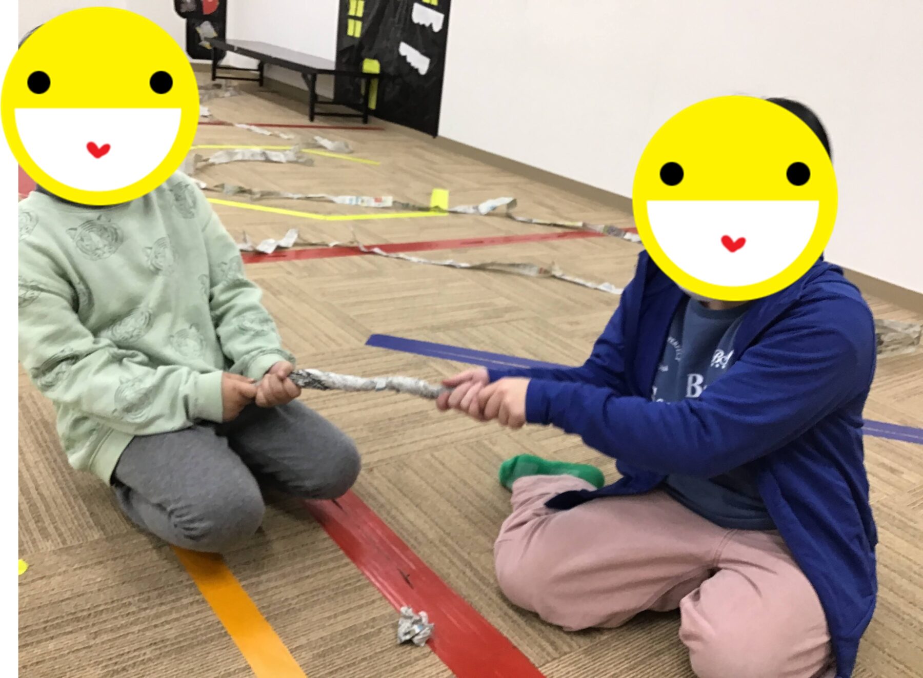 まずは、座った状態で新聞紙綱引きをしました!