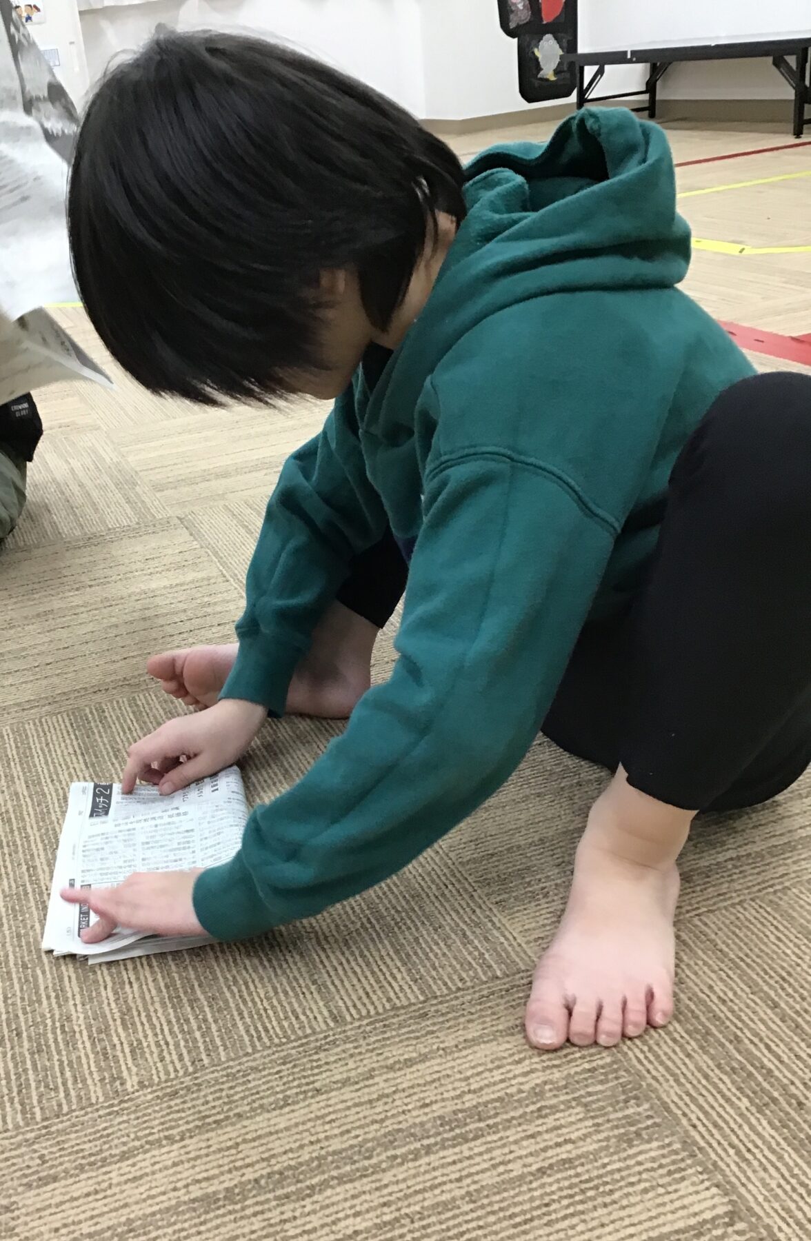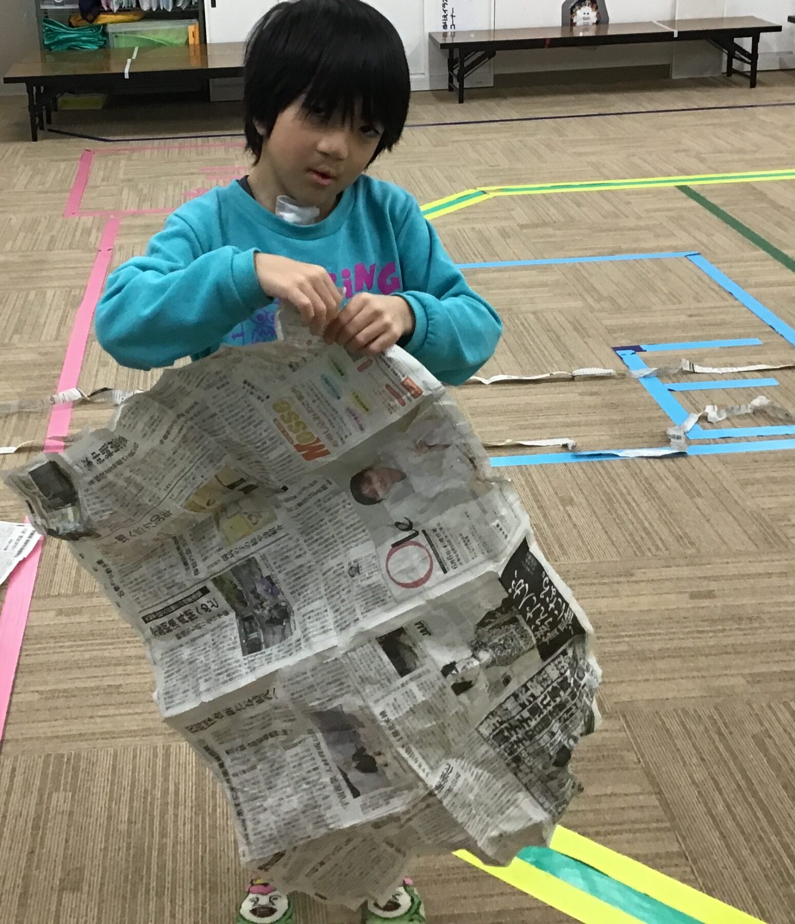 1枚の新聞紙を破き、どれだだけ長くできるかに挑戦!