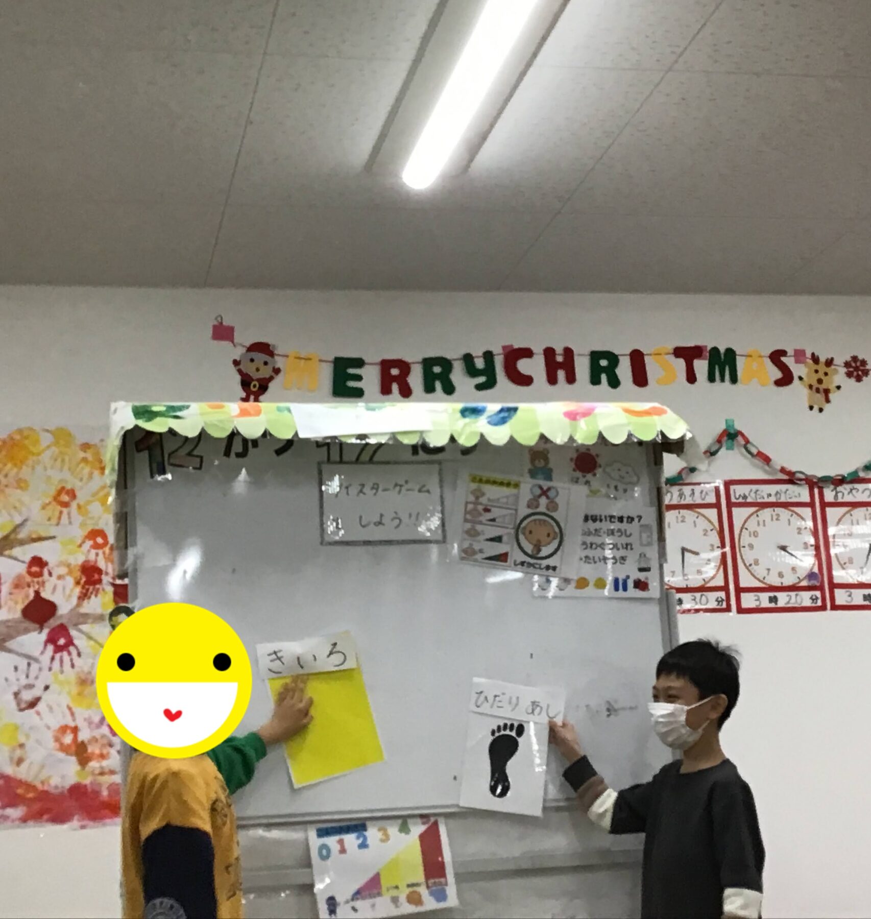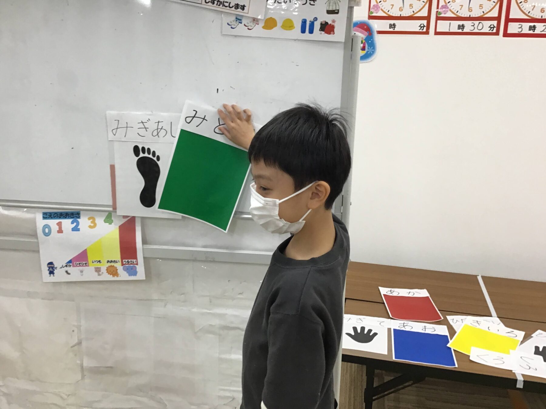 今回は、お題を言葉で伝えるほかに、「手・足・色」をホワイトボードに掲示して目で見ることも含めてみました👀