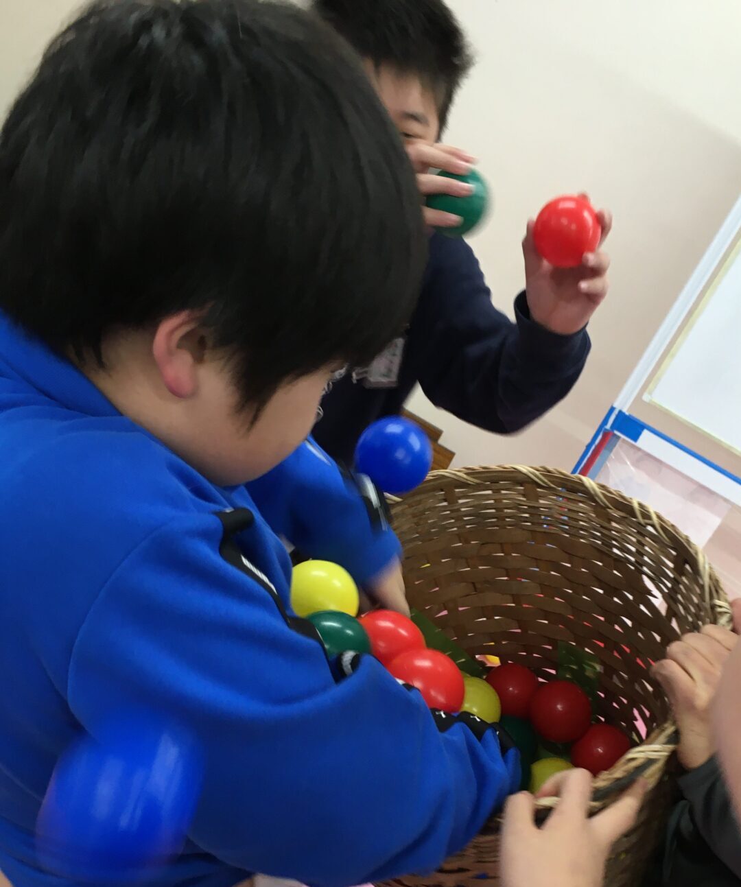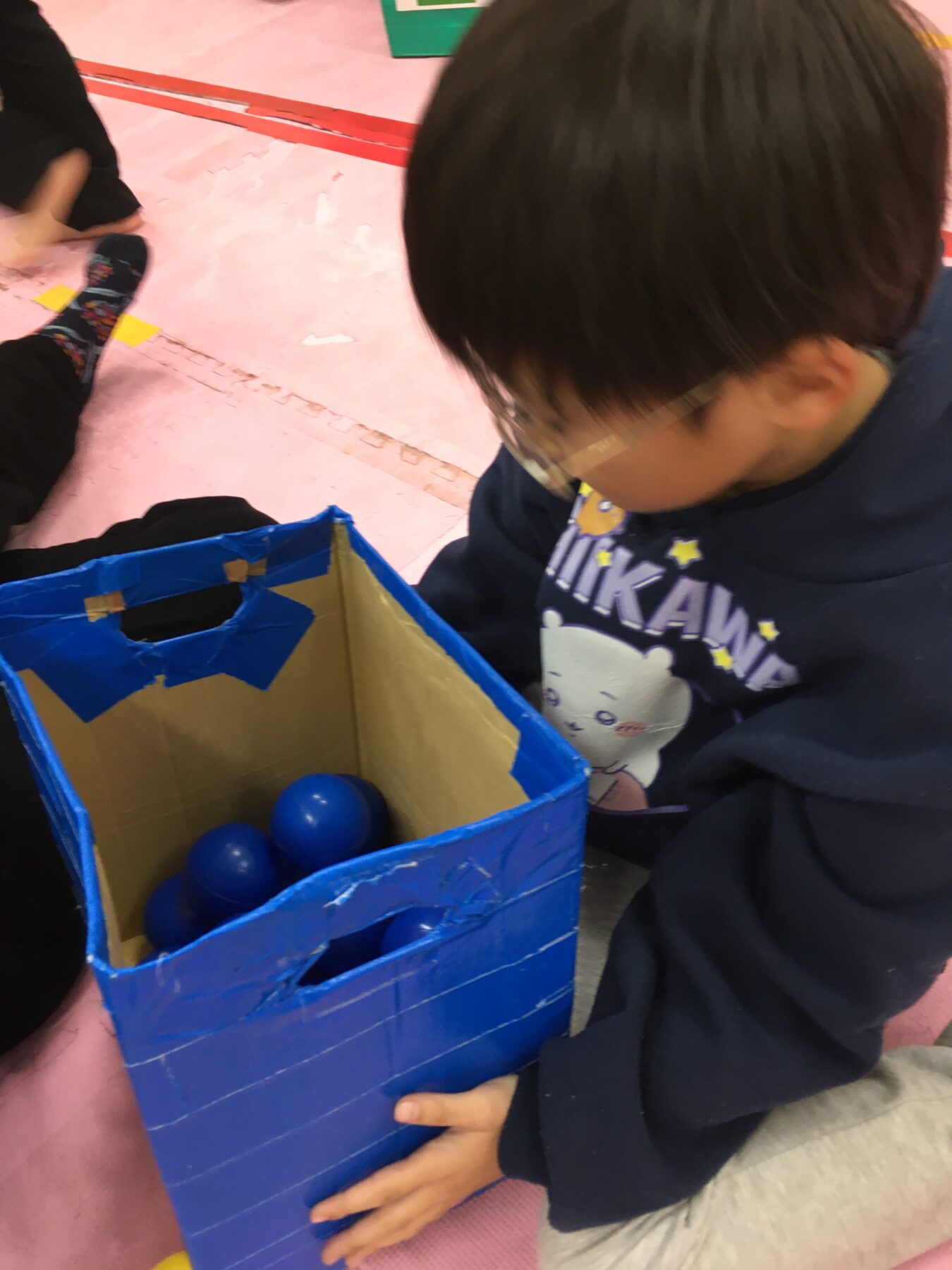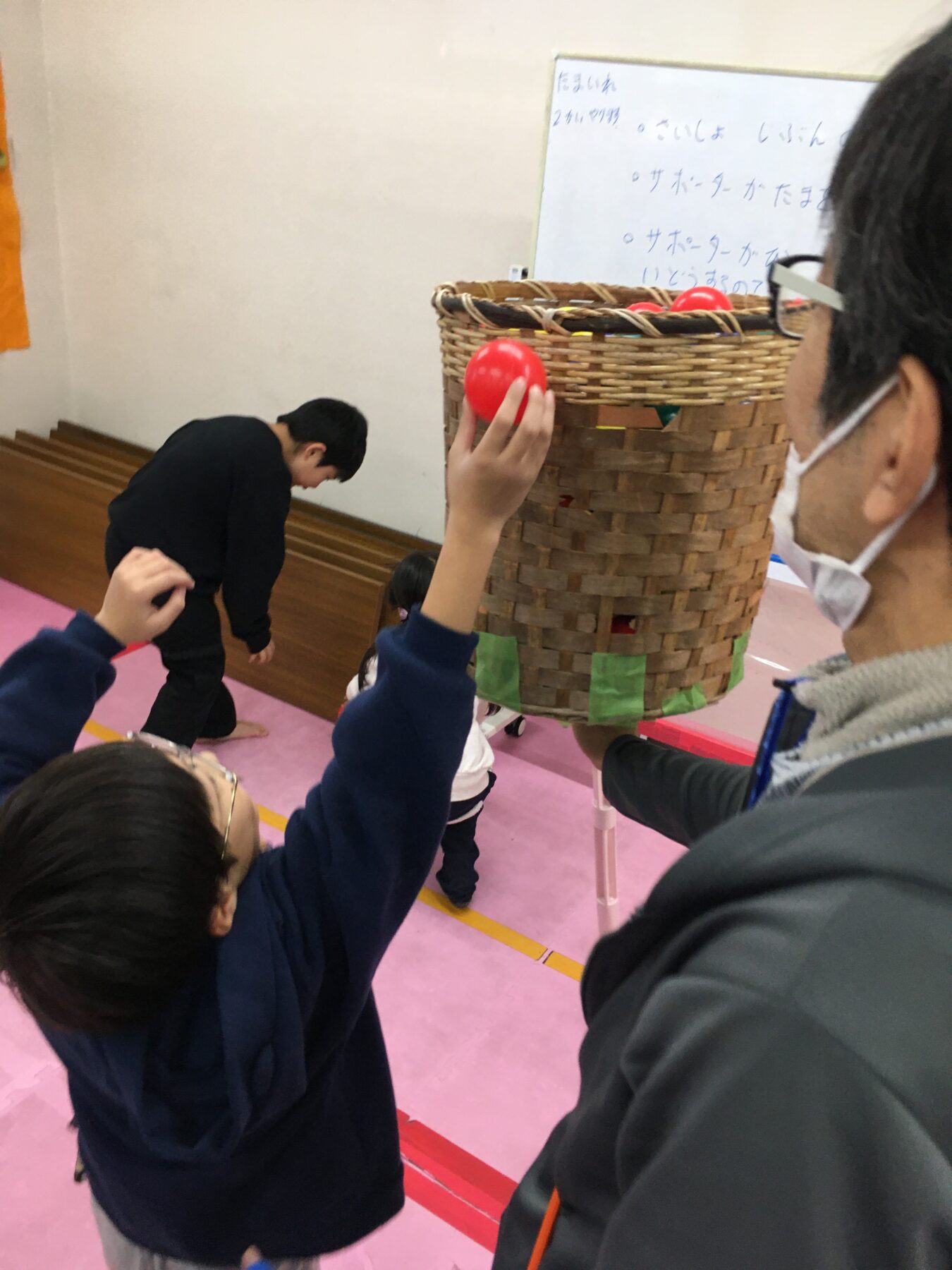今日の玉入れは「カゴに入れよう」から始めるよ。