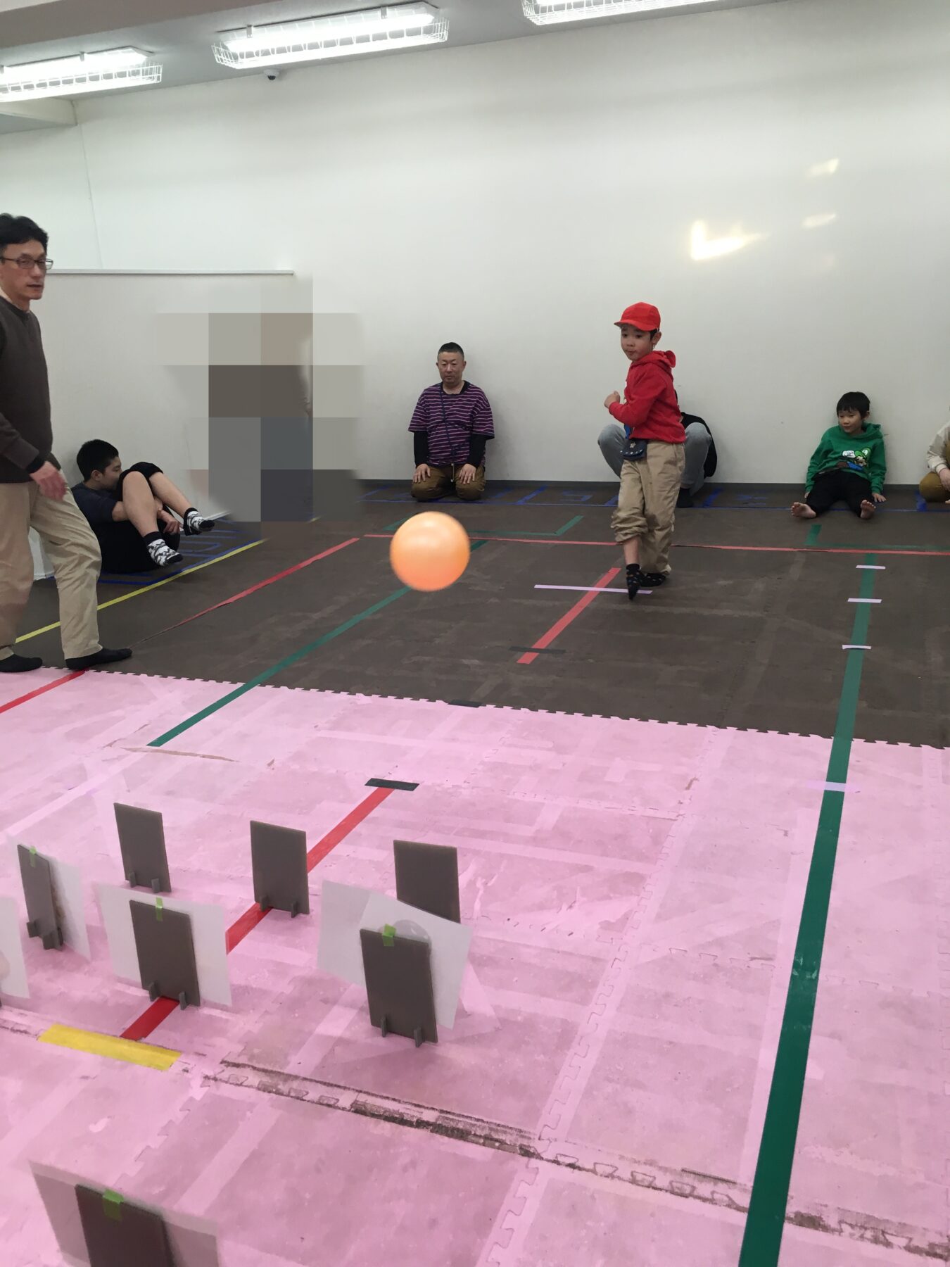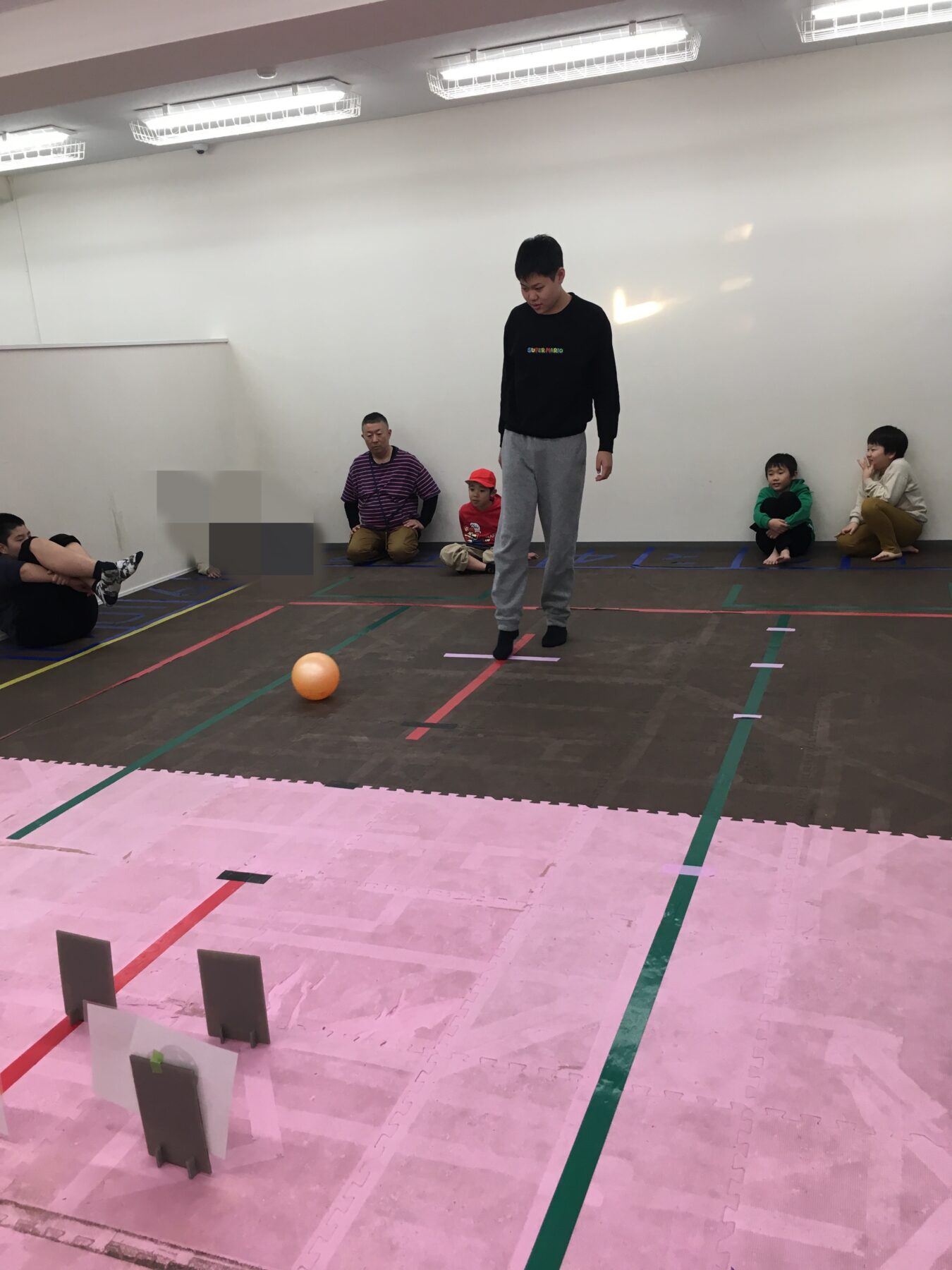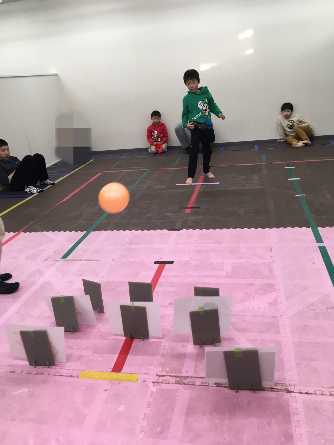 今日のサッカー運動は「キックで的当て」だよ。