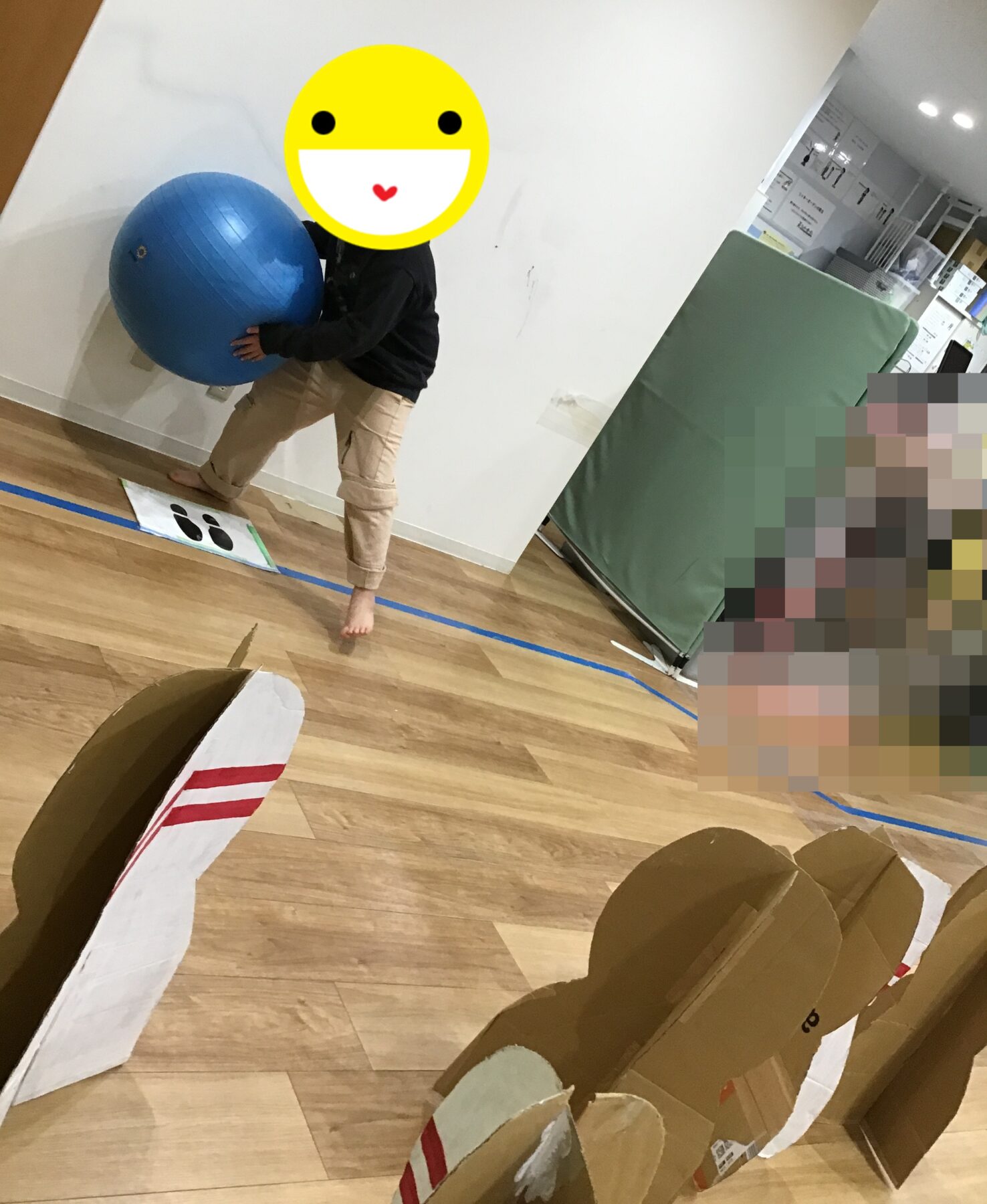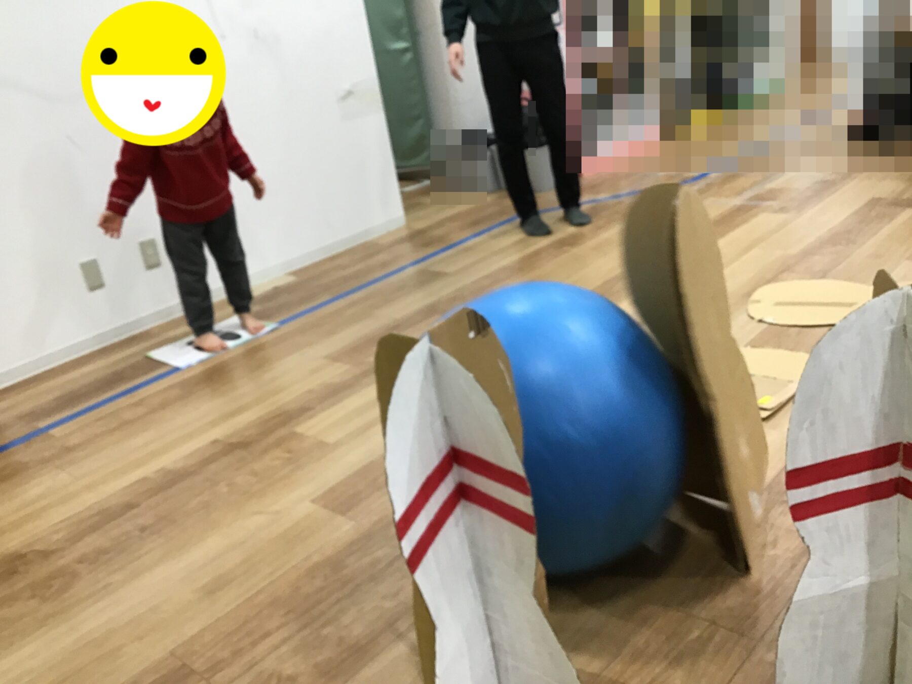 お友達とタイミングを合わせてボールを放ち、見事なストライク!
