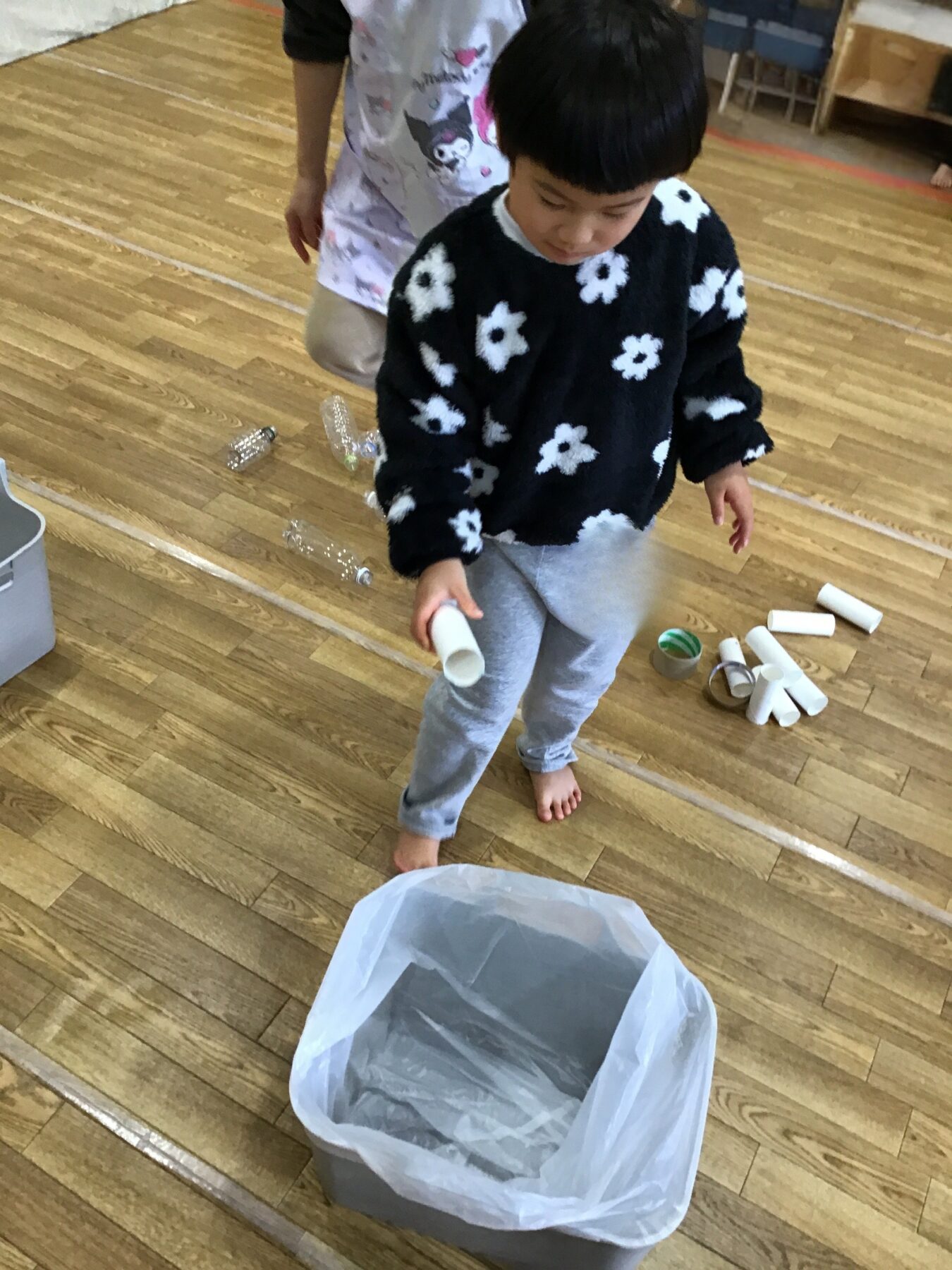 バラバラに落ちているゴミ(トイレットペーパーの芯やペットボトル)を、「燃えるゴミ」と「ペットボトル」の正しい箱に分けていきます。