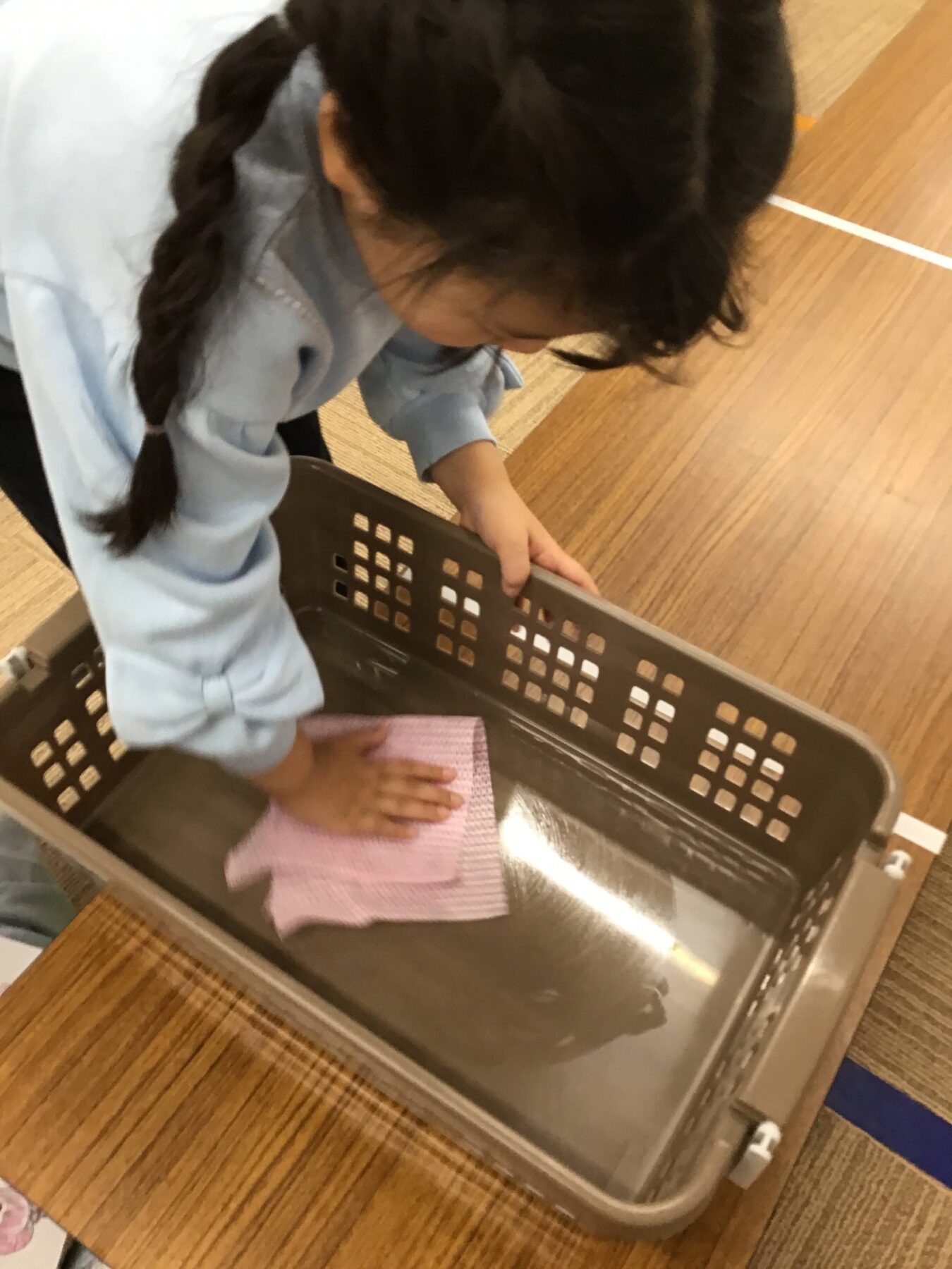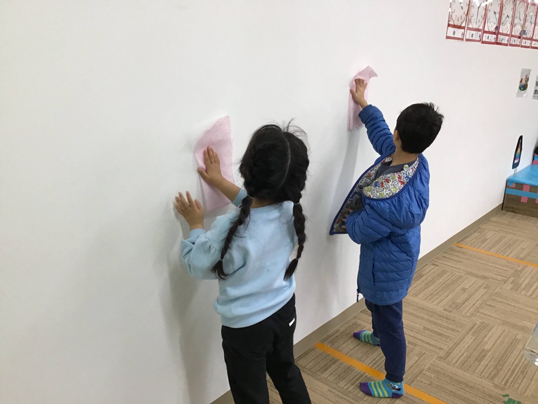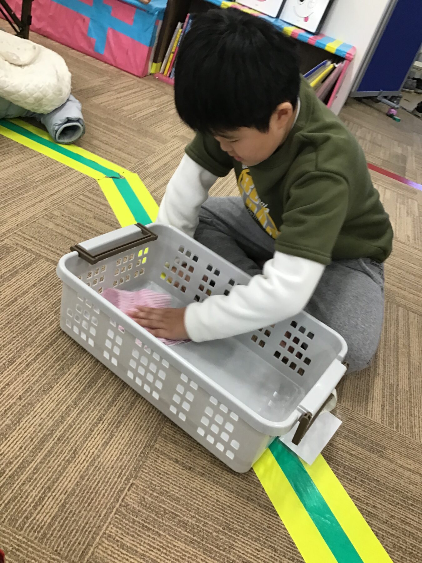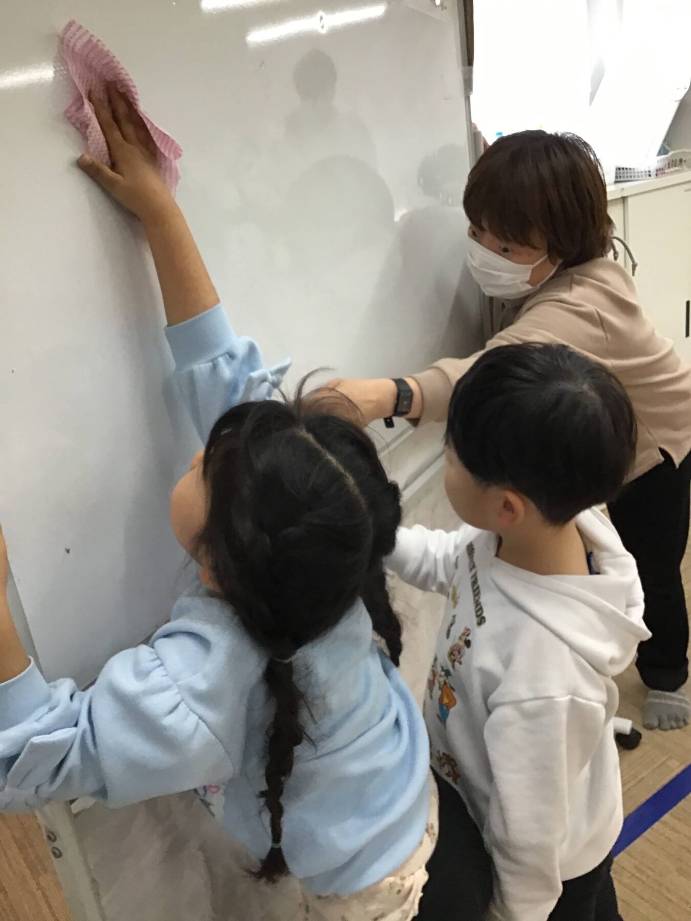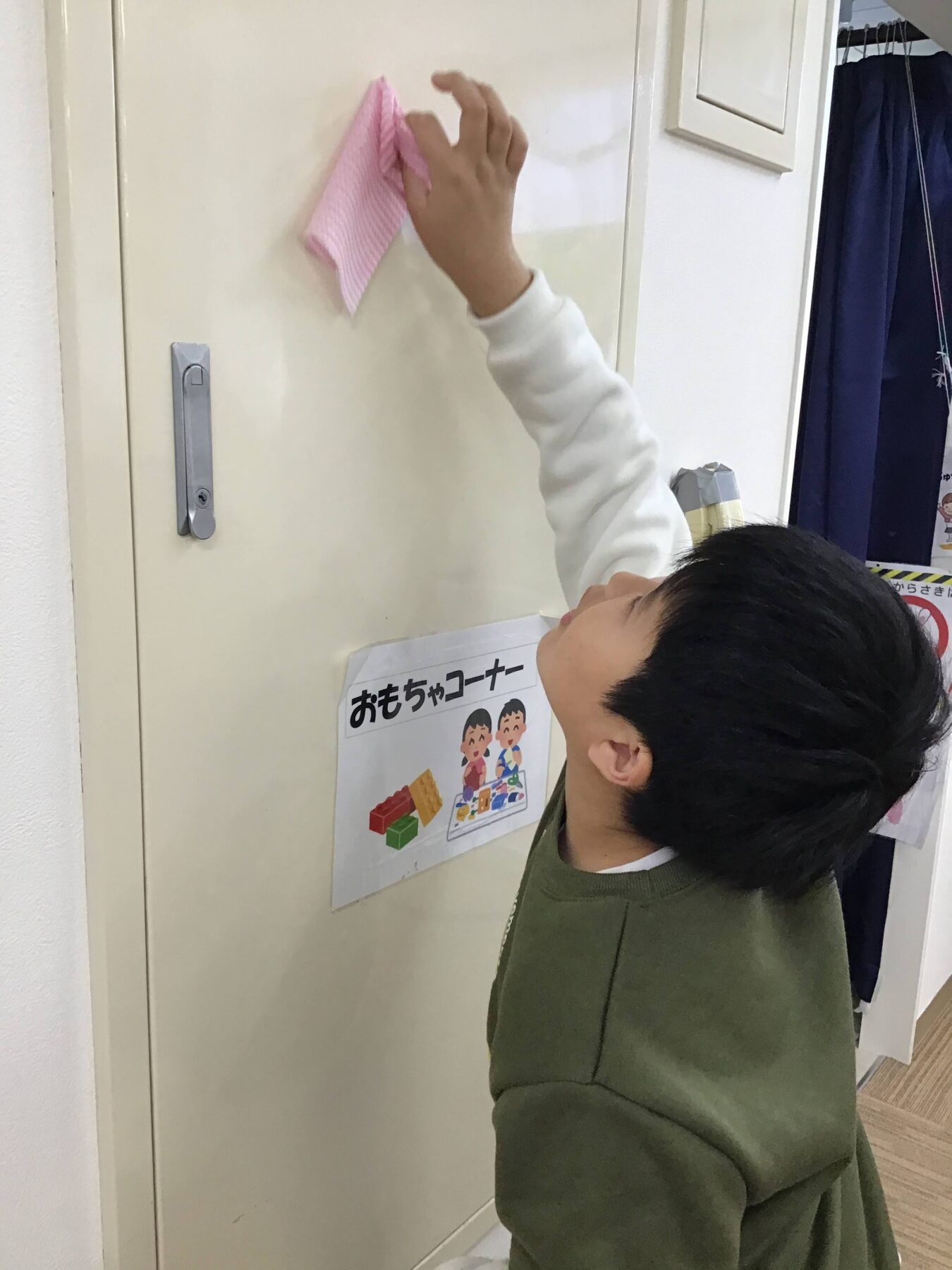 まずはクリスマスの壁面等を片付けたり、自分たちが使ったロッカーや壁・棚・窓・玄関等たくさんお掃除してくださいました。