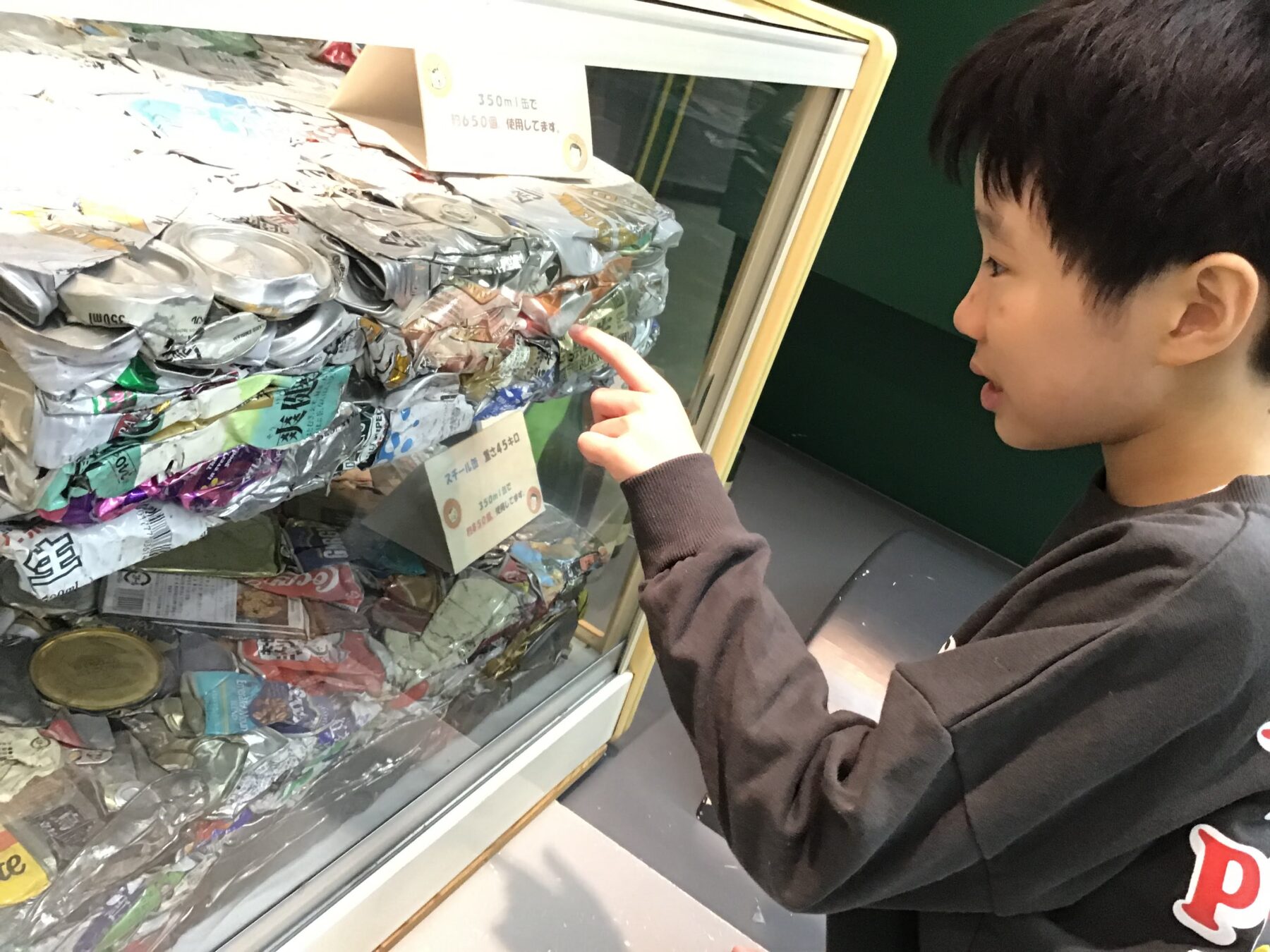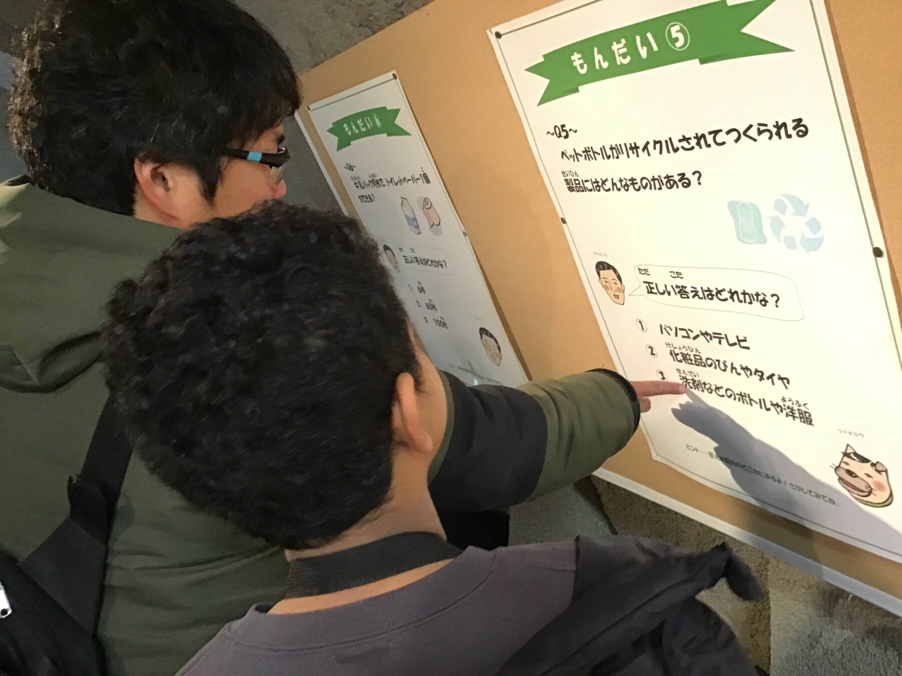 中に入ると、ごみを再利用した物やパネルクイズなど、たくさんの展示品がありました。