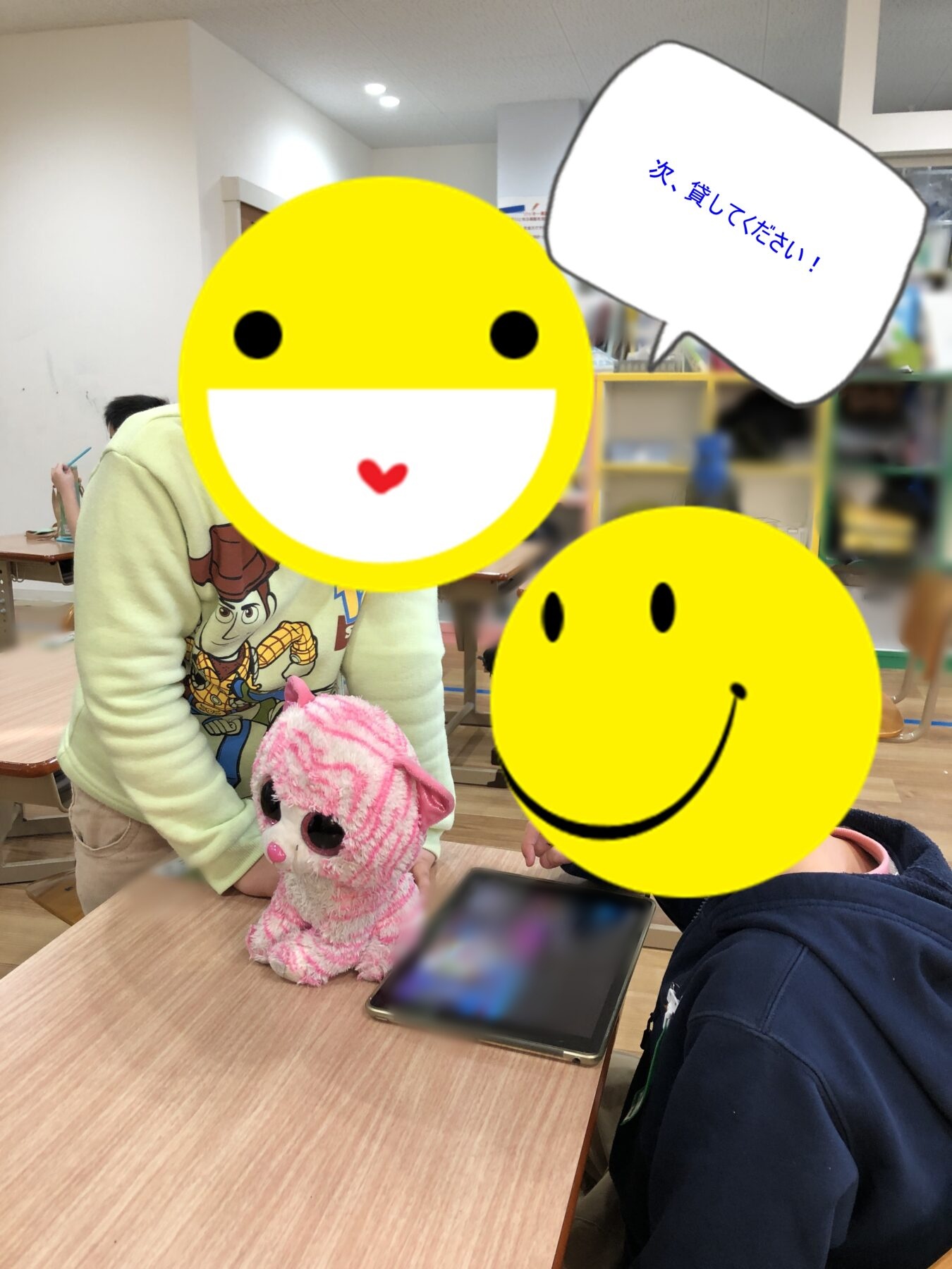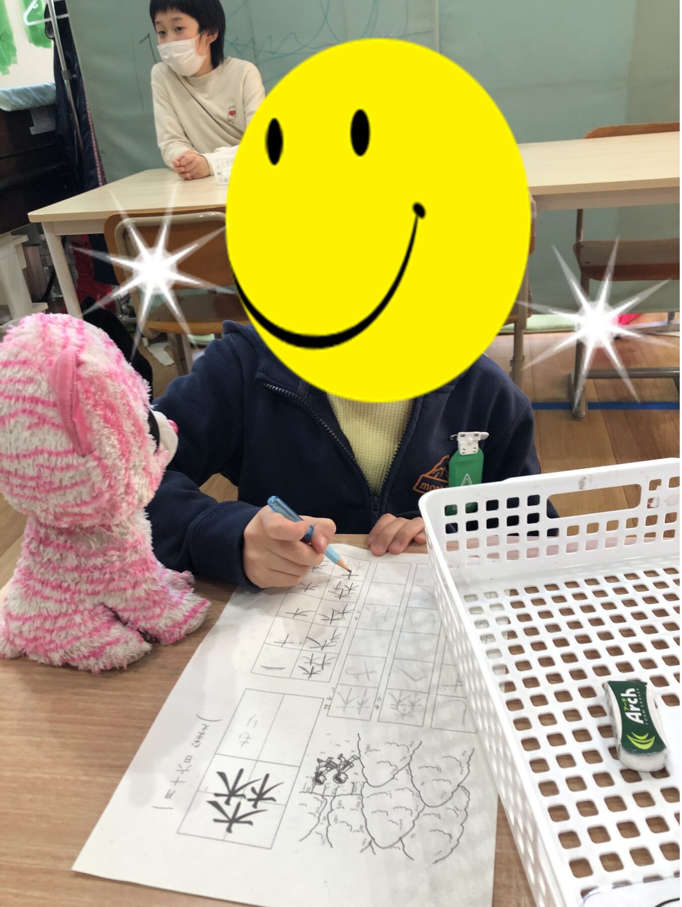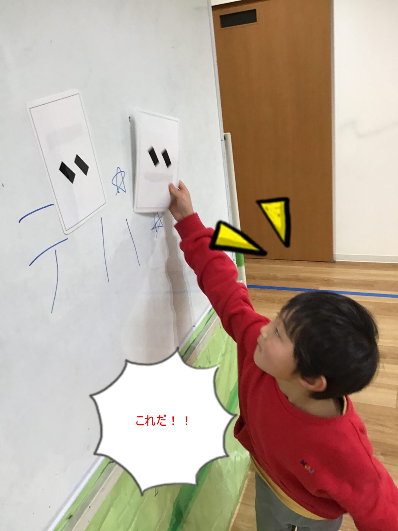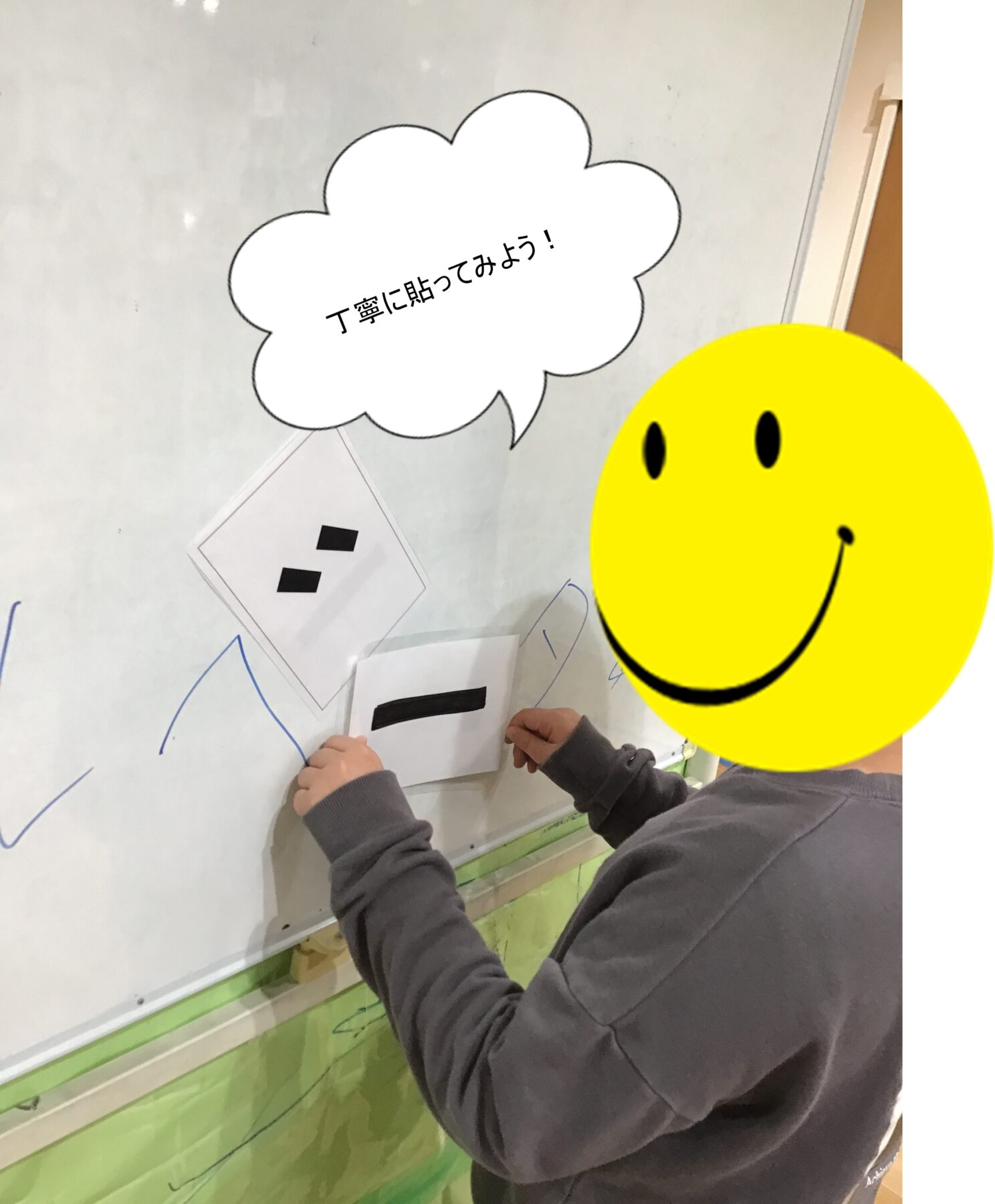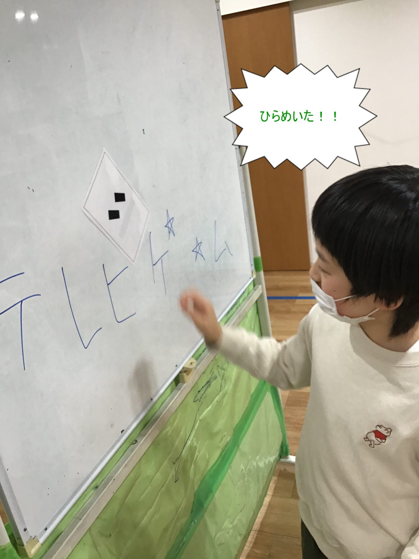 「ハンバーガー」などの単語から「゛」「゜」「ー」が除かれた問題を、足りないものをお友達やサポーターと考えて・・・