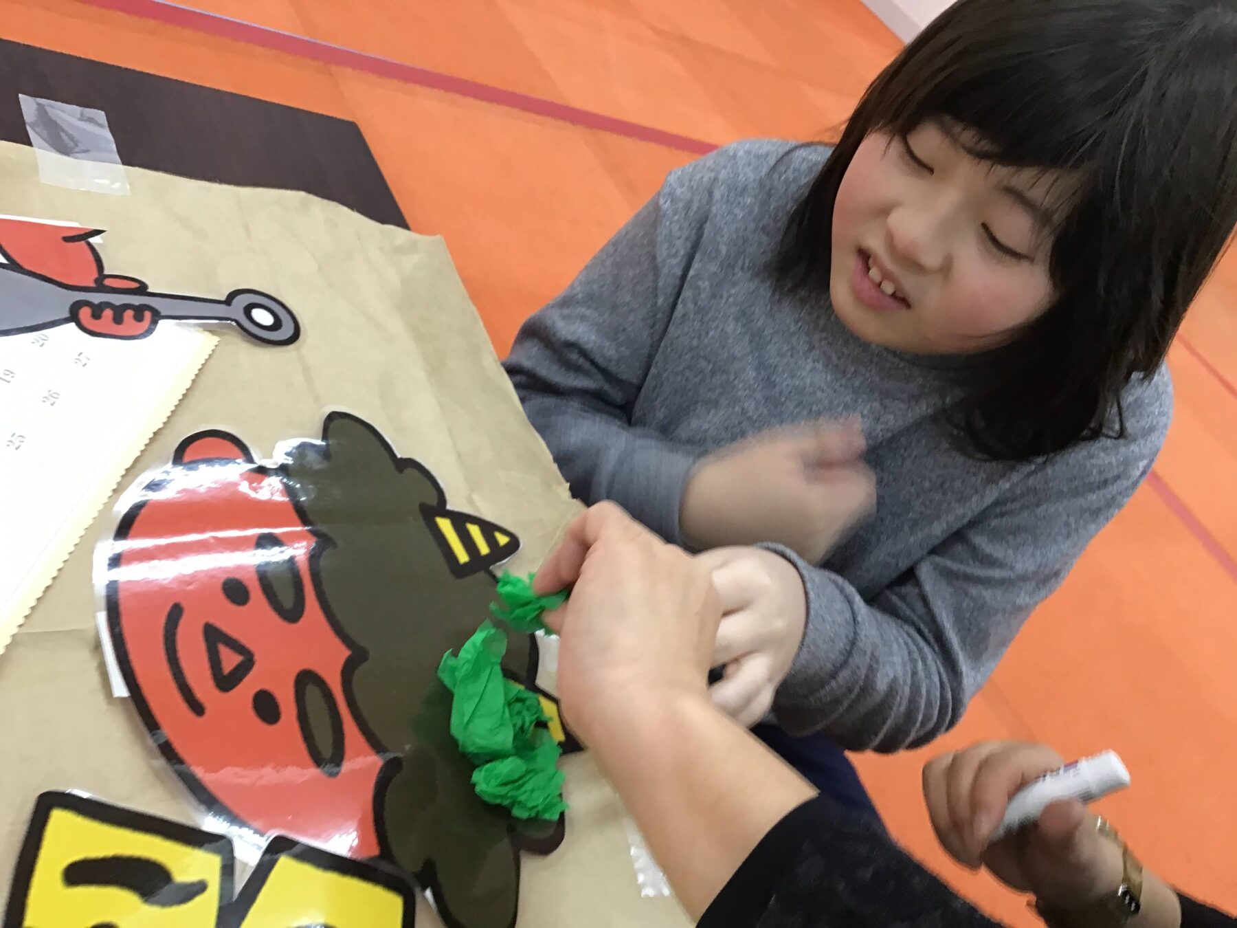 好きな色の、お花紙で鬼の頭や、パンツ、金棒に貼ります🙌🏻🔴🟡🔵🟢