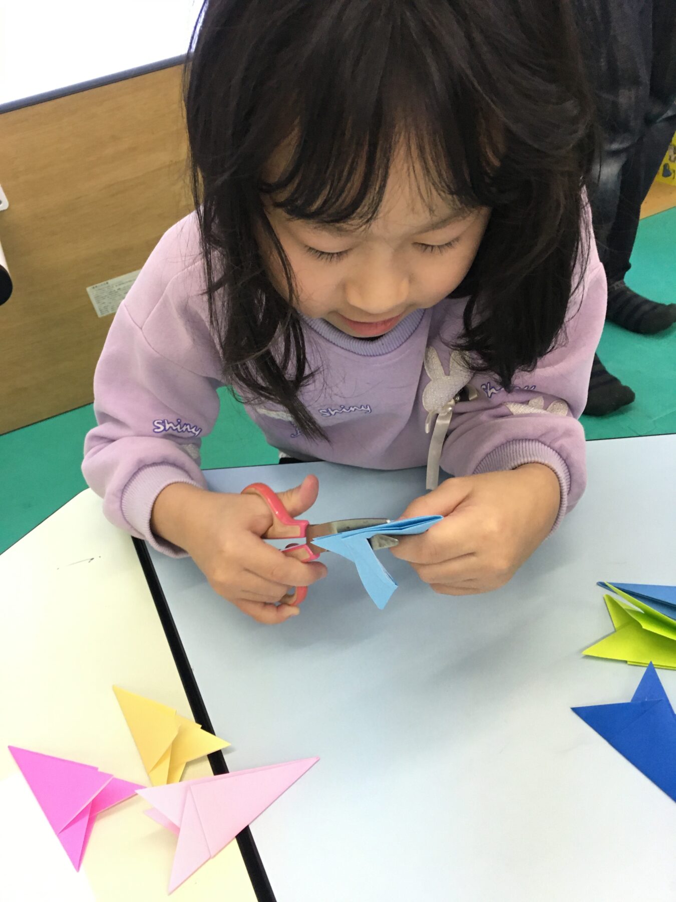 この活動は、ハサミで形を切り出す「手先の巧緻性」や「集中力」を育むというねらいがあります。