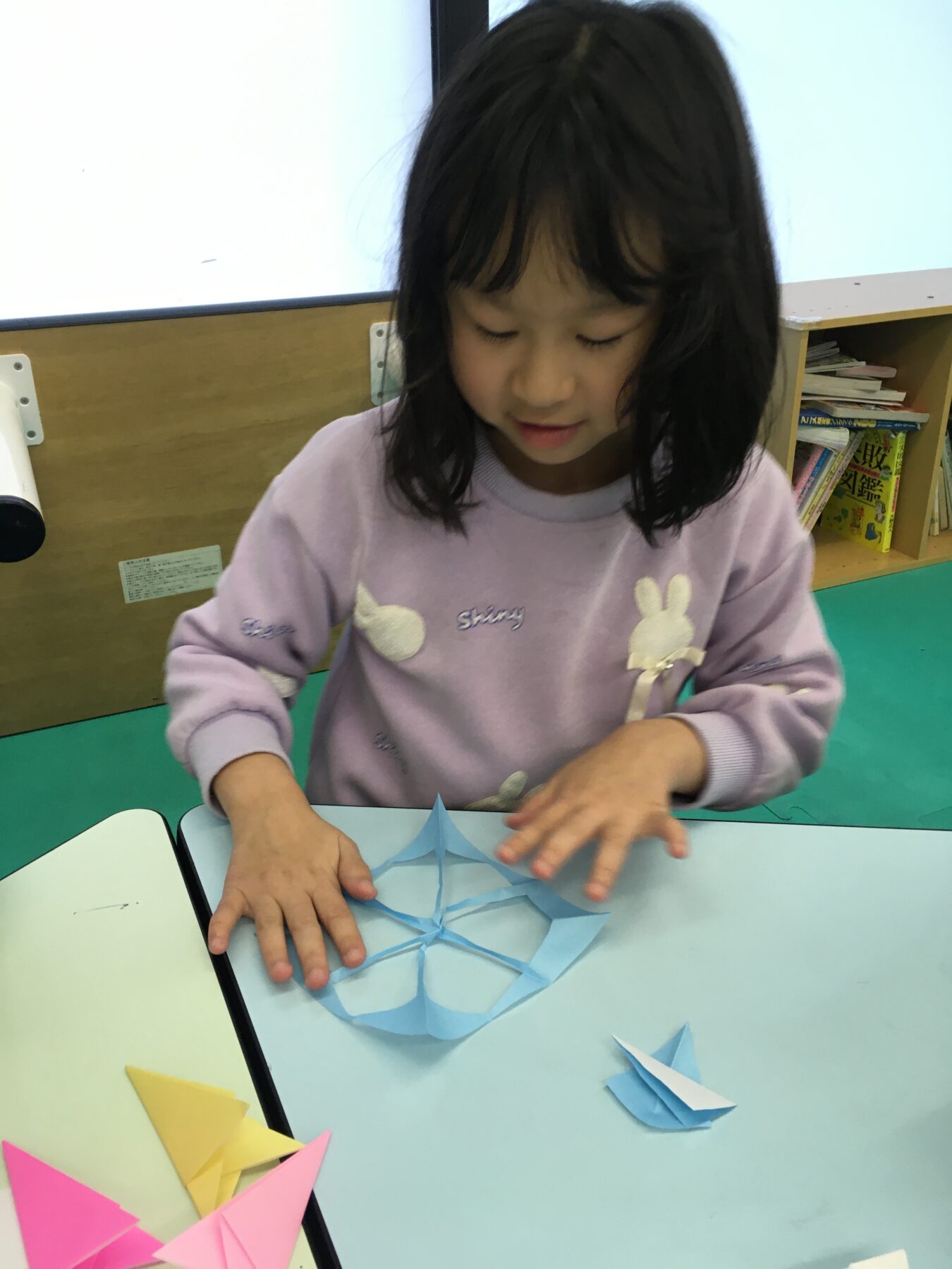 ゆっくりと紙を広げた時にパッと現れる不思議な模様に「わぁ、お花みたい!」と