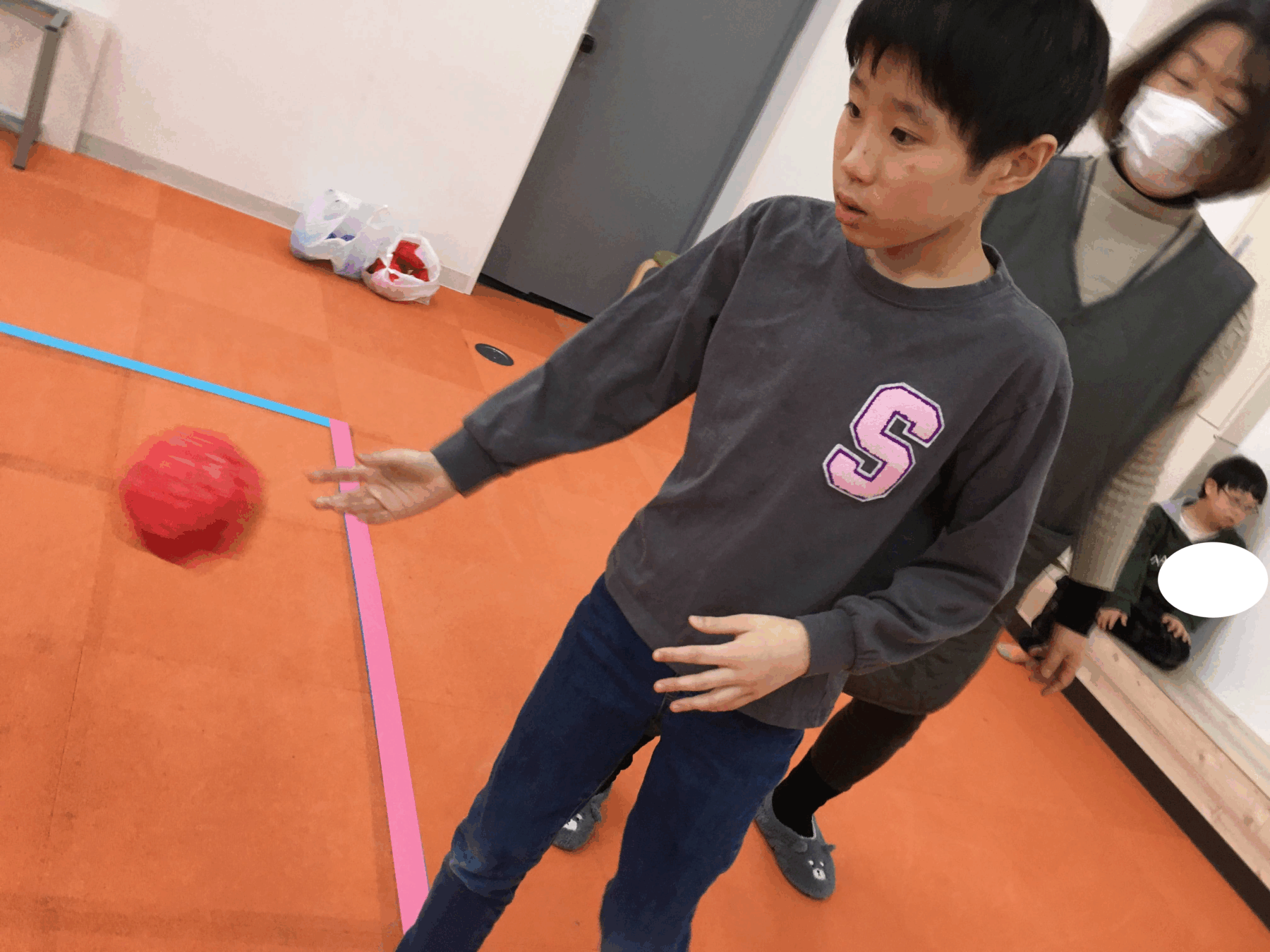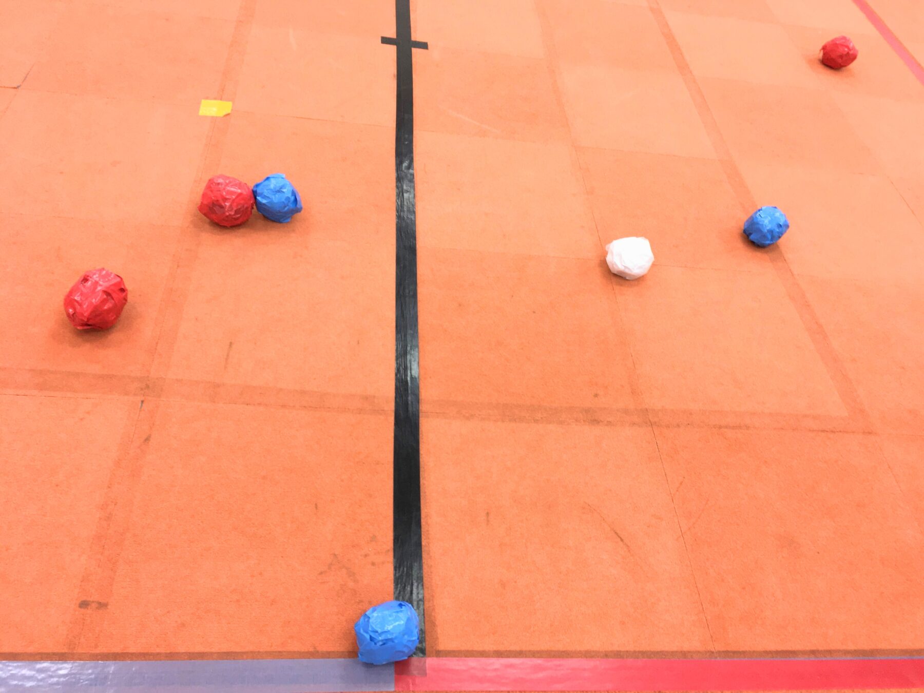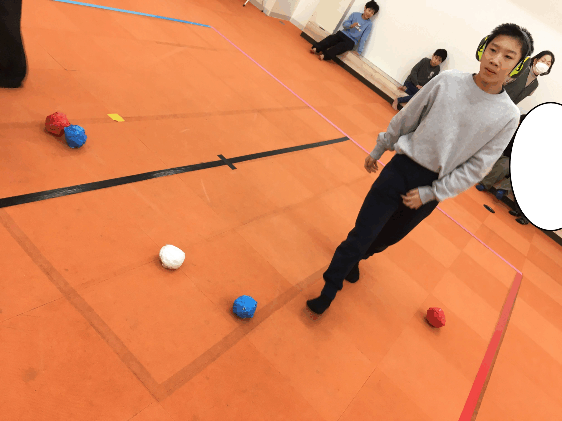 お次は、青い玉チームと、赤い玉チームに分かれて、どちらが白い玉に近く転がせるかの勝負をしました✨