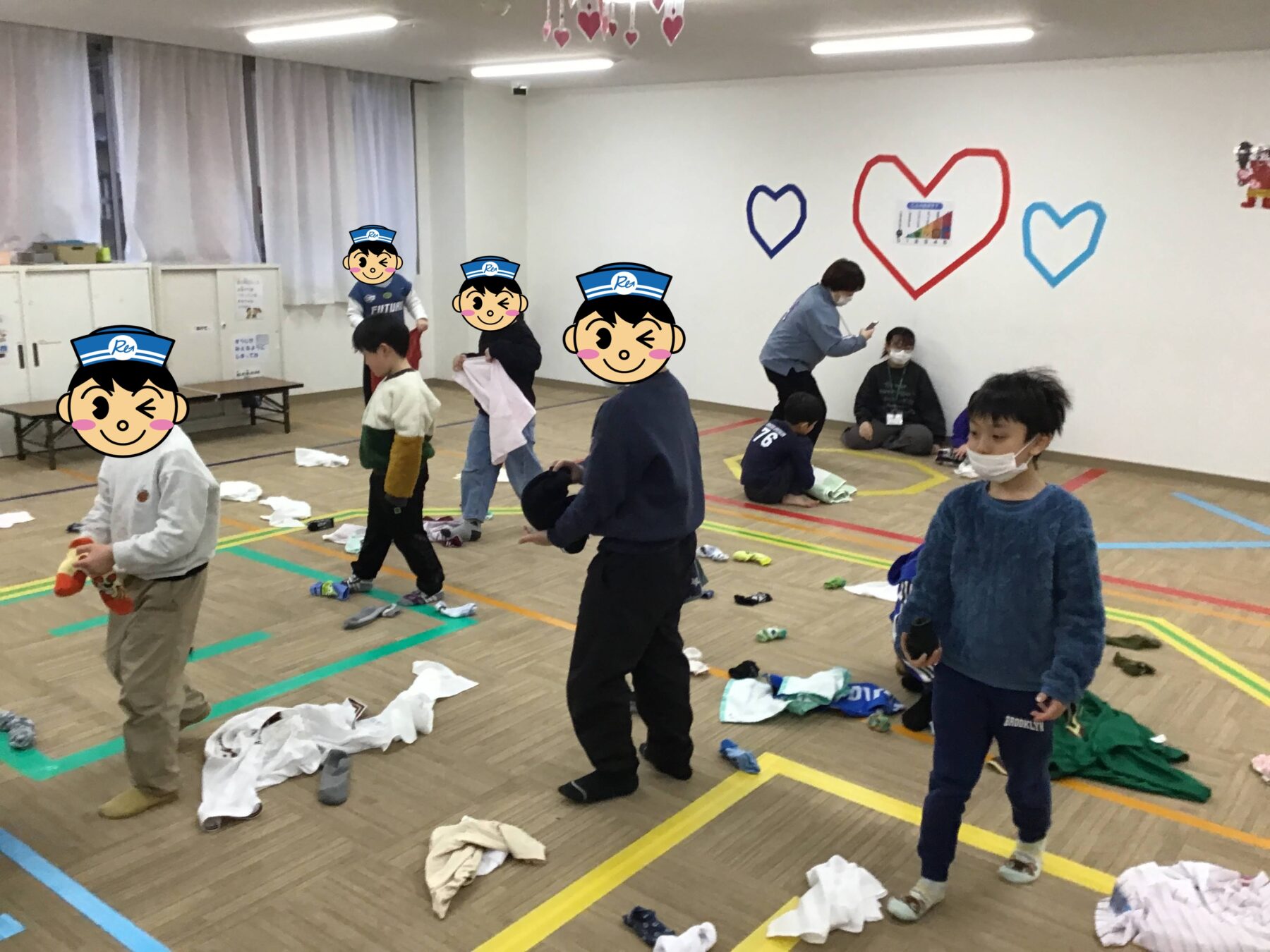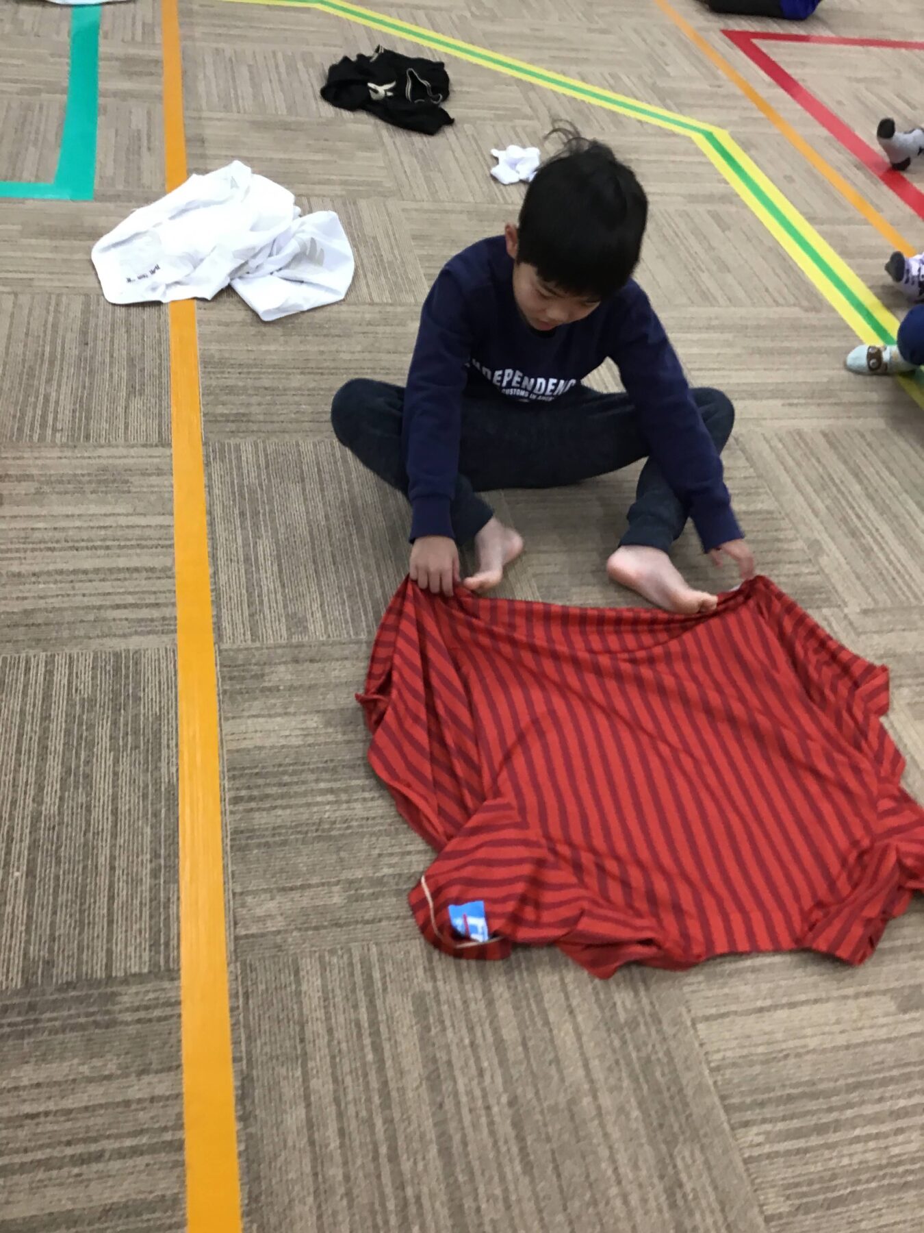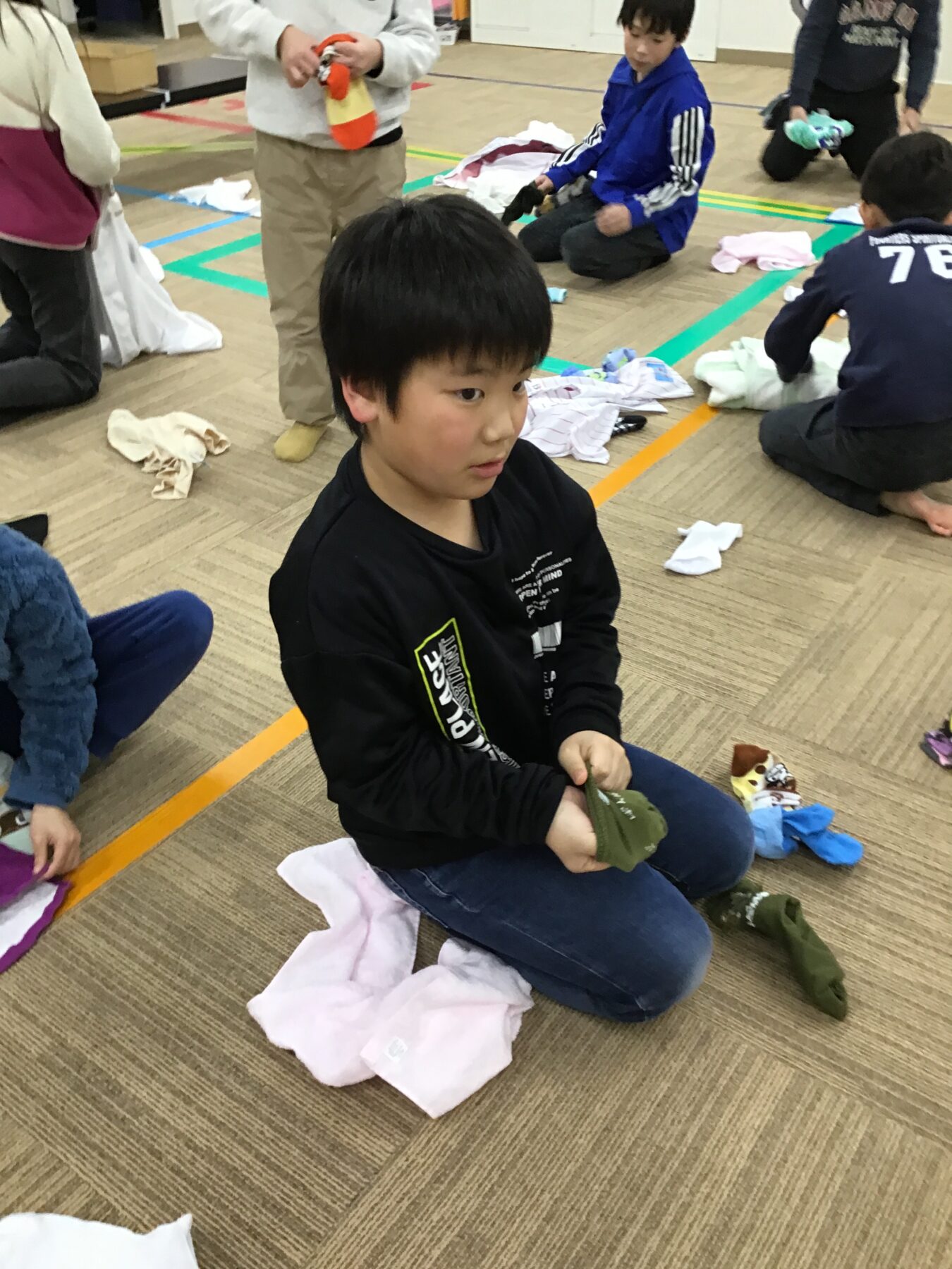 衣服を整理する事や対になった靴下を活動の中(遊びの一環)でそろえることで自然とお手伝いや生活動作に活かせるような取り組みになっております。