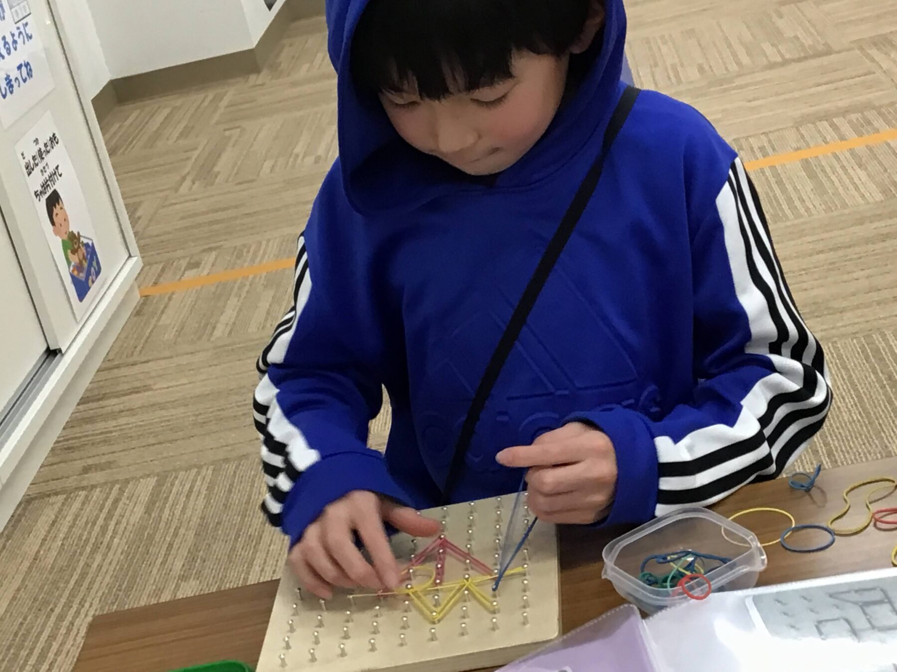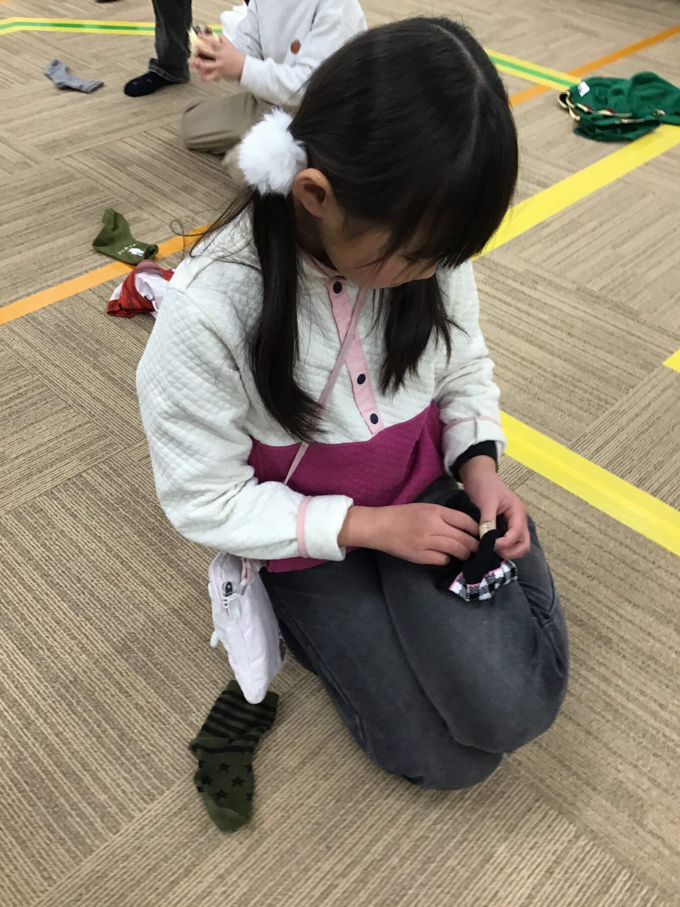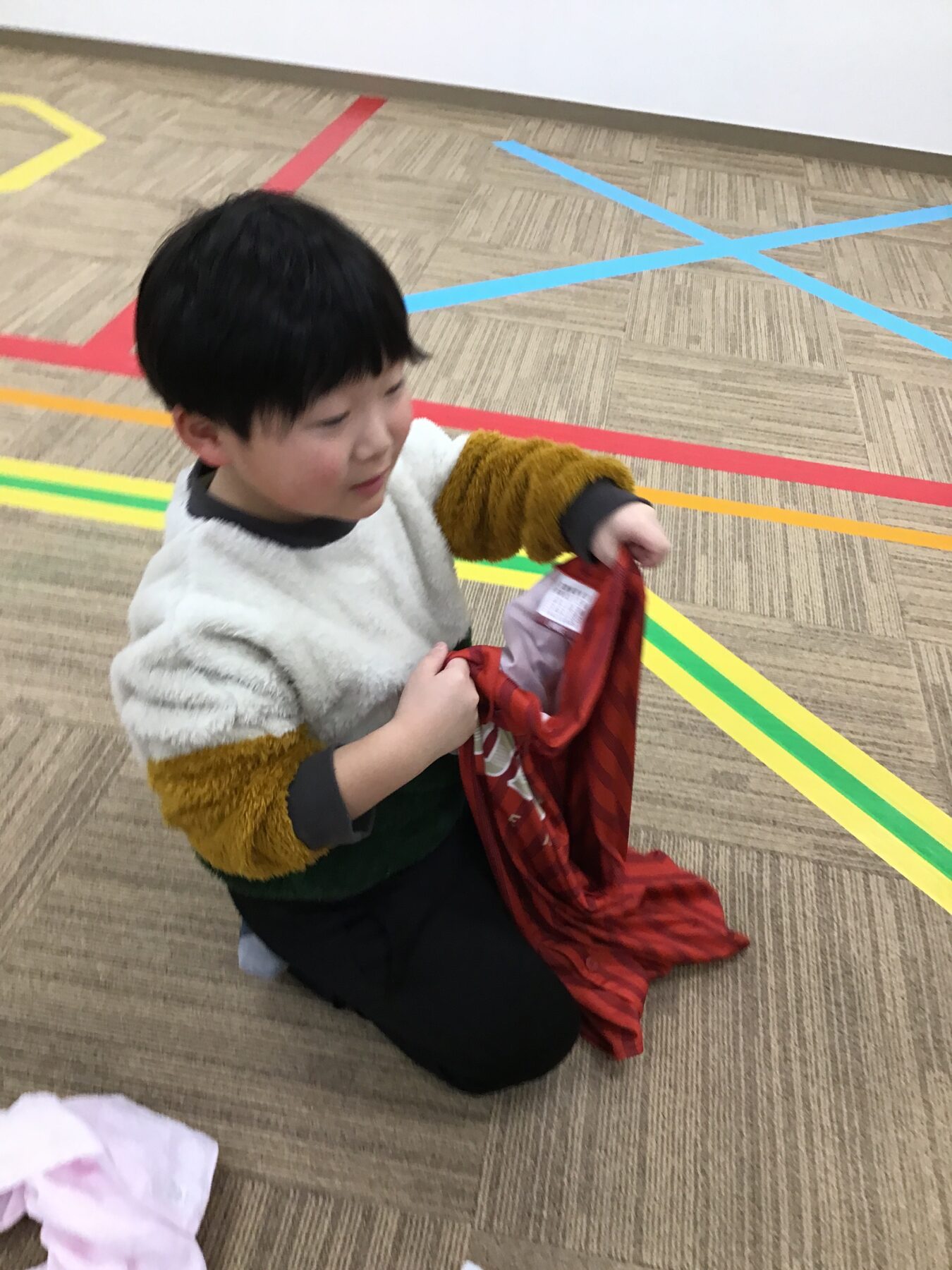 衣服を整理する事や対になった靴下を活動の中(遊びの一環)でそろえることで自然とお手伝いや生活動作に活かせるような取り組みになっております。
